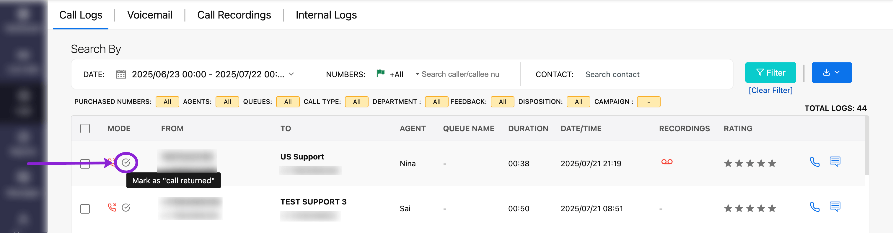 For missed calls, you can mark them as Call Returned. To do this, select the designated icon, as shown in the screenshot. This helps specifically for a queue call tracking whether an agent has already followed up on a missed call, preventing multiple agents from calling back the same number.