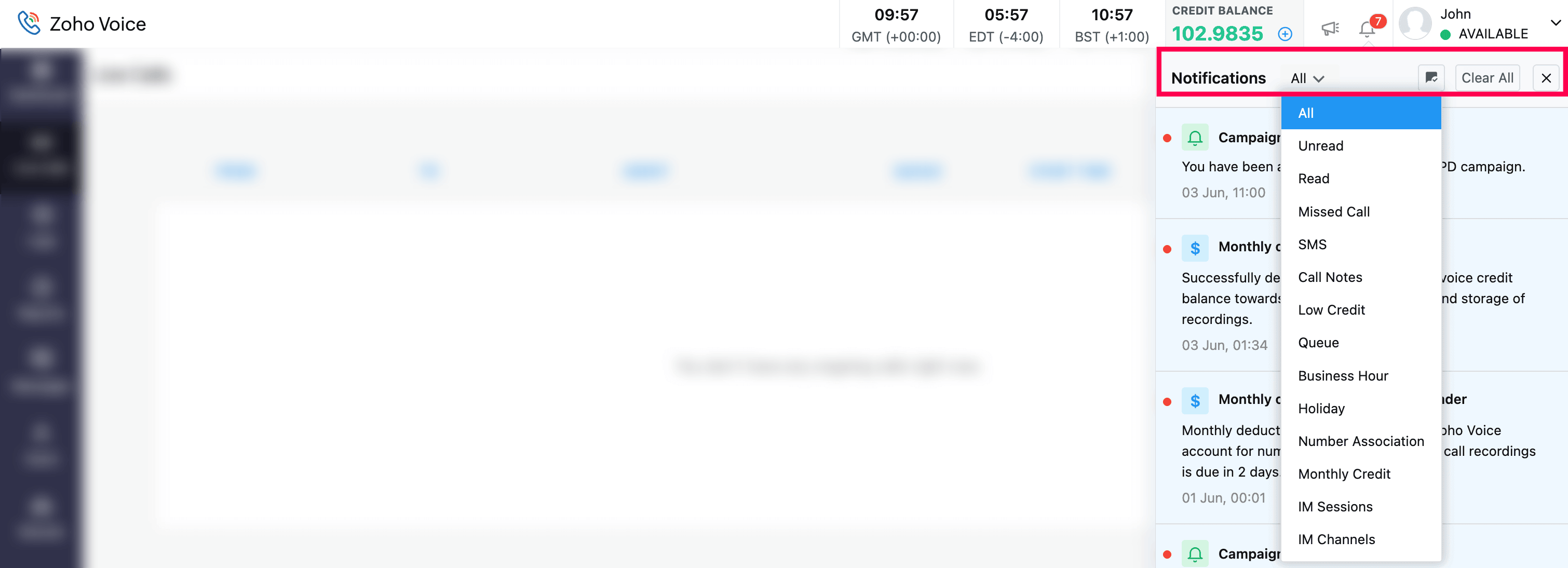 - From the dropdown, select the specific notifications you want to view, such as missed calls, business hours, low credit alerts, and more.