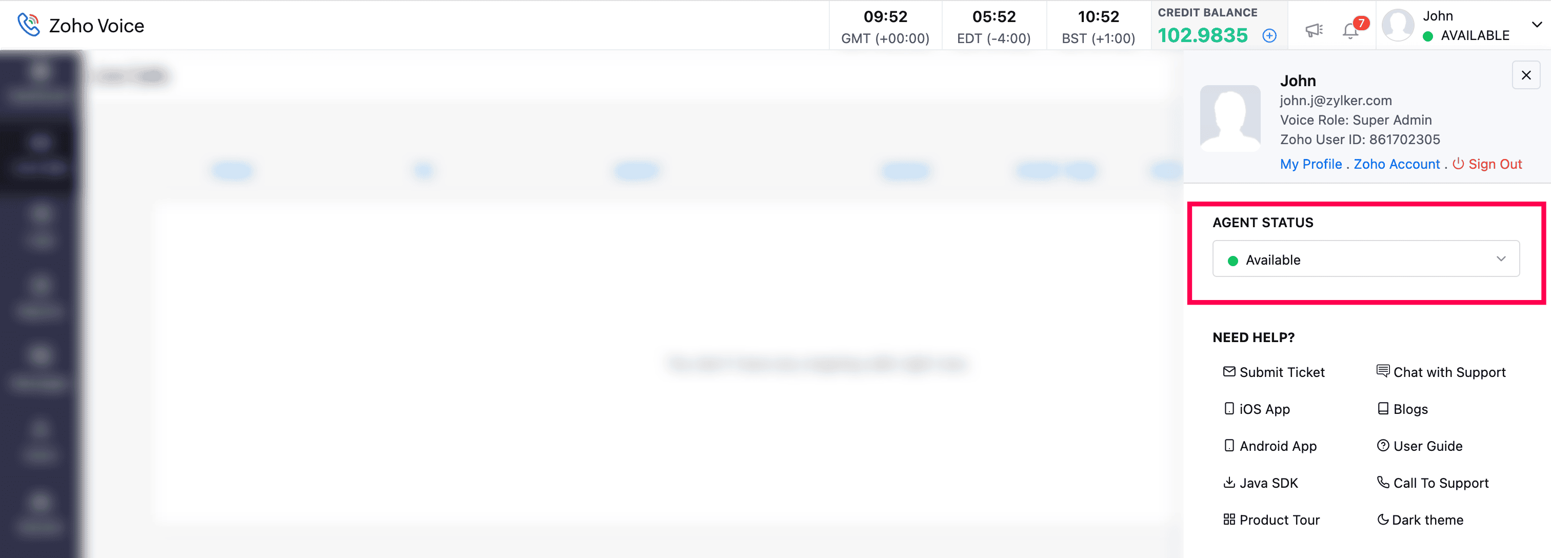 - In your Zoho Voice account, click on your User Profile in the top-right corner.