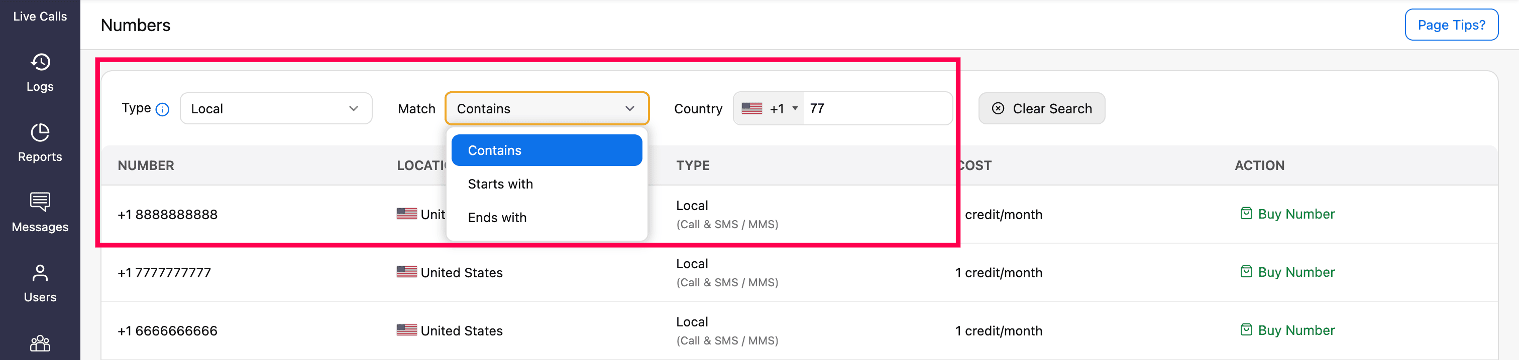 You may choose to filter numbers by type and specify whether they should contain, start with, or end with the country code and the number entered in the Country field. Then click Search to view any available matching numbers.