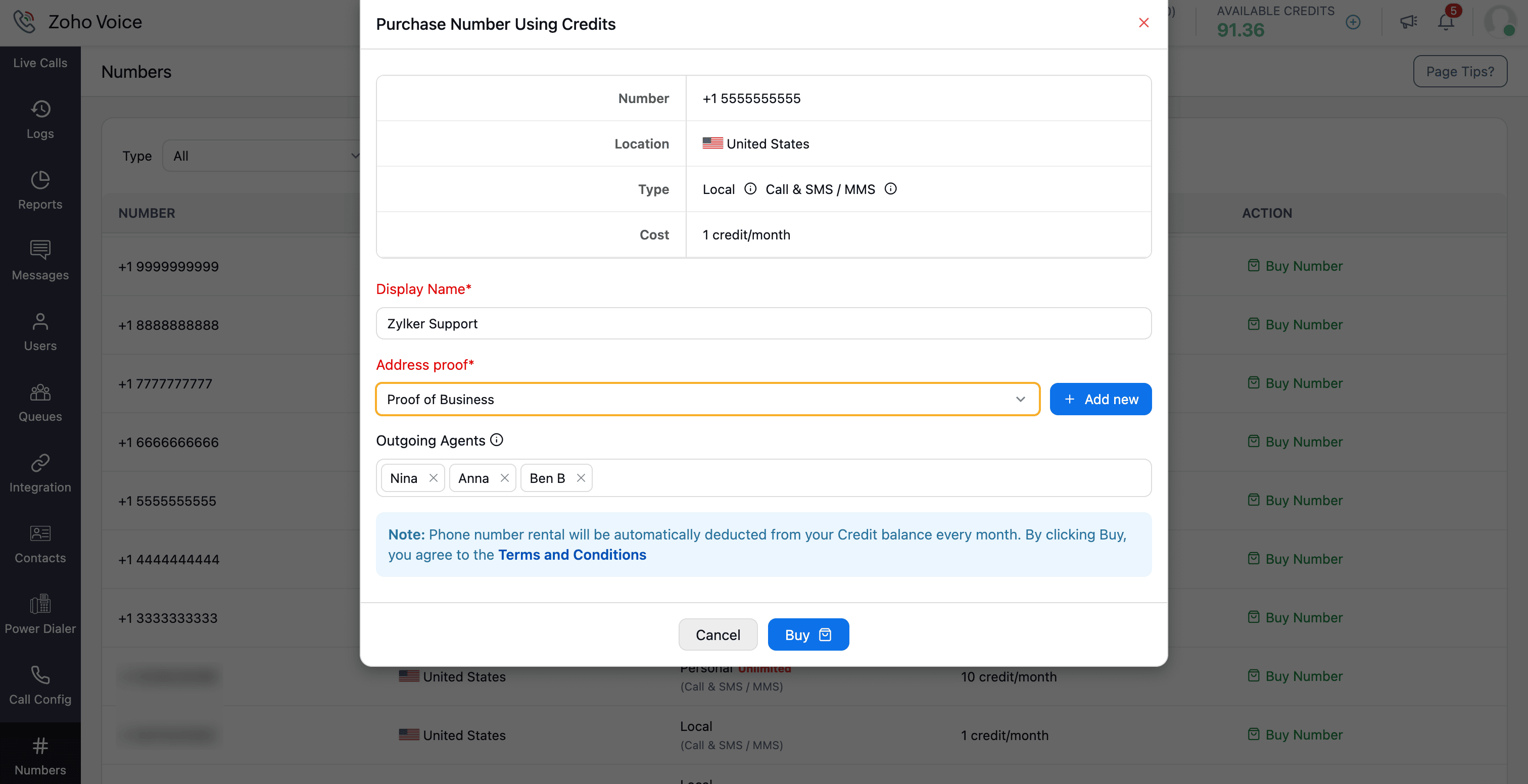Number rental will be automatically deducted from your credit balance every month. By clicking Buy, you agree to the Terms and Conditions.