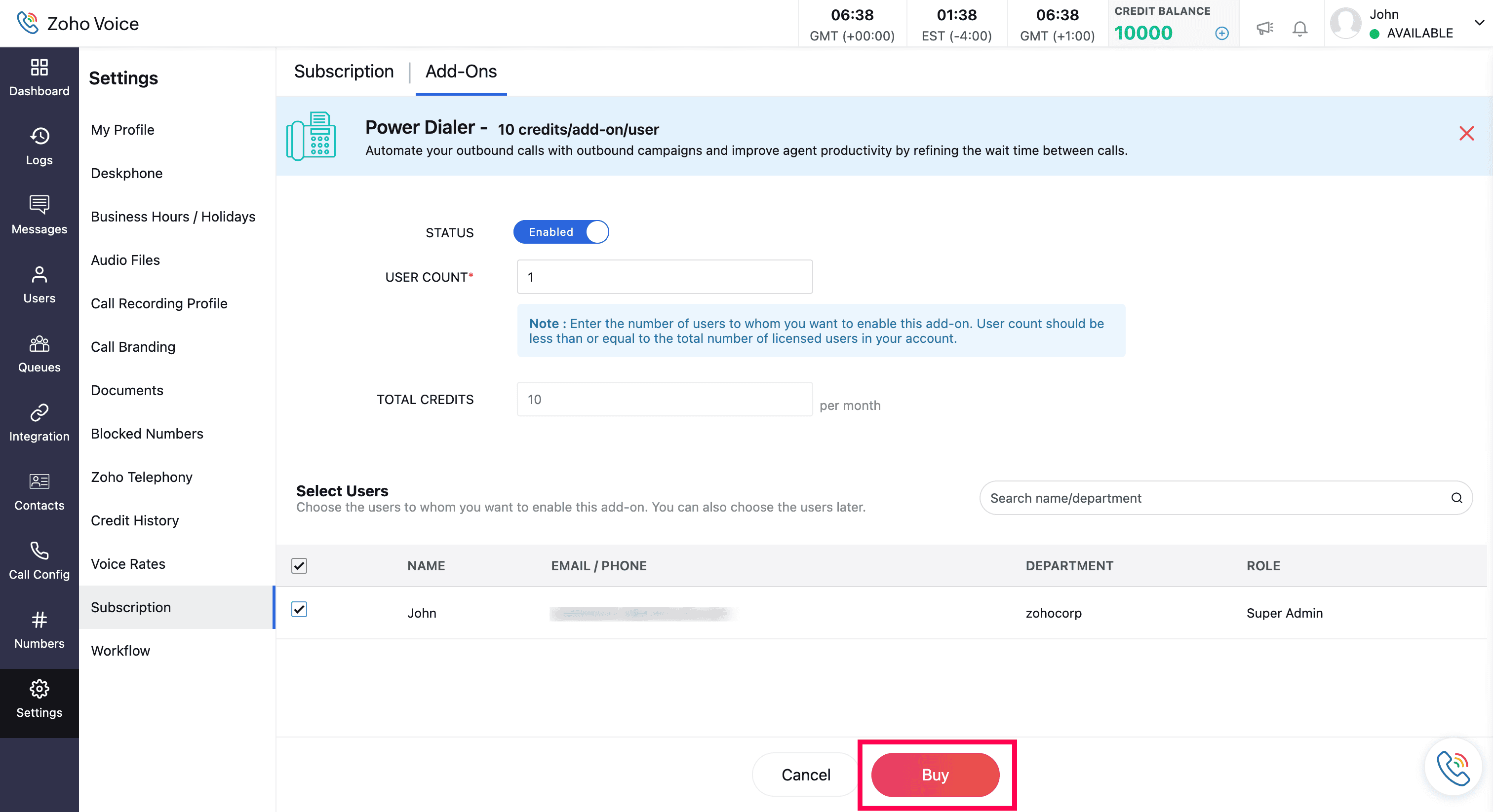 In Zoho Voice, feature add-ons provide extra features that are not part of your current plan but can be purchased based on your specific needs.