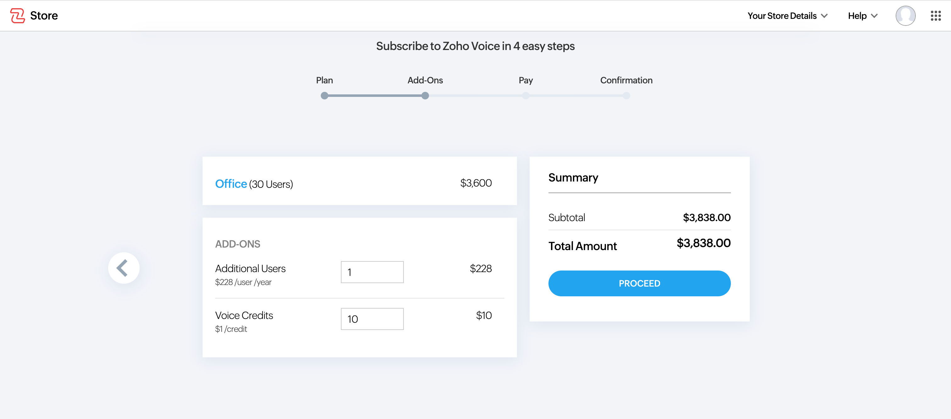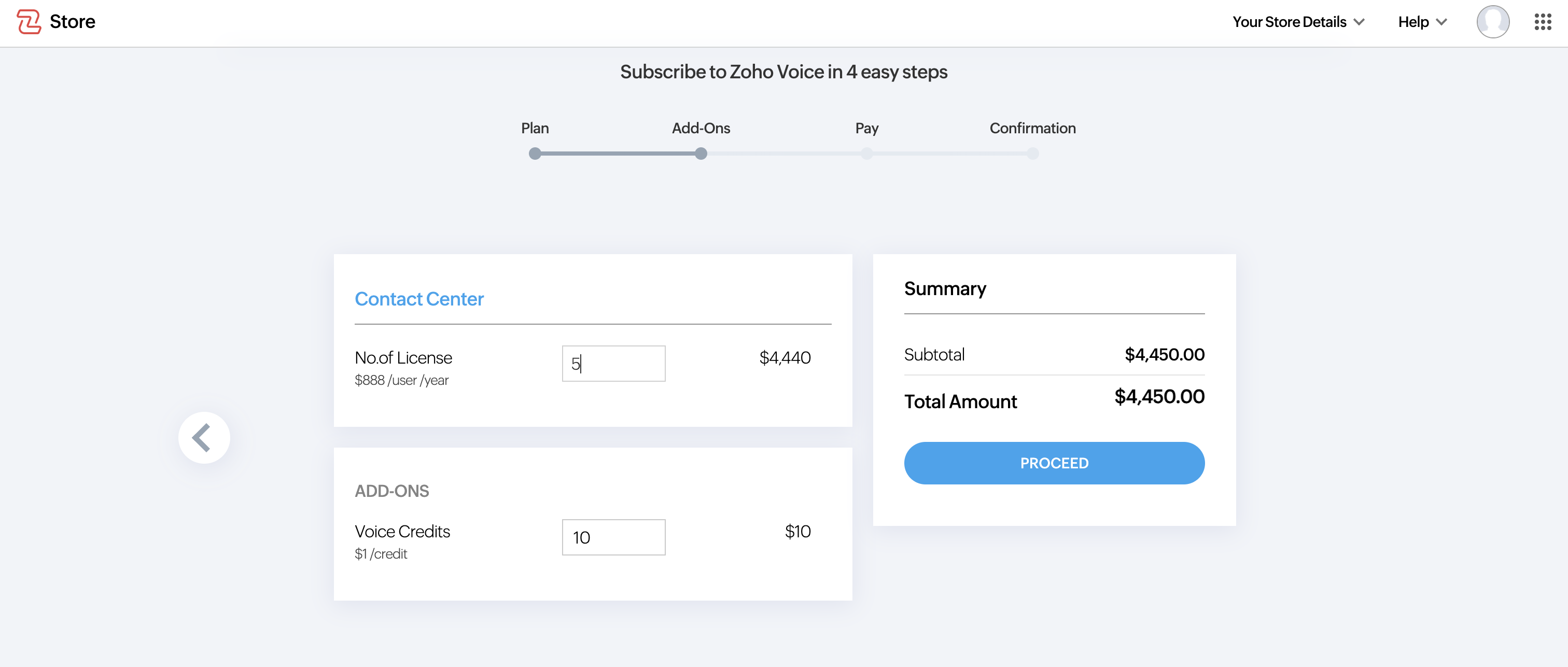- Enter add-ons that you like to purchase, then click Proceed. You can purchase voice credits, if needed.