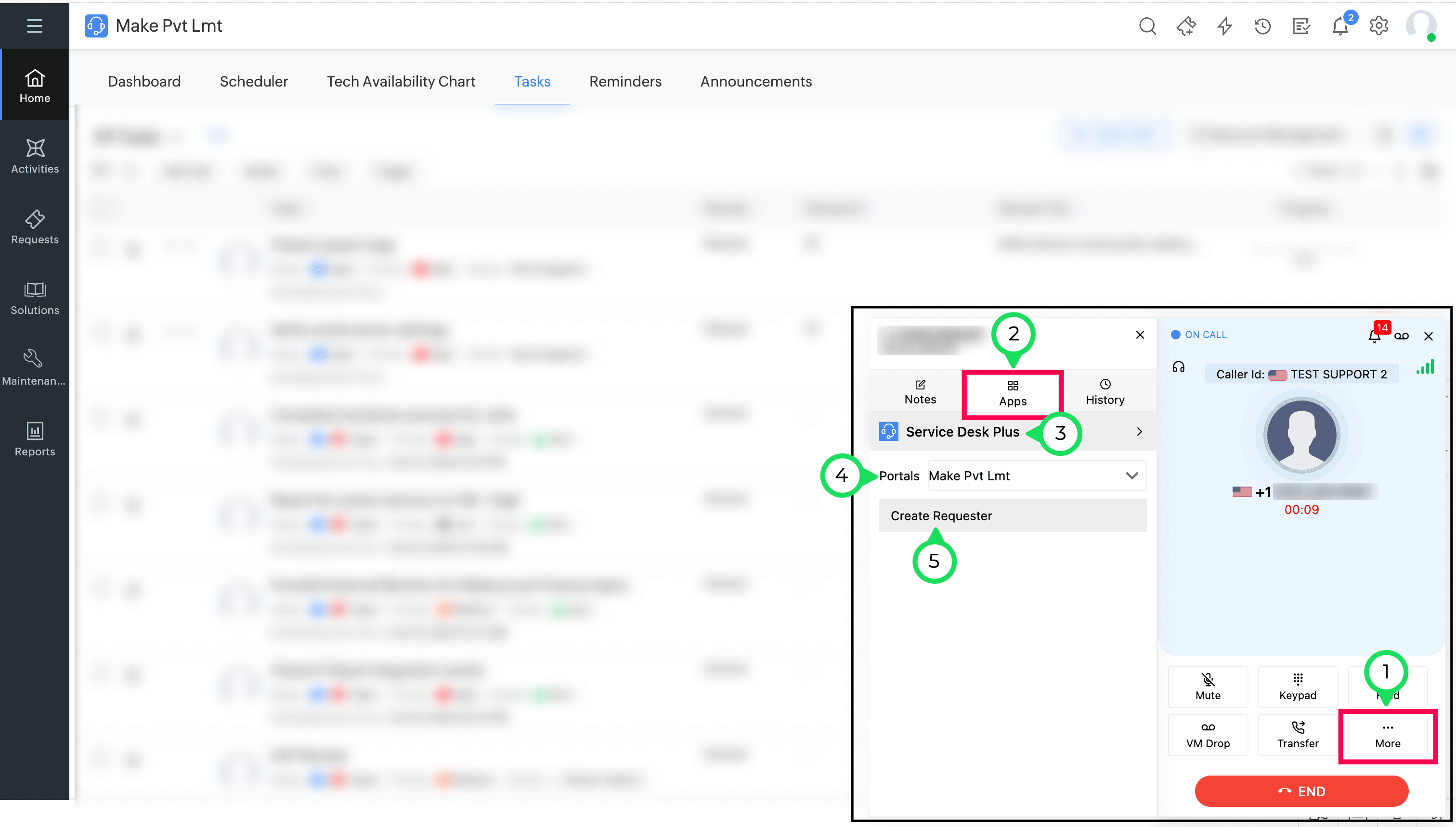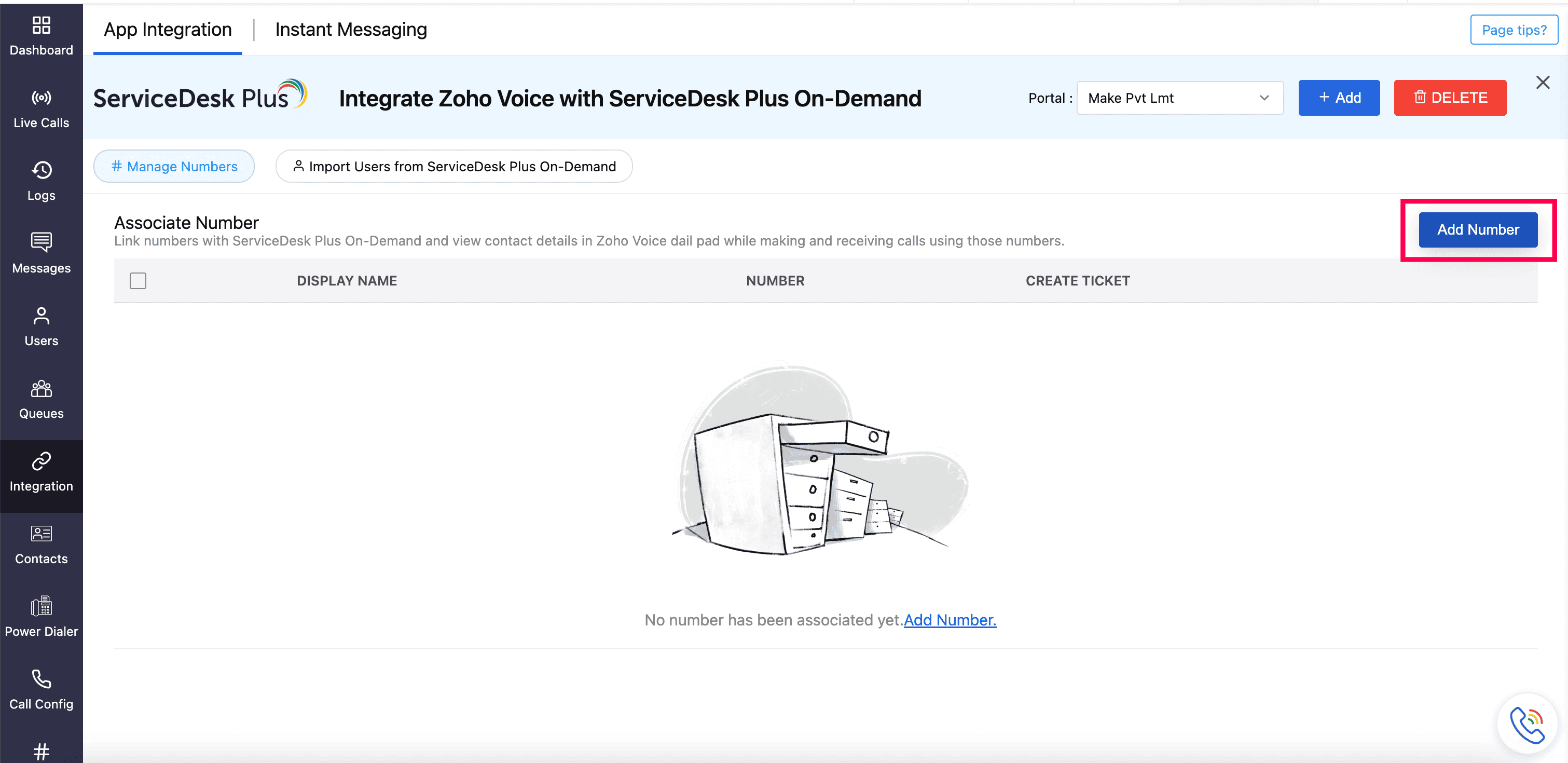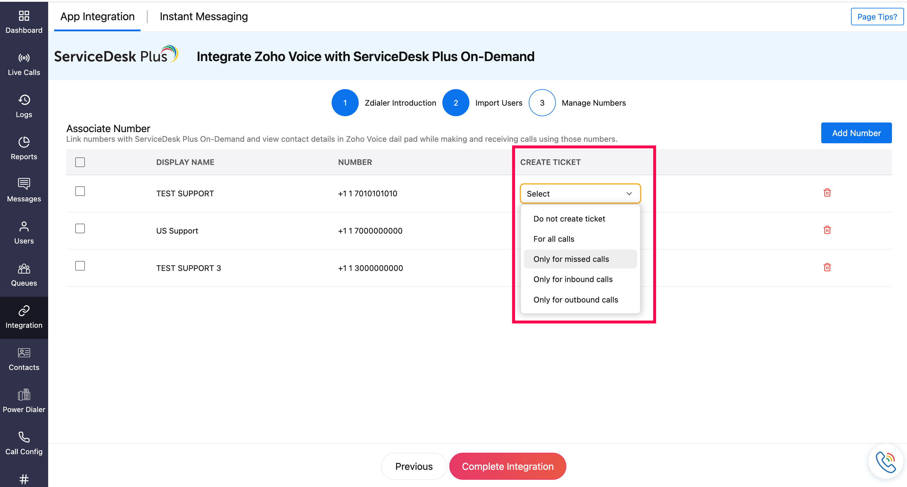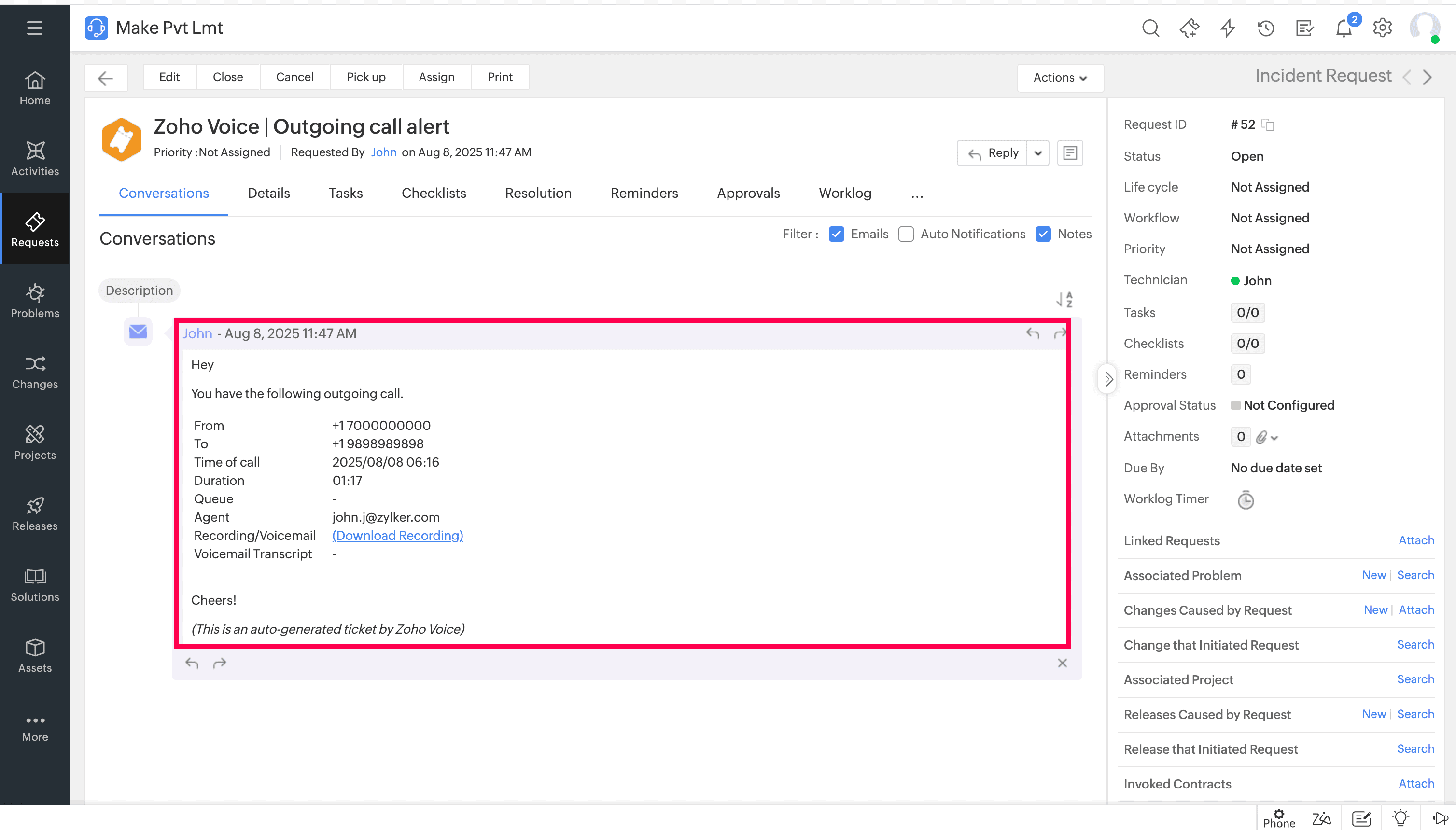 The native integration between ServiceDesk Plus On-Demand and Zoho Voice allows users to make and receive calls using the Zoho Voice web or mobile apps, with automatic contact lookup for known numbers. You can also configure the system to automatically create tickets for incoming calls based on the caller’s number.