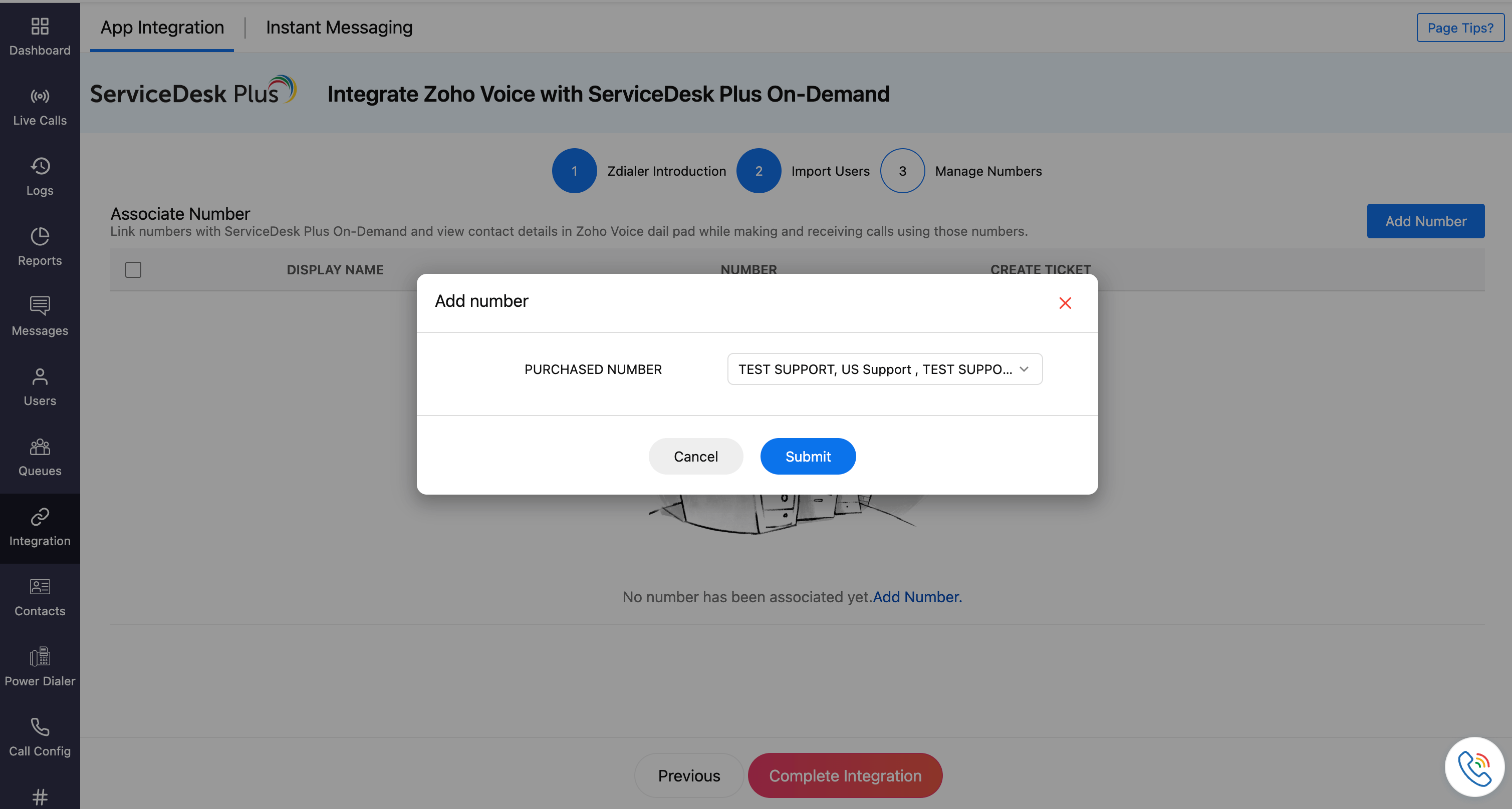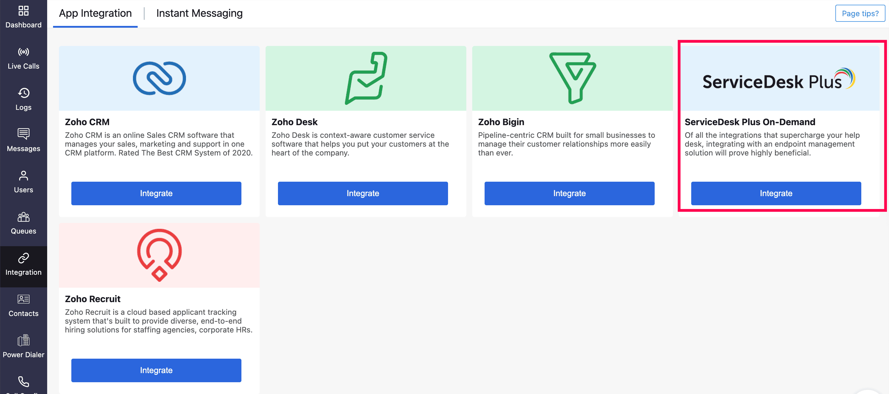Go to the Integration module, and click Integrate of ServiceDesk Plus On-Demand.