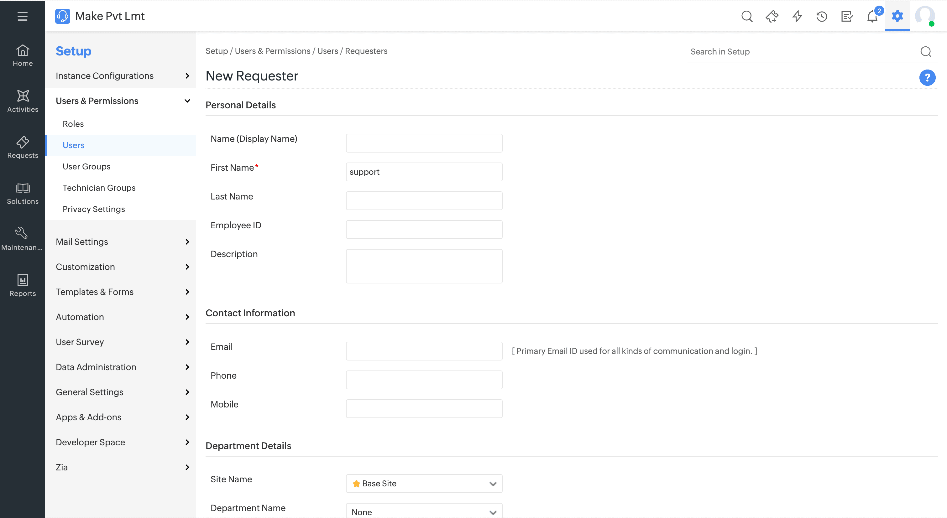 Any requester you create here will be saved and listed under the Users module in your ServiceDesk Plus account.