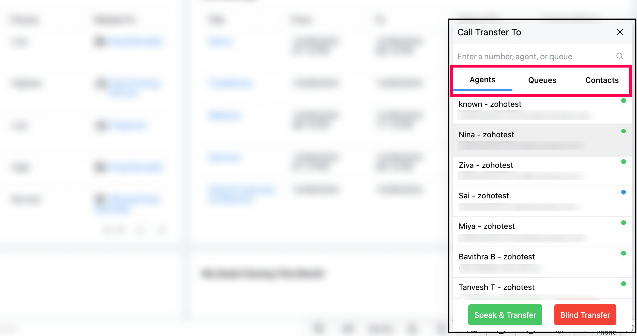 With Speak & Transfer, you can speak with the agent to whom the call is transferred, and with Blind Transfer, the call is just being transferred without the need to communicate with the transfer agent.