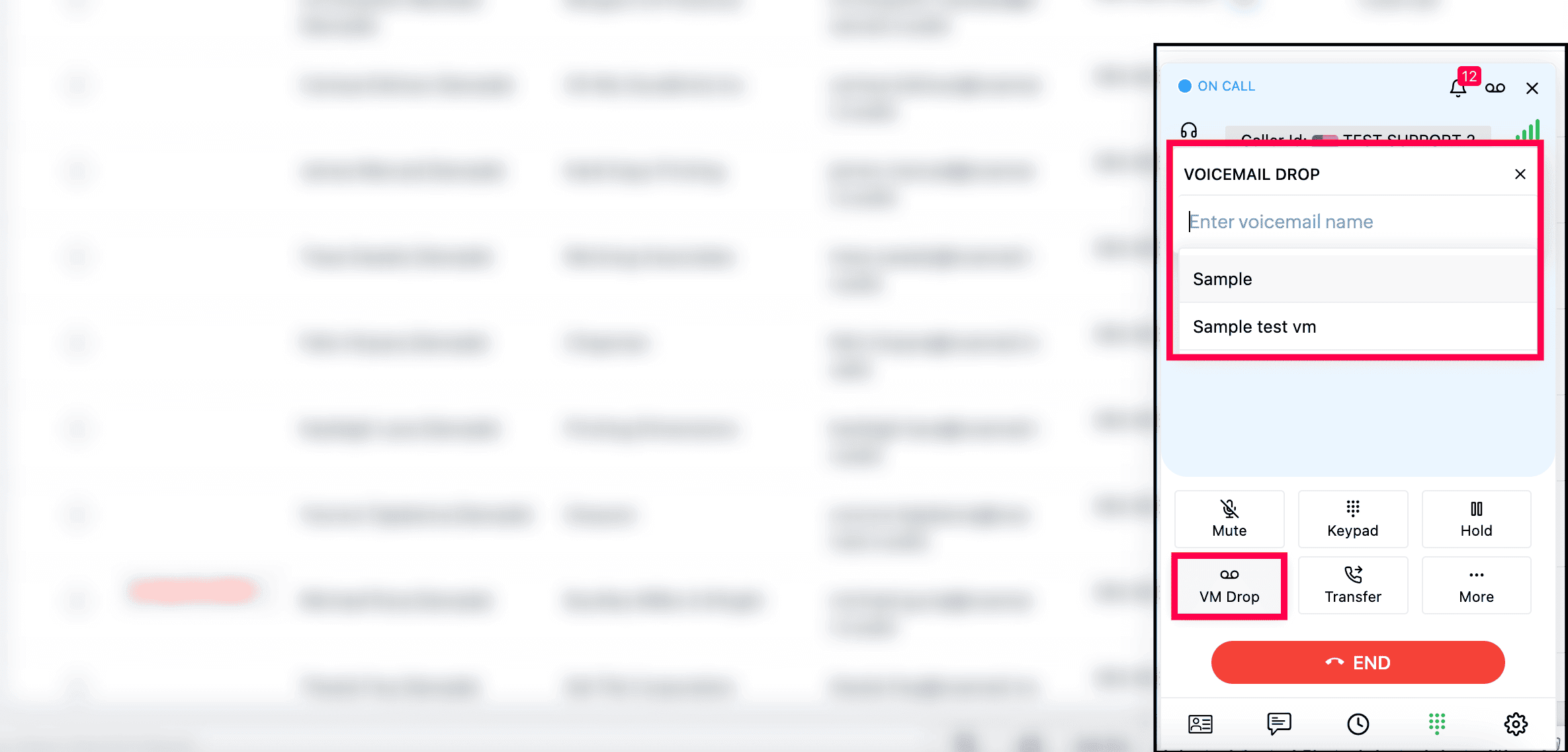 The agent can drop the pre-uploaded voice mail in a single click while/after call ringing.