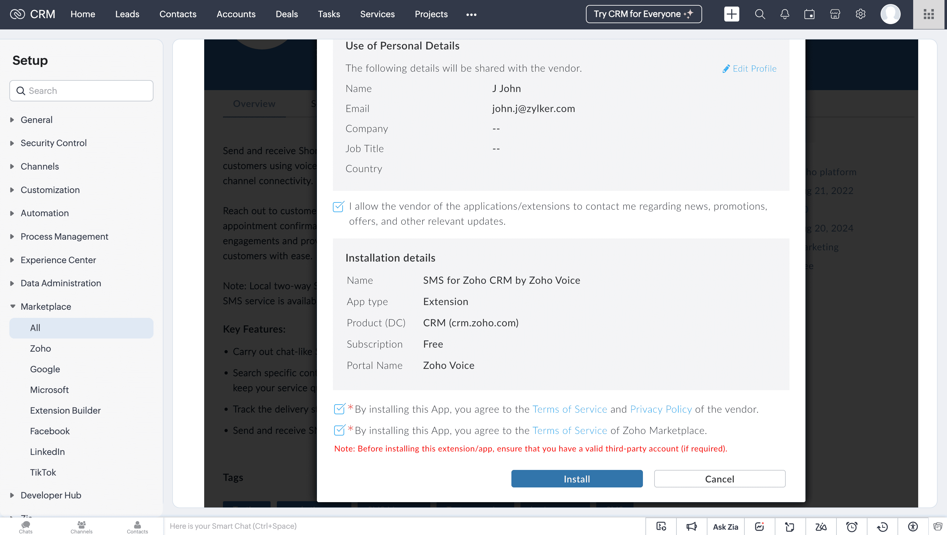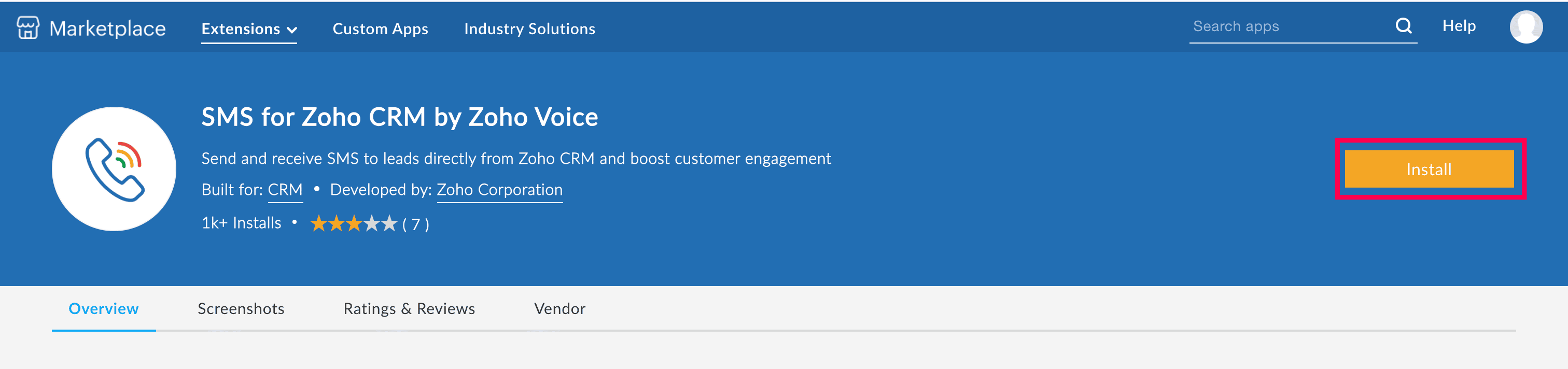 Search for SMS for Zoho CRM by Zoho Voice and click Install.