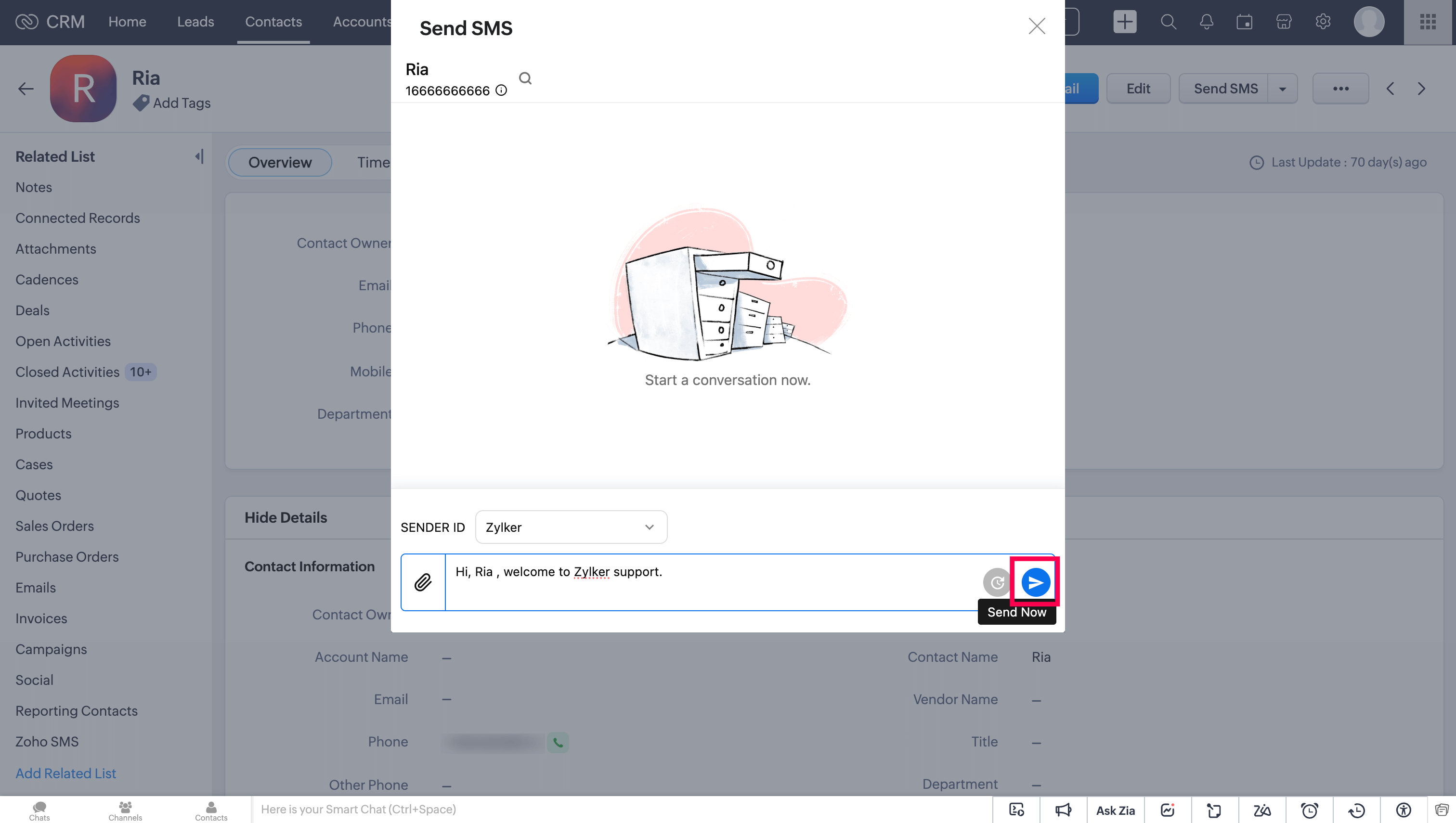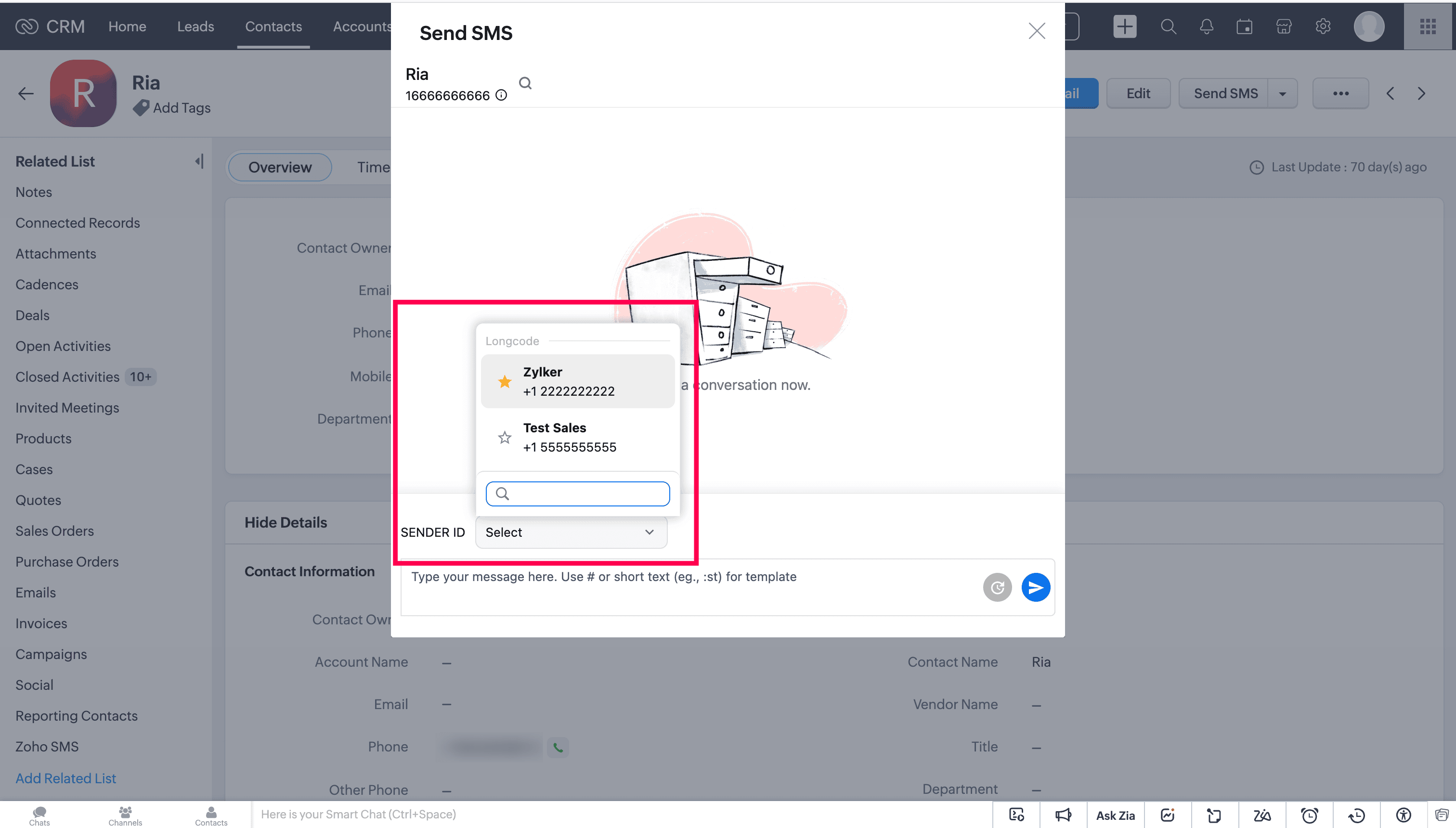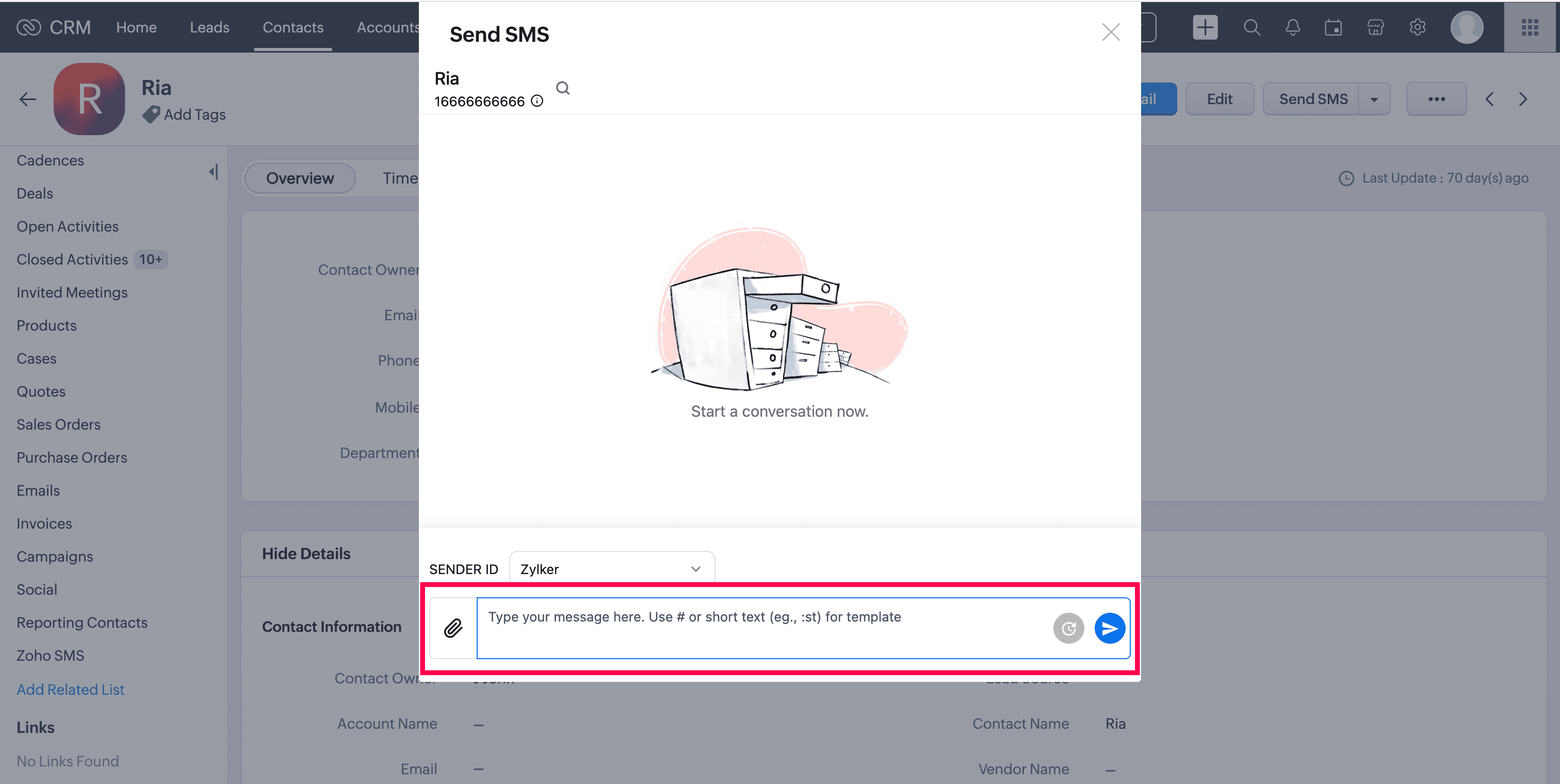 To start sending SMS/MMS messages directly from Zoho CRM, you need to install the SMS for Zoho CRM by Zoho Voice extension.