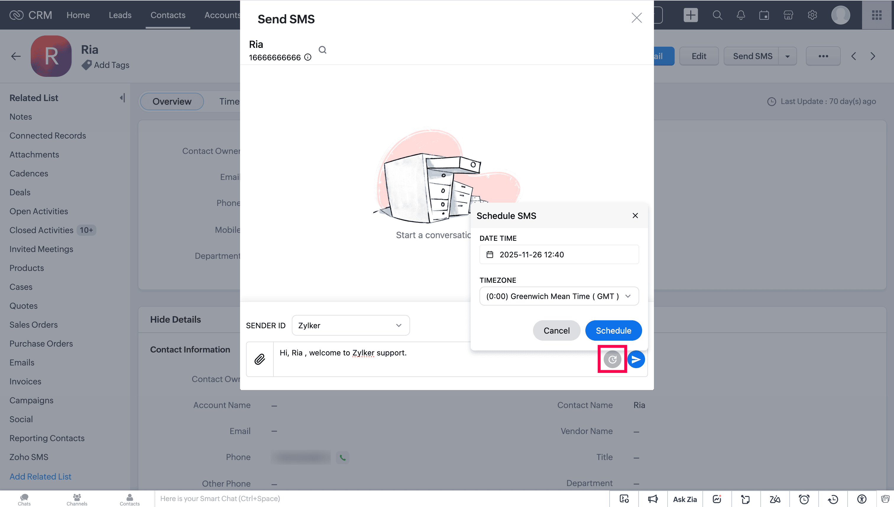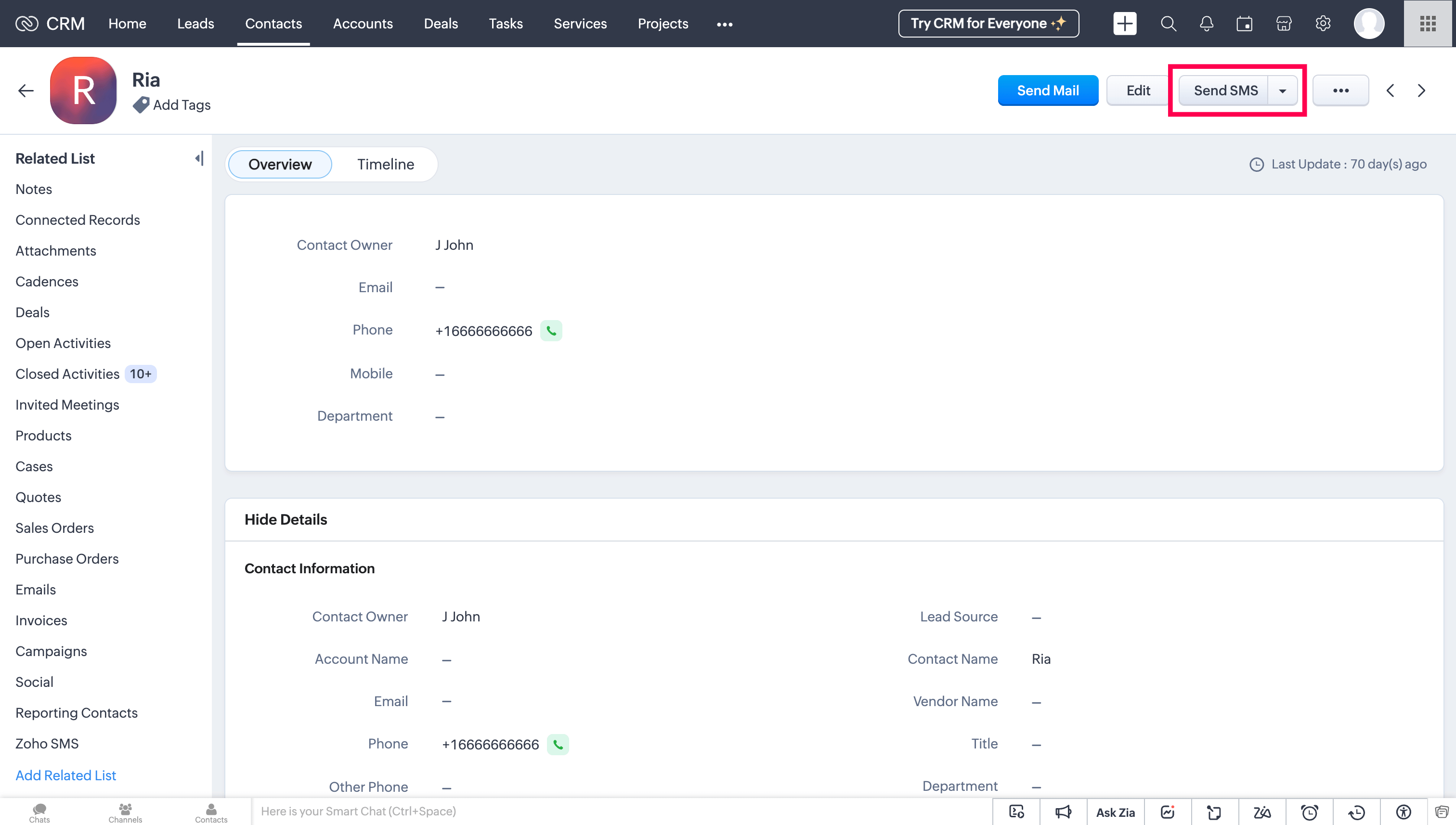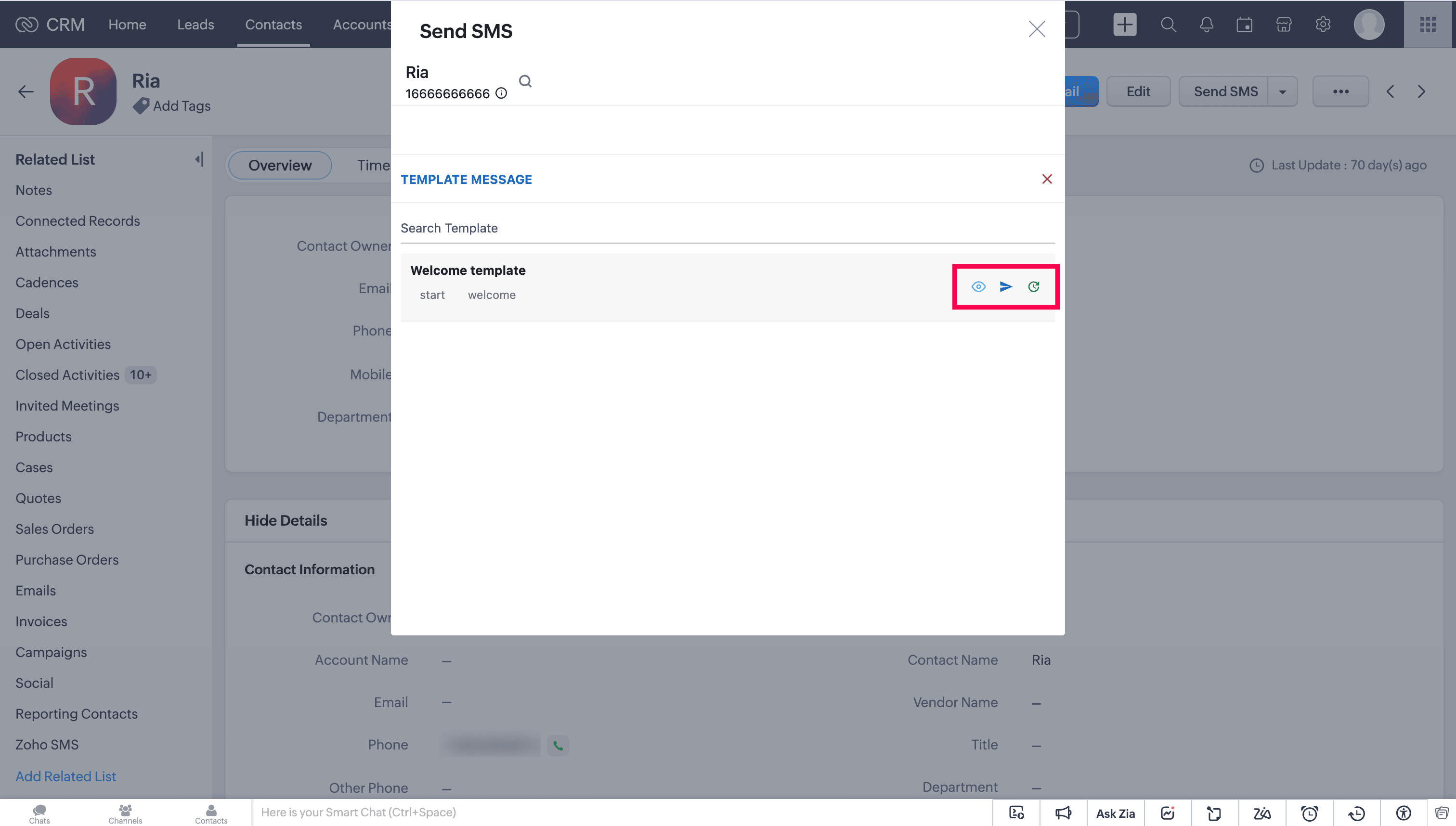 Alternatively, go to the Related List on the left side and select Zoho SMS.