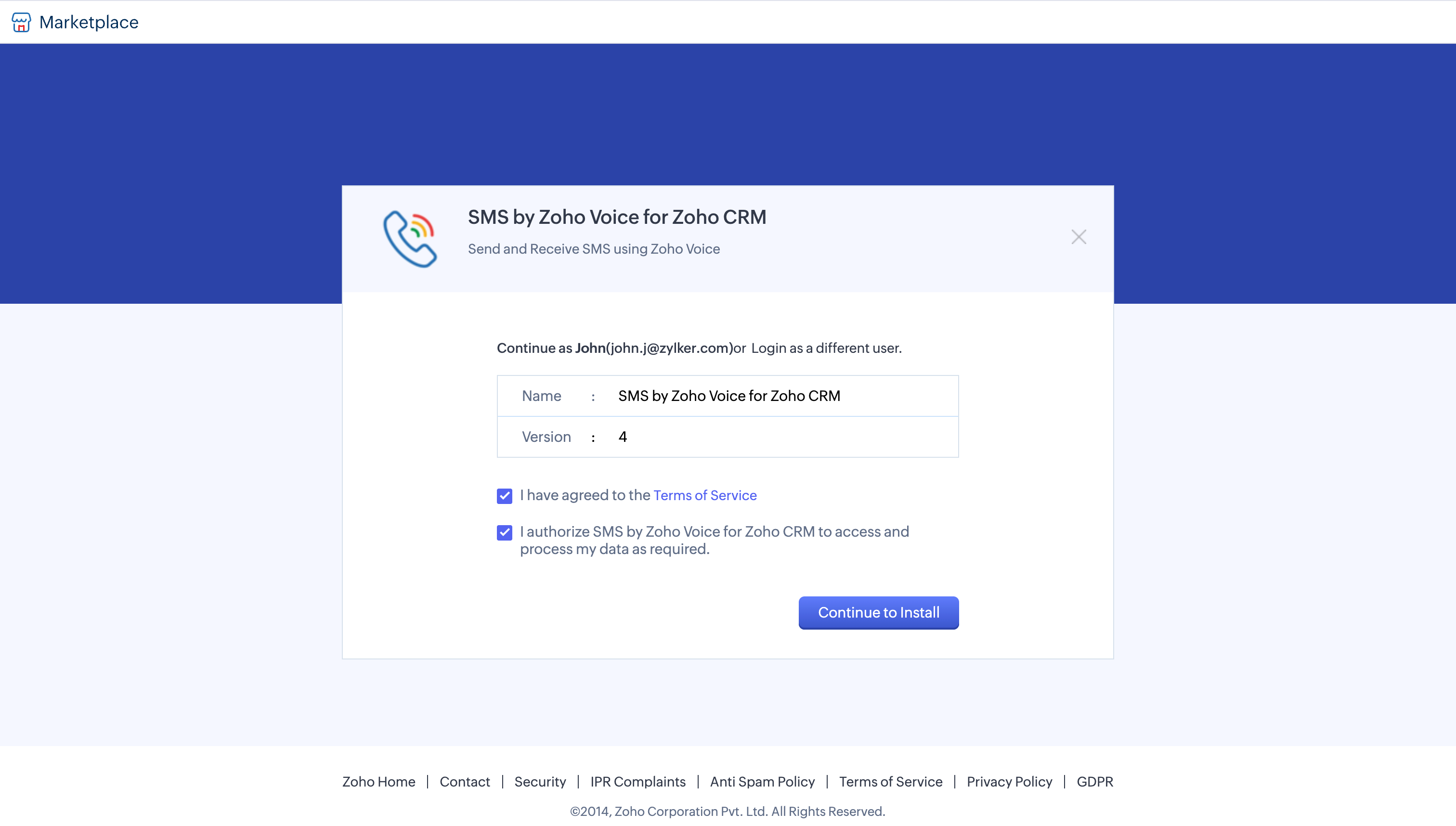 Installing the SMS for Zoho CRM by Zoho Voice extension