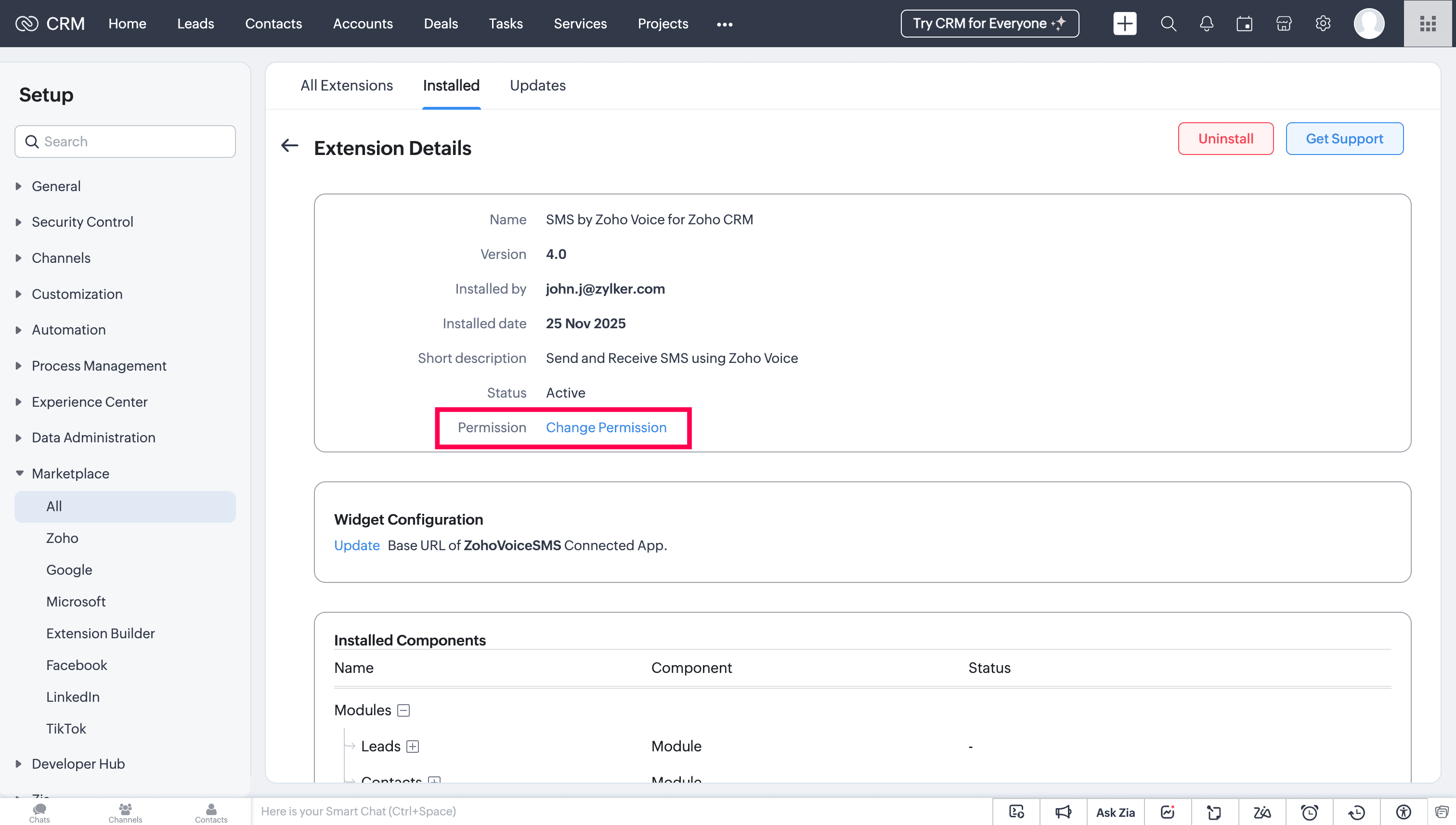 You can change the permission by navigating to Marketplace → Installed and clicking Configure of SMS for Zoho CRM by Zoho Voice. In the extension details page, click on Change Permission and make necessary changes.