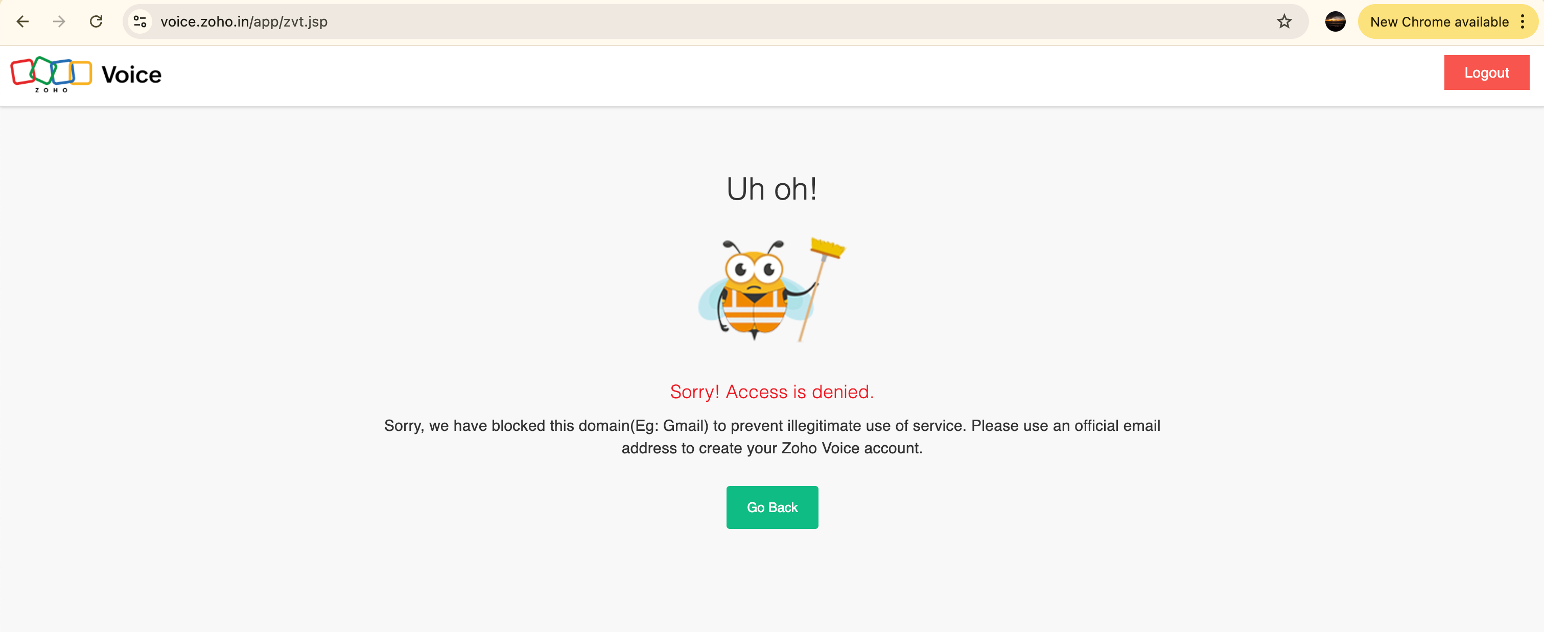 For users encountering an Access denied message like the one shown in the screenshot below, kindly contact our support (support@zohovoice.com).