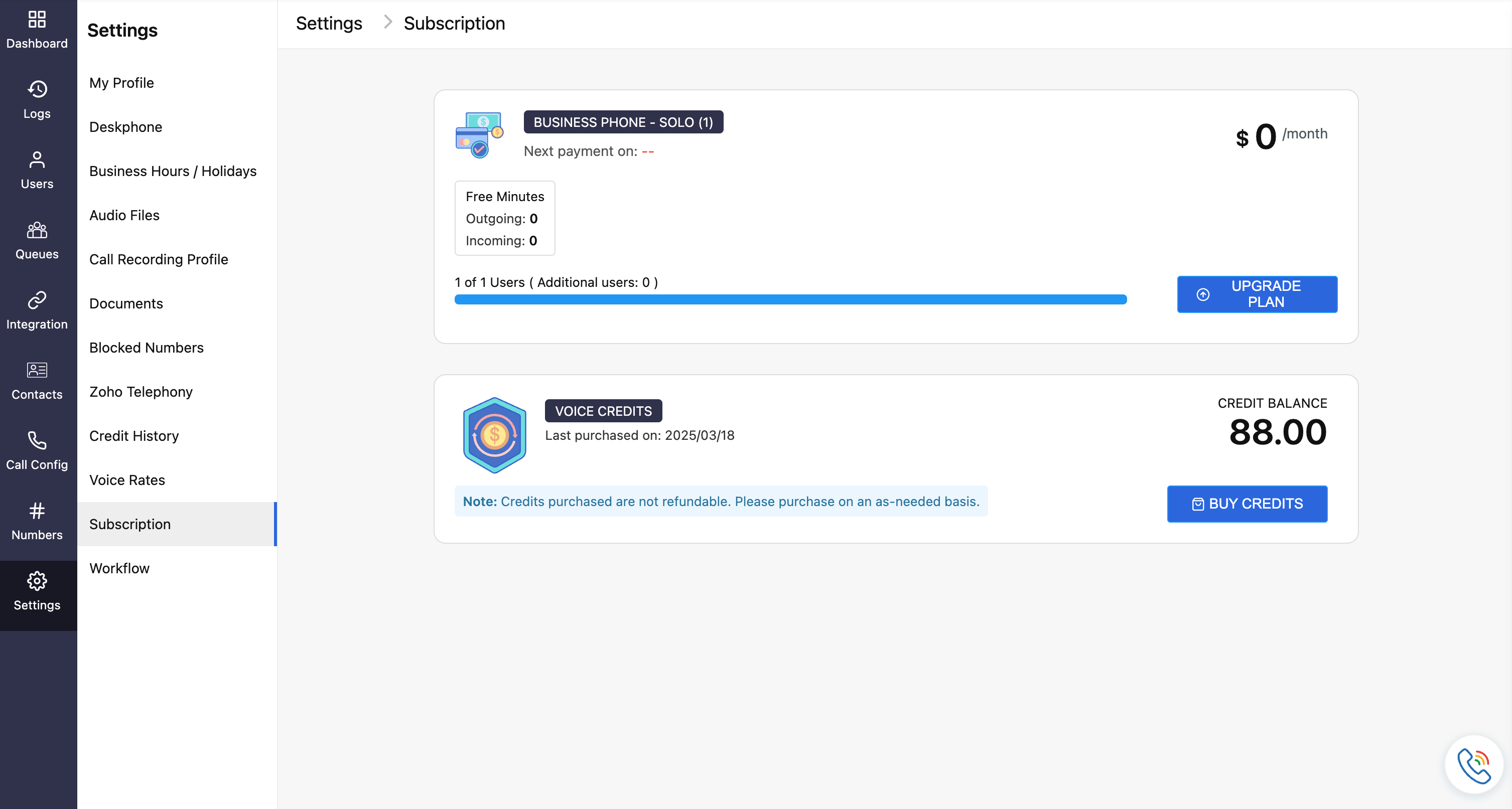 Once the payment is successful, your Zoho Voice organization will be upgraded to solo+user add-on