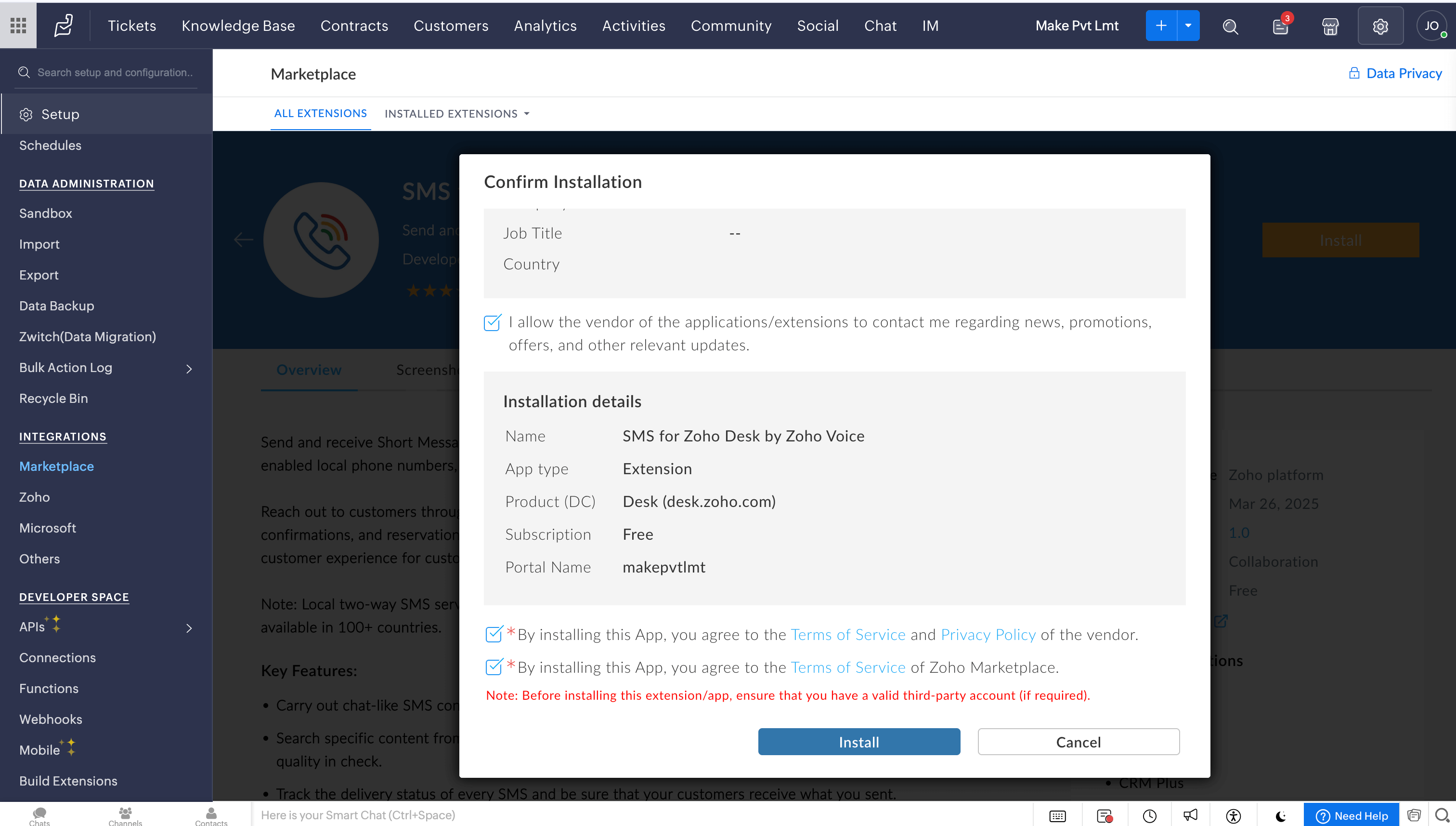 Installing the SMS for Zoho Desk by Zoho Voice extension