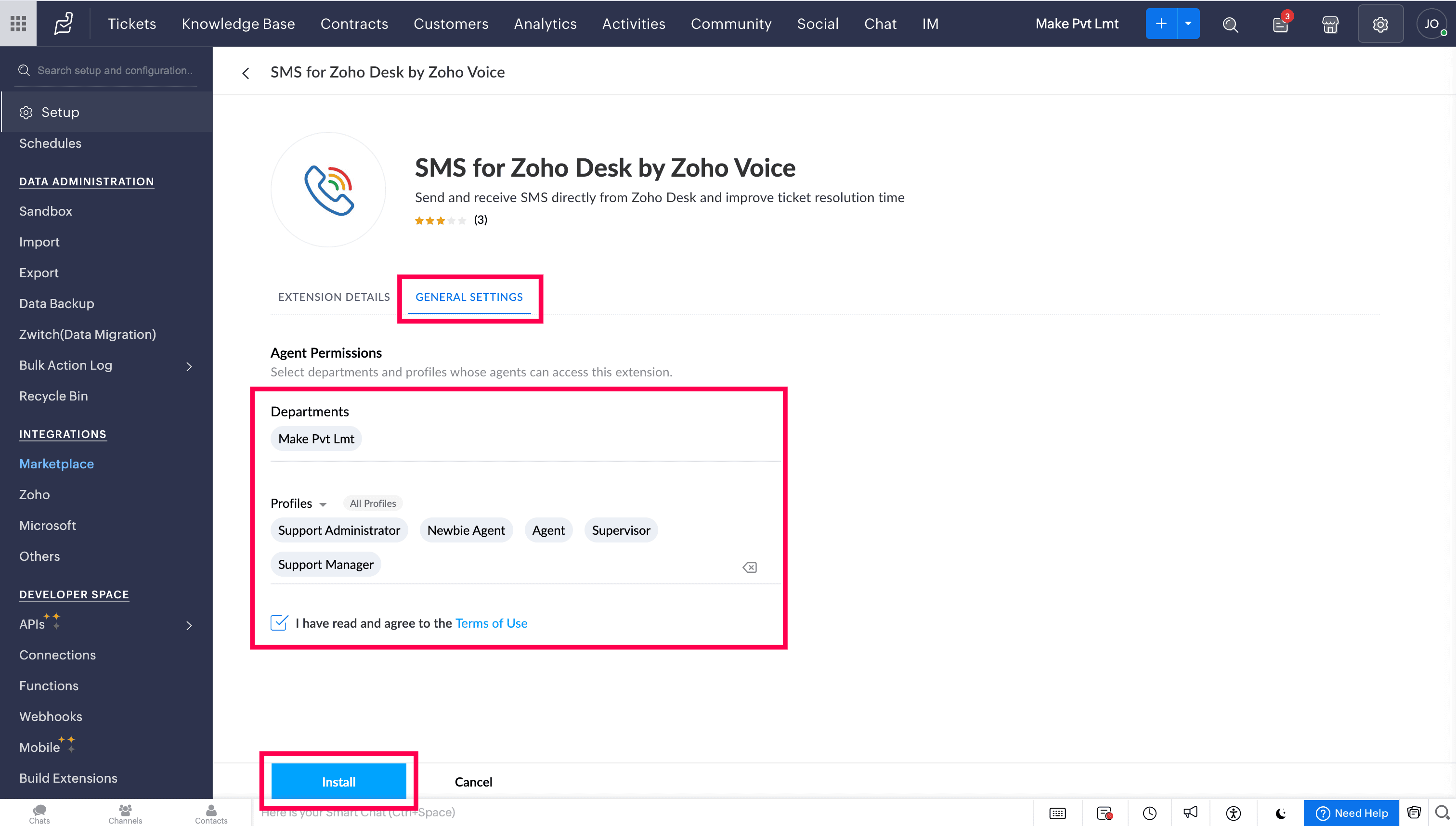 Search for SMS for Zoho Desk by Zoho Voice and click Install.