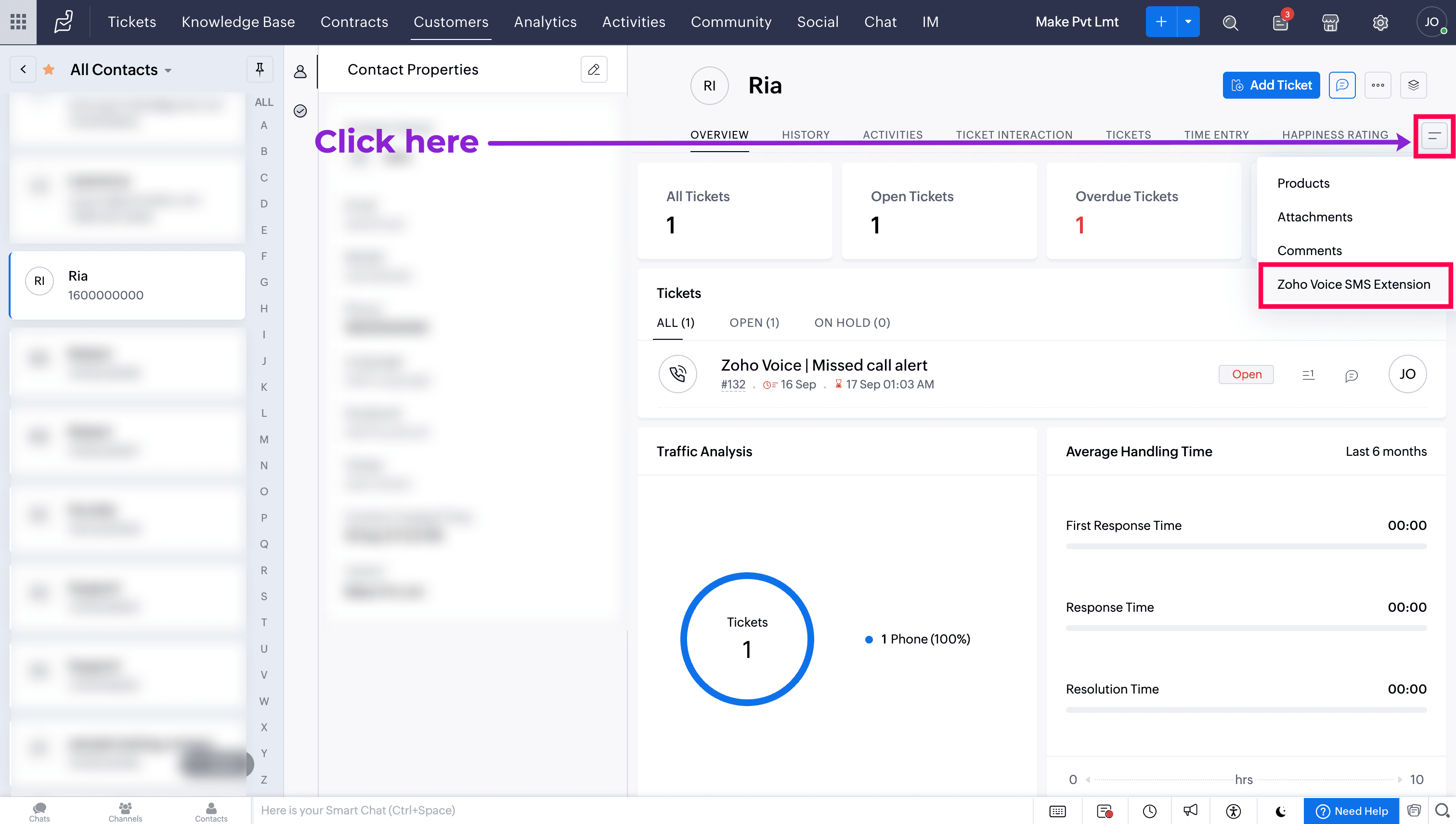On the contact's detailed view page, click the more menu icon and select Zoho Voice SMS Extension.