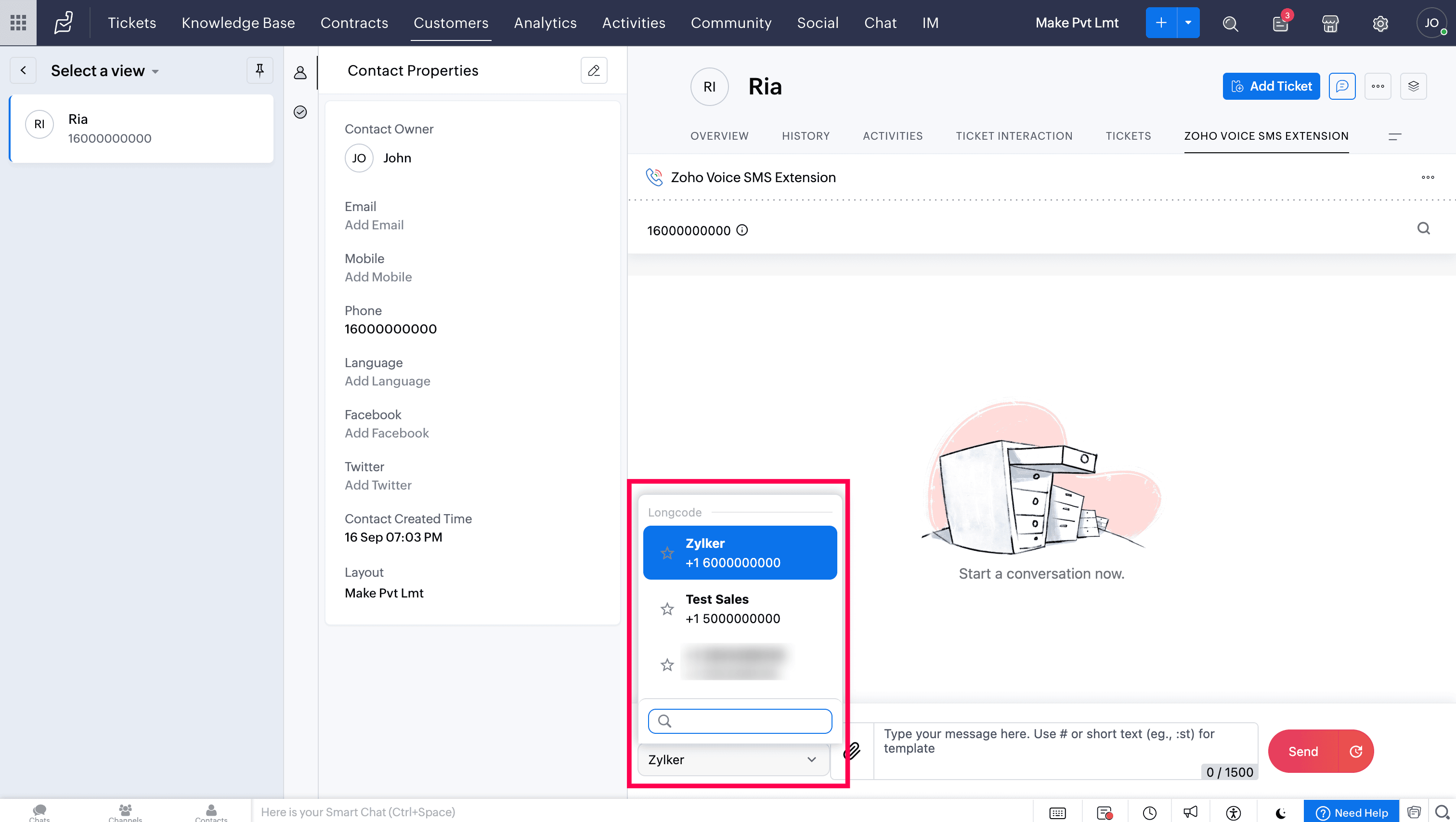 To start sending SMS/MMS messages directly from Zoho Desk, you need to install the SMS for Zoho Desk by Zoho Voice extension.