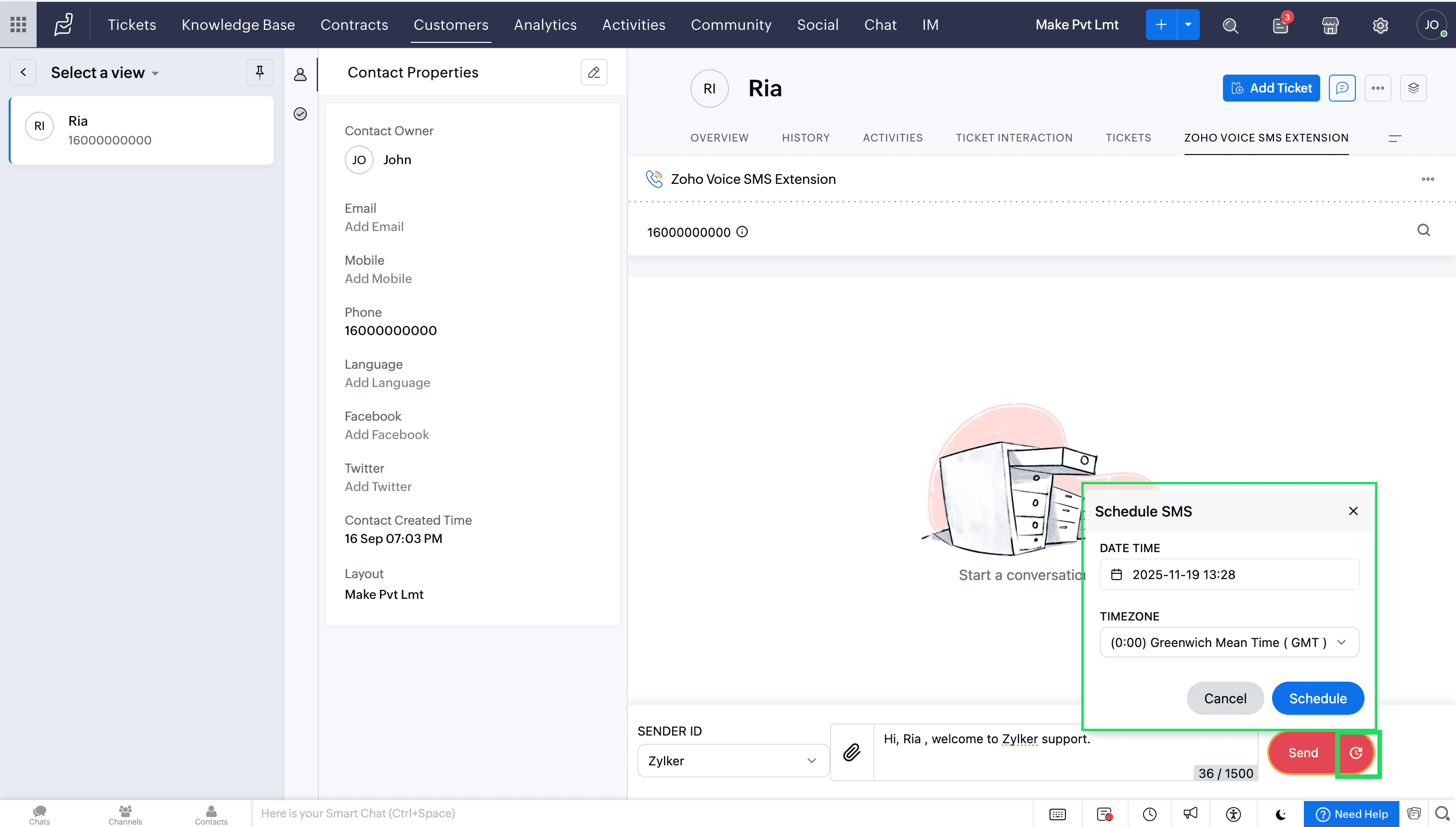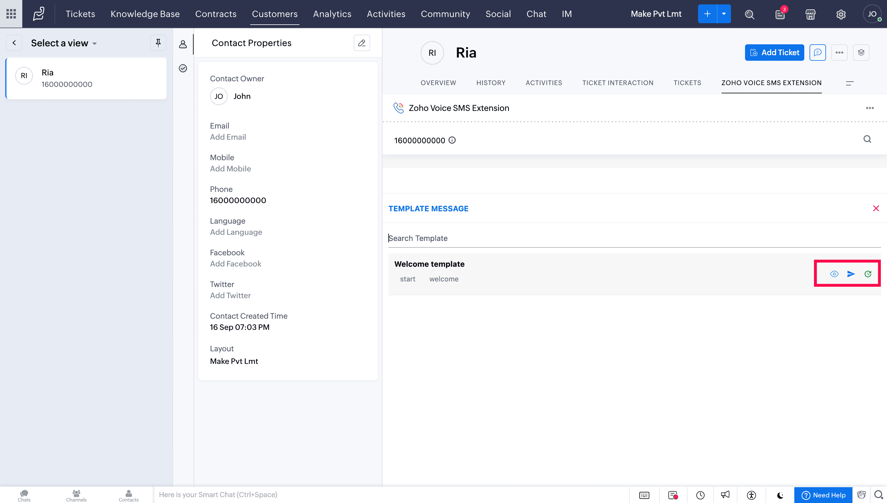 Send SMS/MMS in Zoho Desk using this extension