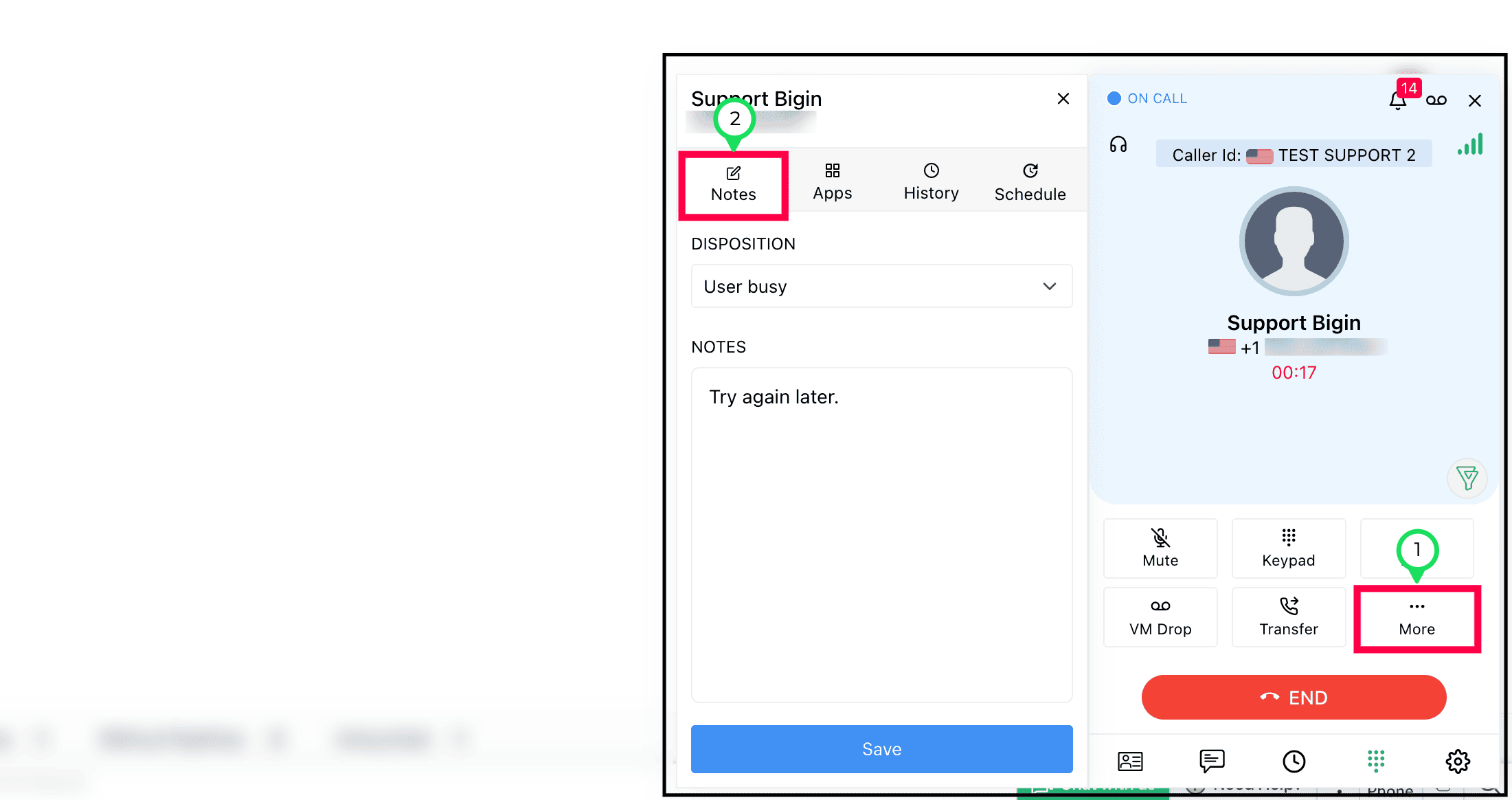 Select the required disposition from the dropdown, add your notes, and click Save.