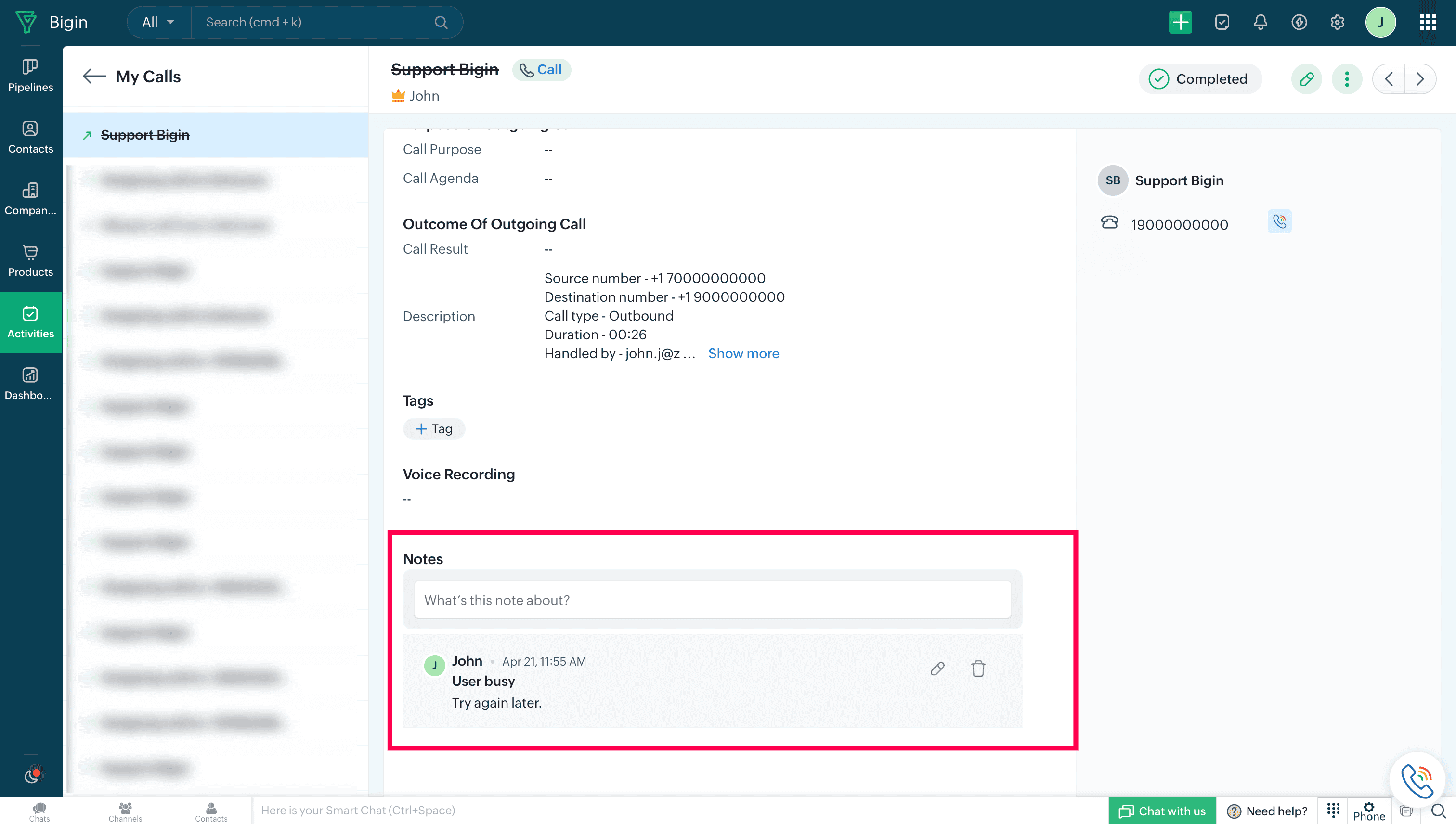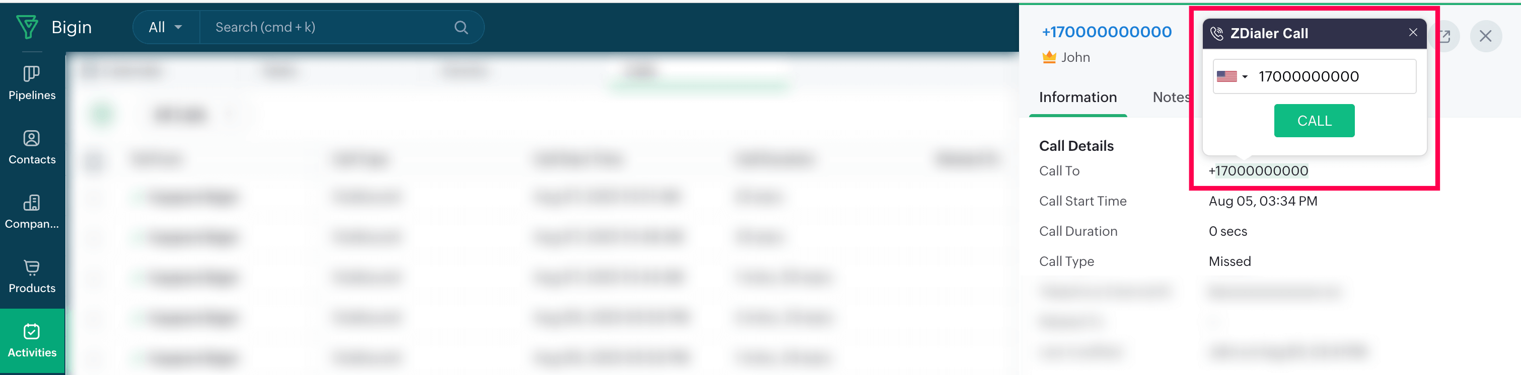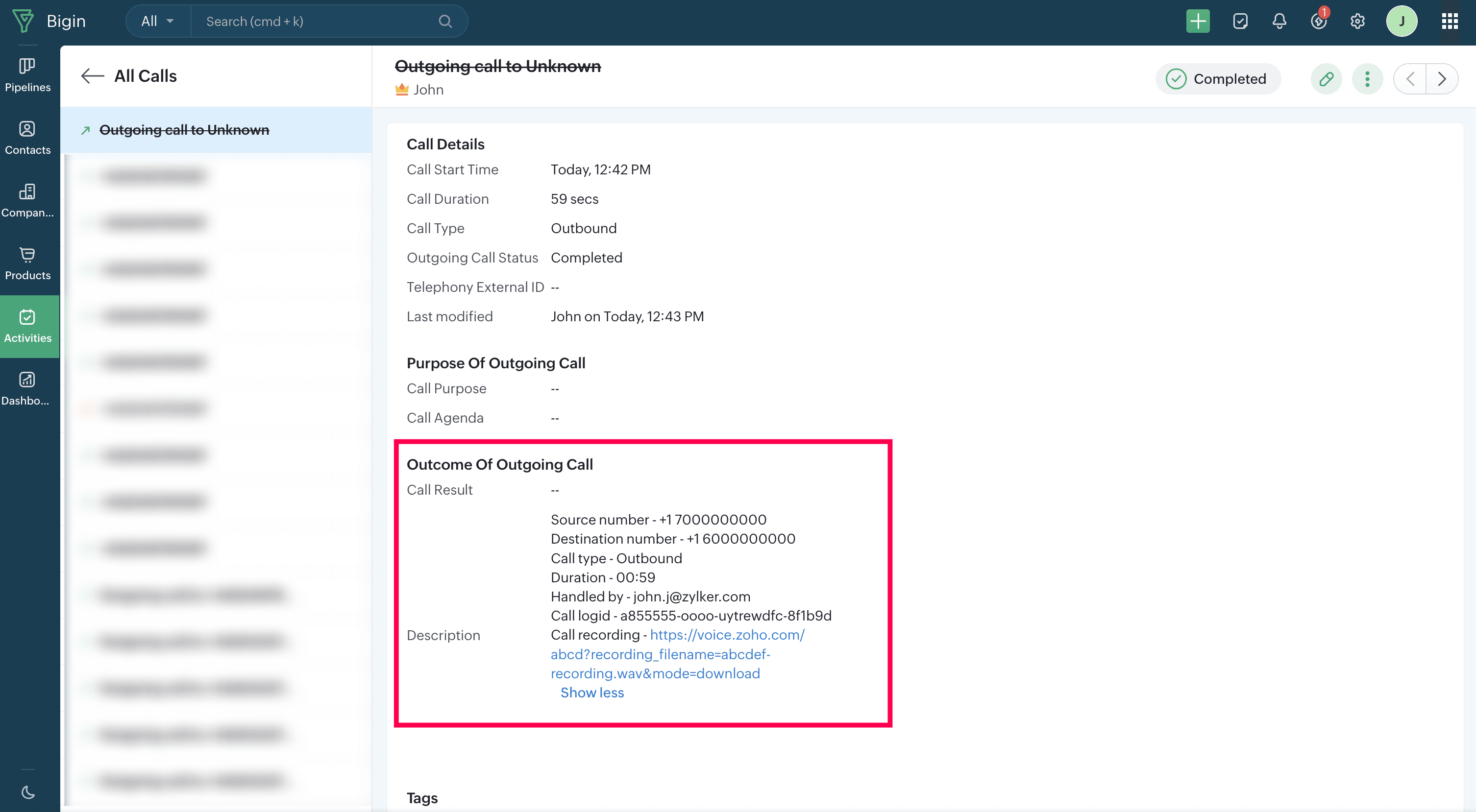 After a call is made or received through ZDialer, the call logs will be automatically recorded and available in the Activies module of your Bigin account.