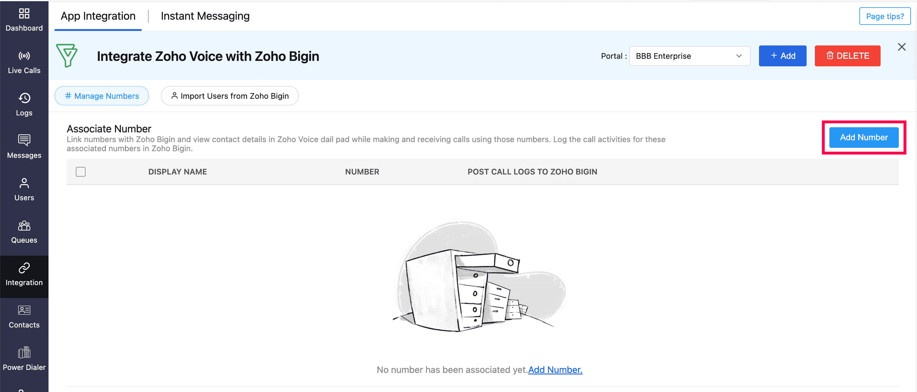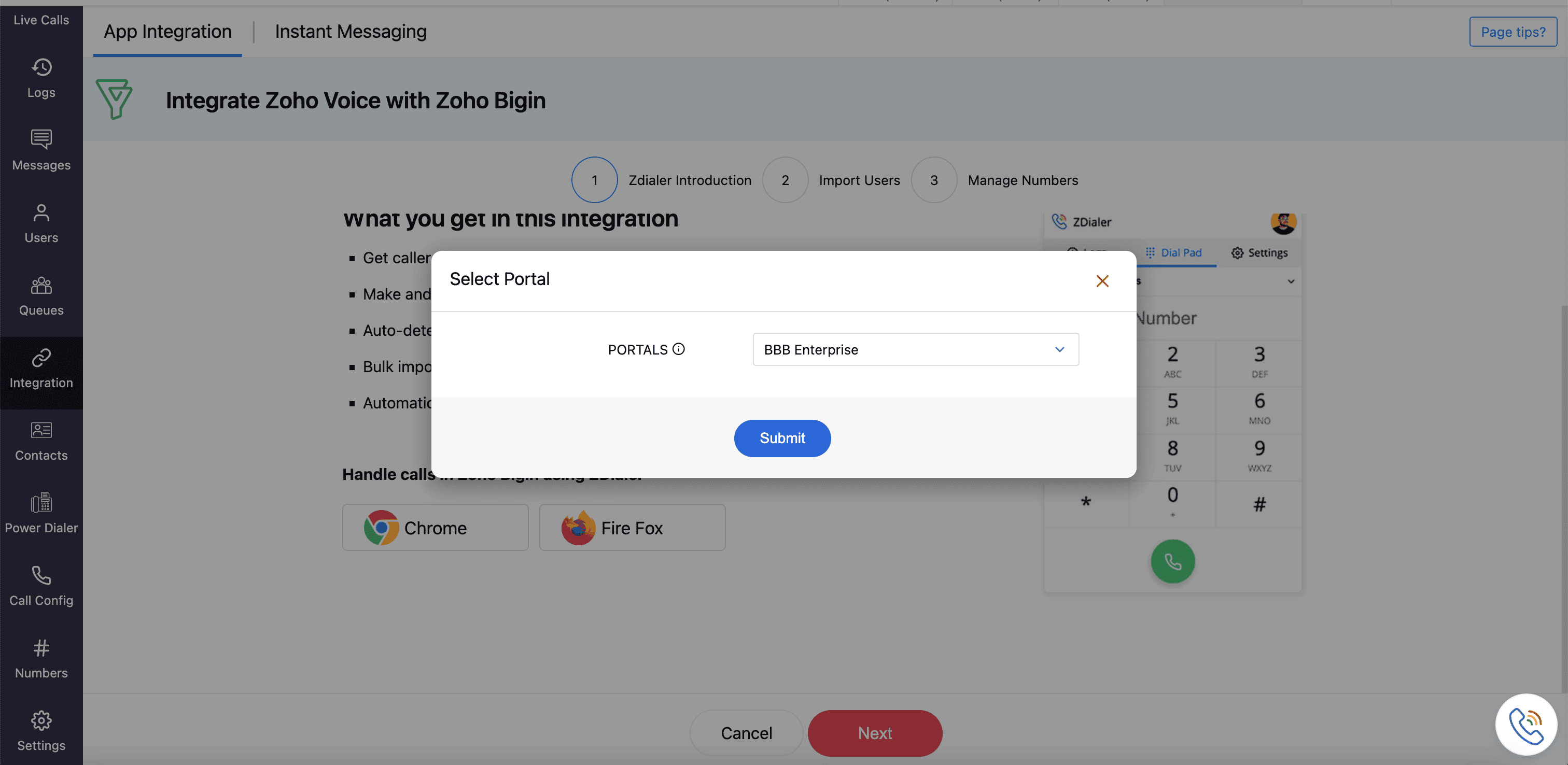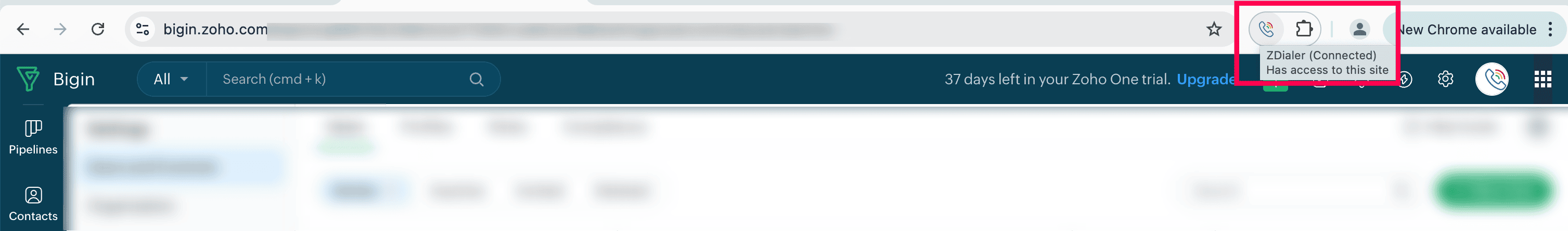 Open the ZDialer widget within Zoho Bigin.