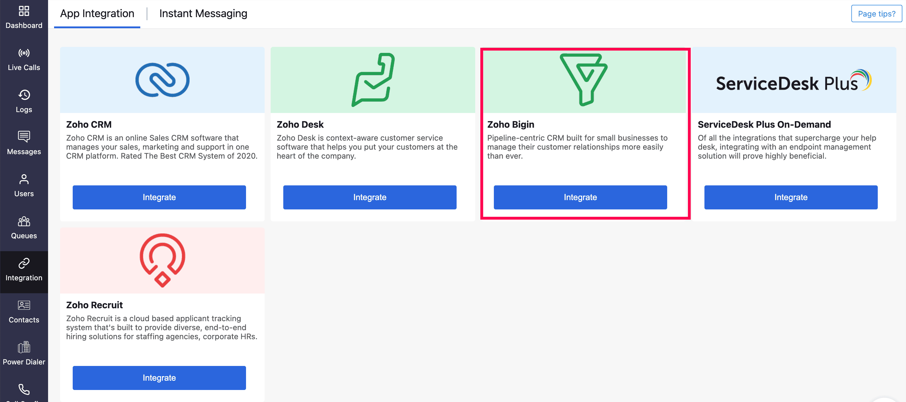 Go to the Integration module, and click Integrate of Zoho Bigin.
