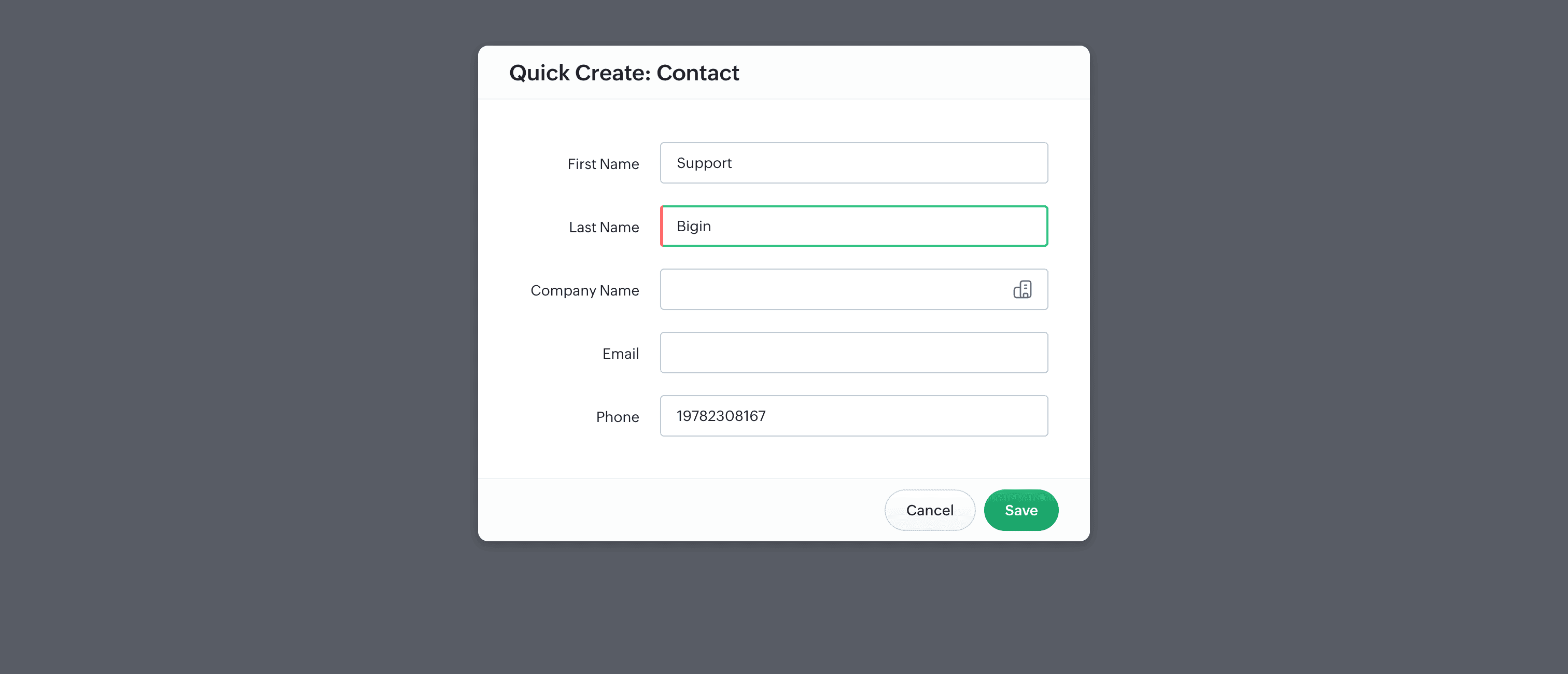Any contact you create here will be saved and displayed in the Contact module within your Bigin account