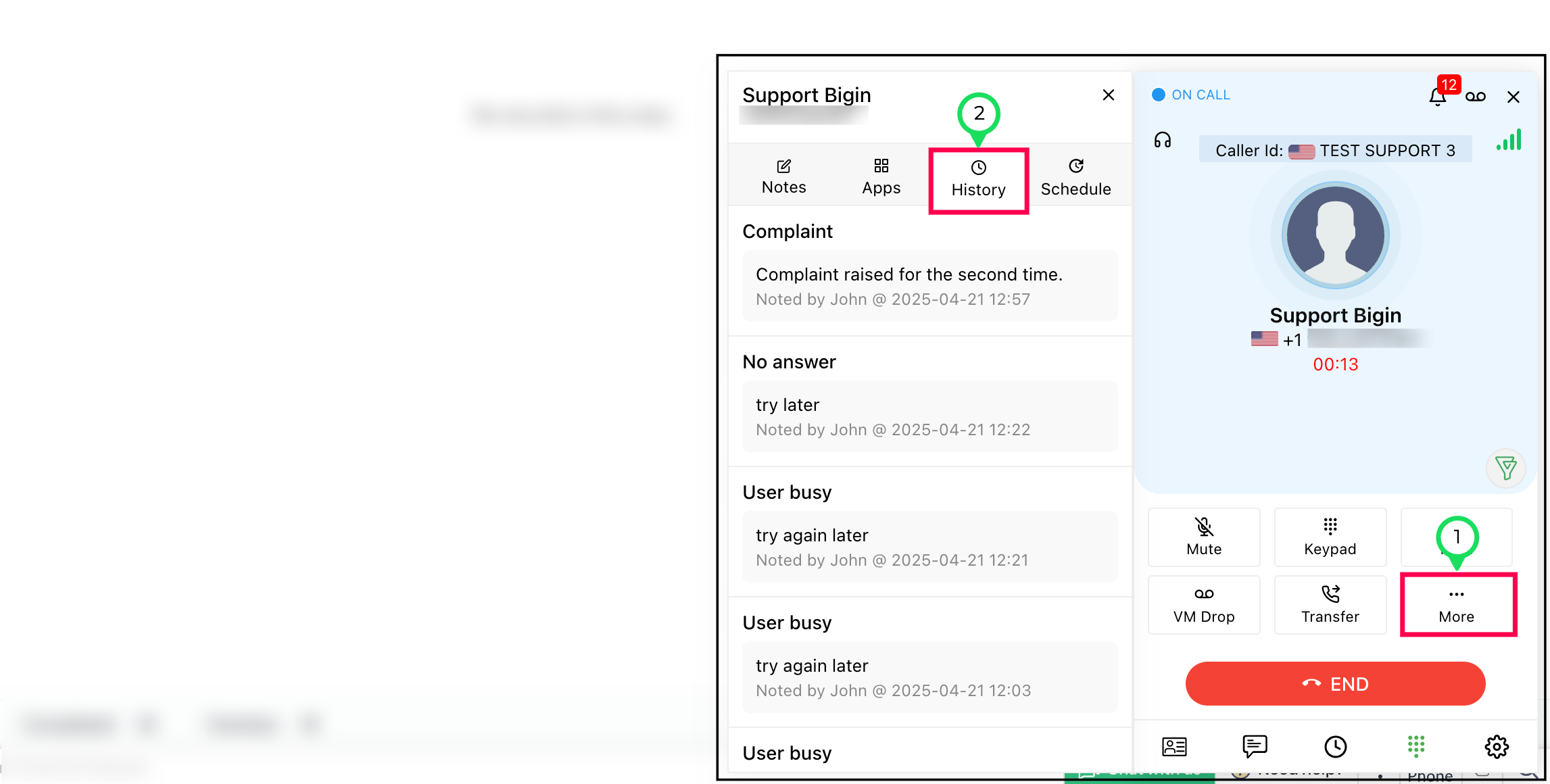 During or after a call, you can view the previous notes and dispositions linked to this call log.