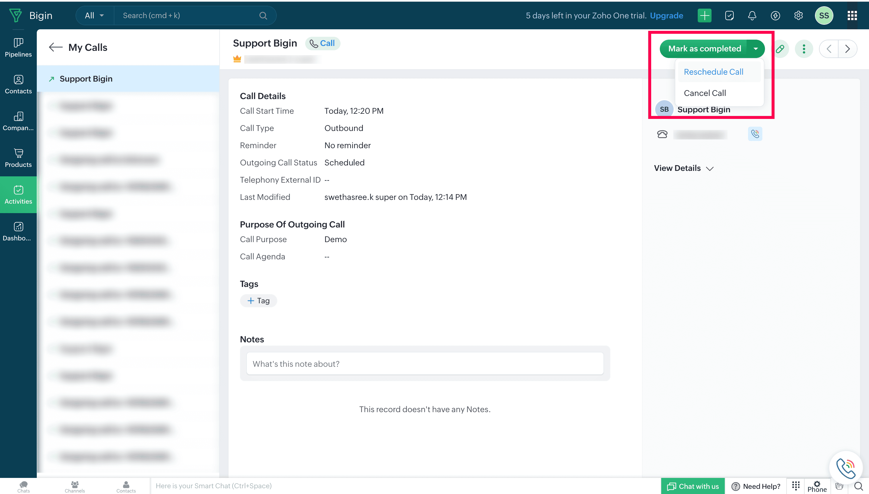 The scheduled call will appear in the Activities module of your Bigin account. You can then choose to place the call, reschedule it, or mark it as completed.