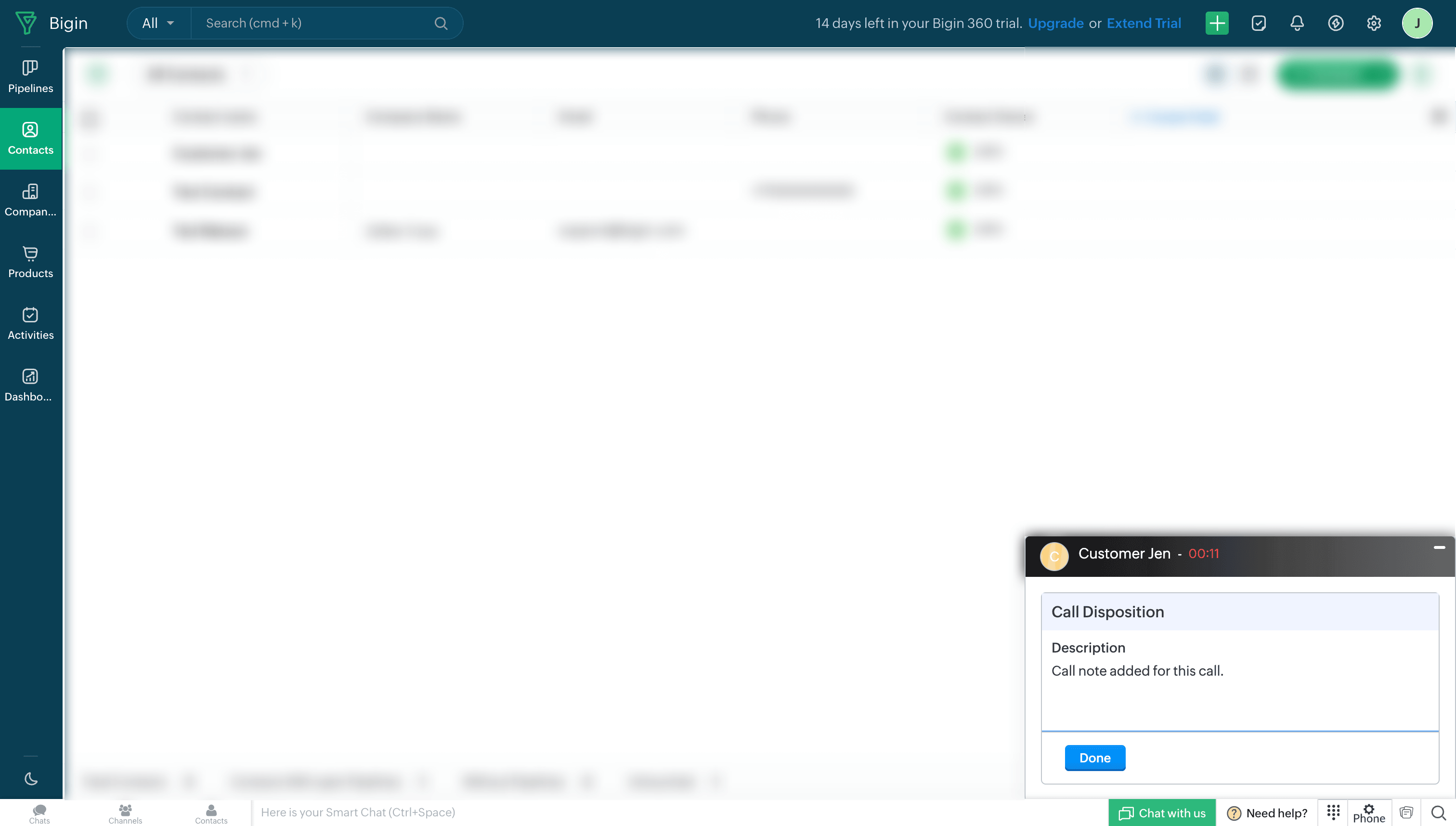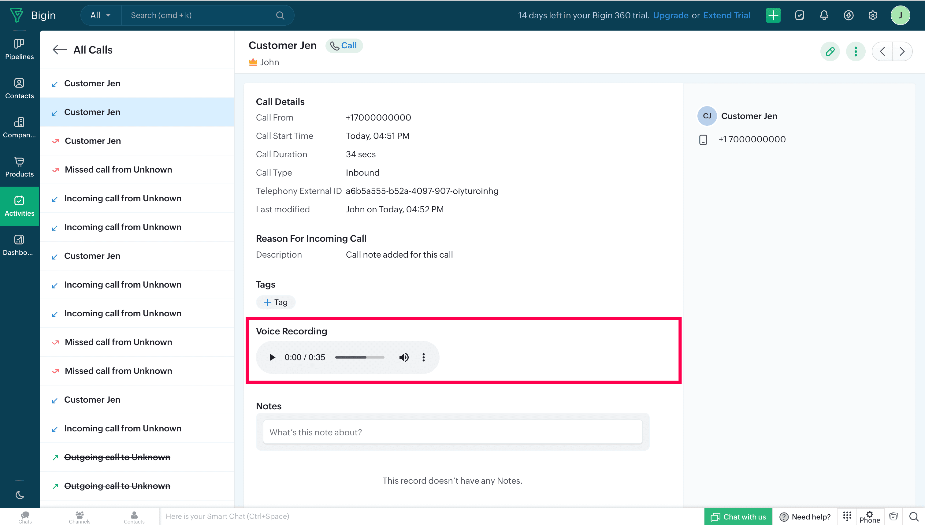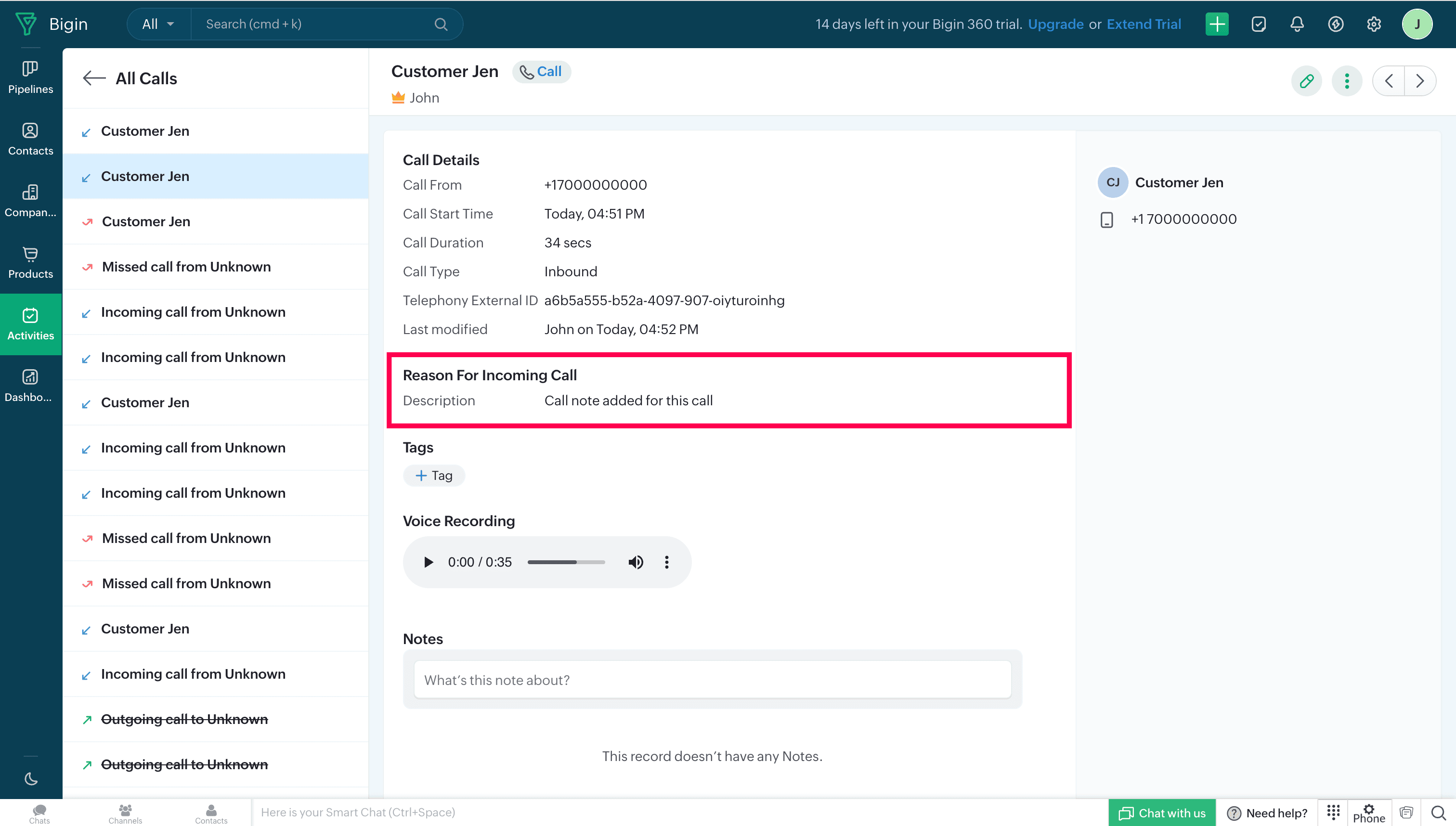 These notes will be added to the log entry (Activities → All Calls) in Bigin.