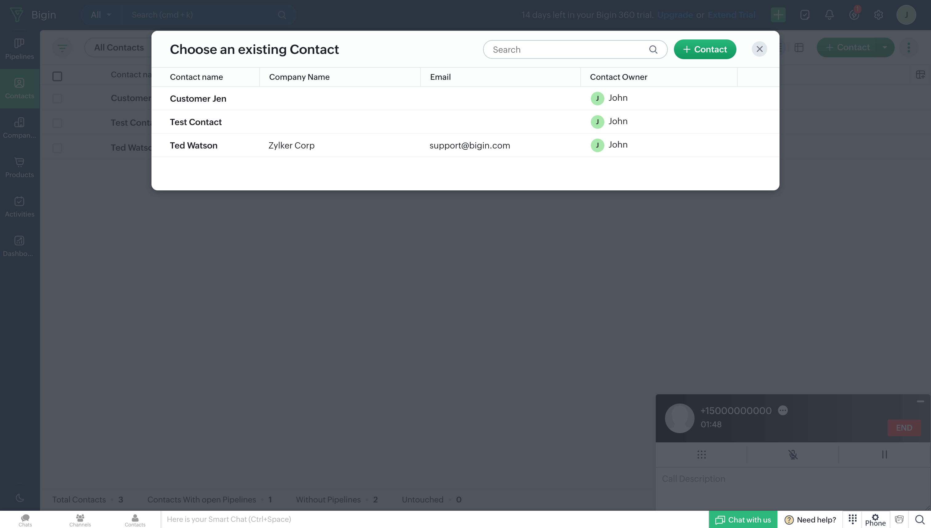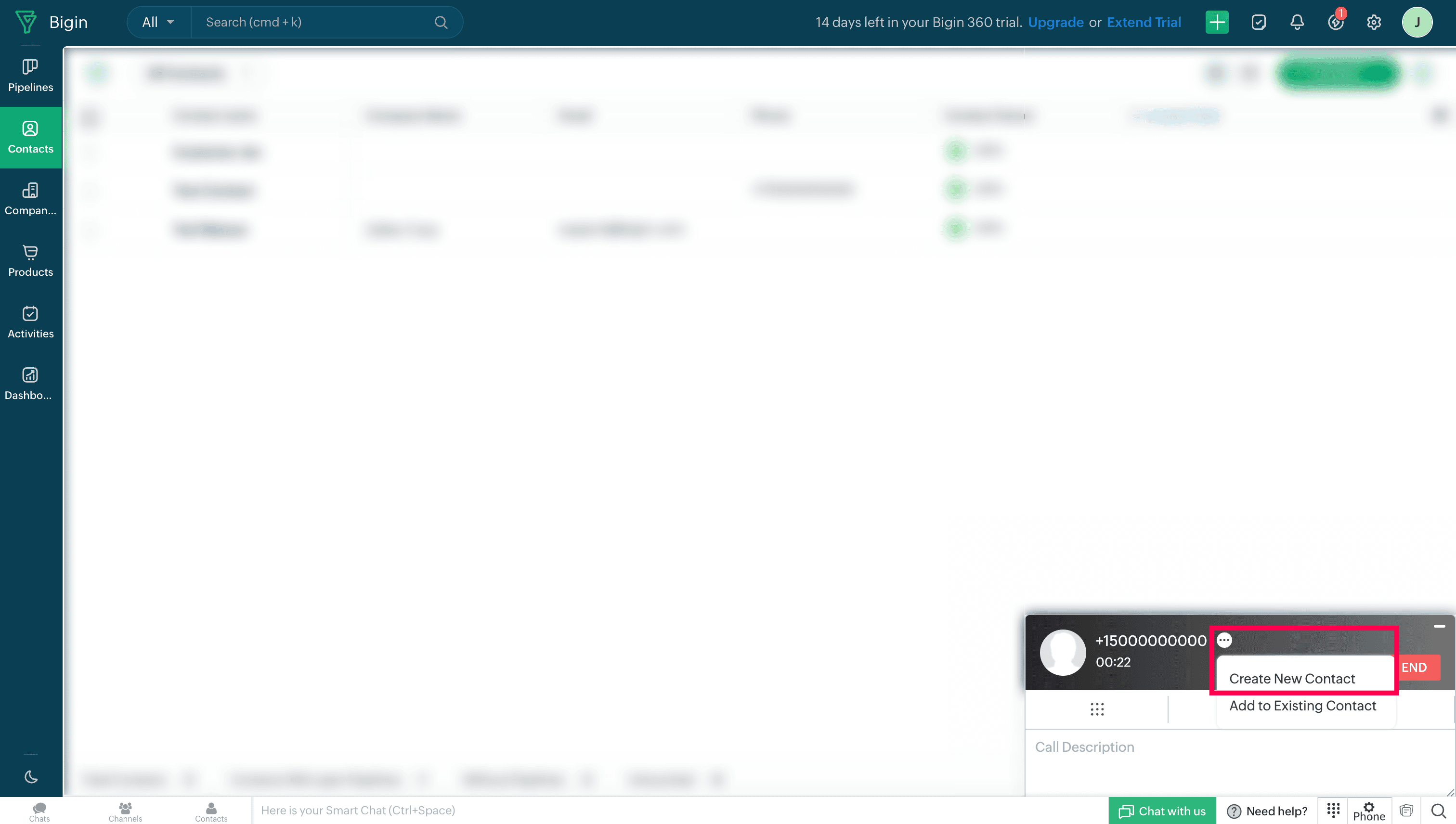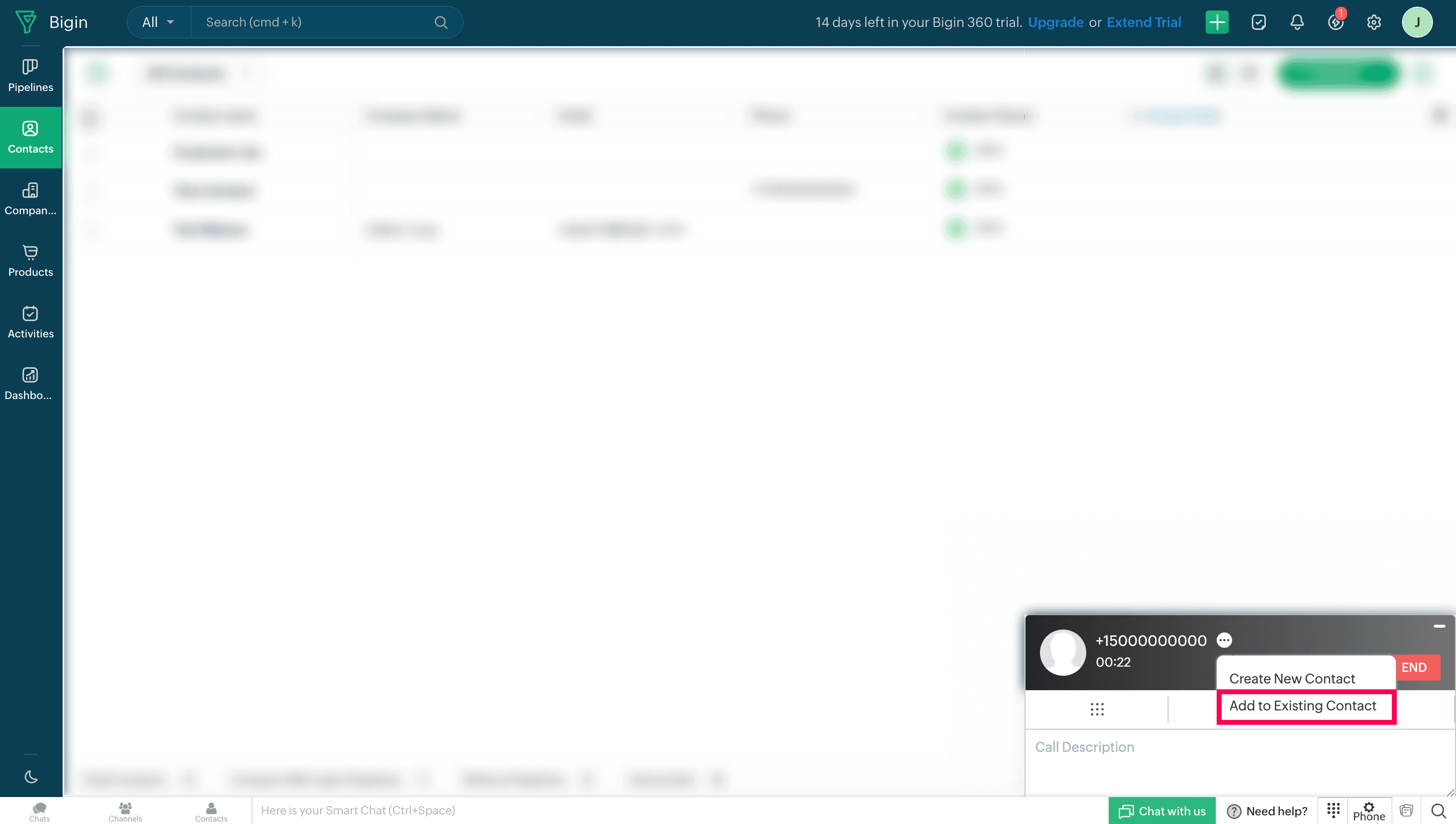 During or after a call, a new number can be added to an existing contact in Zoho Bigin.