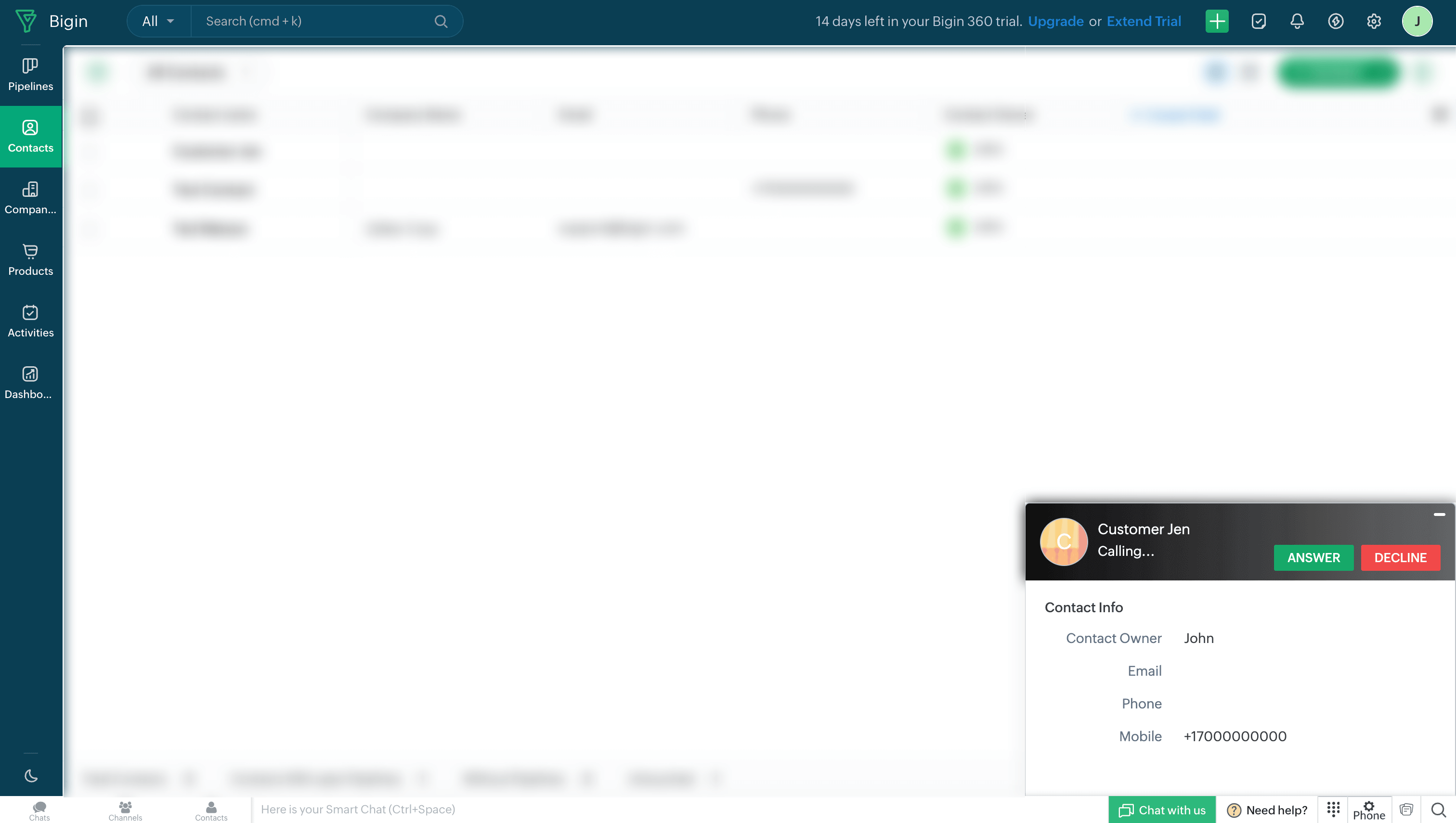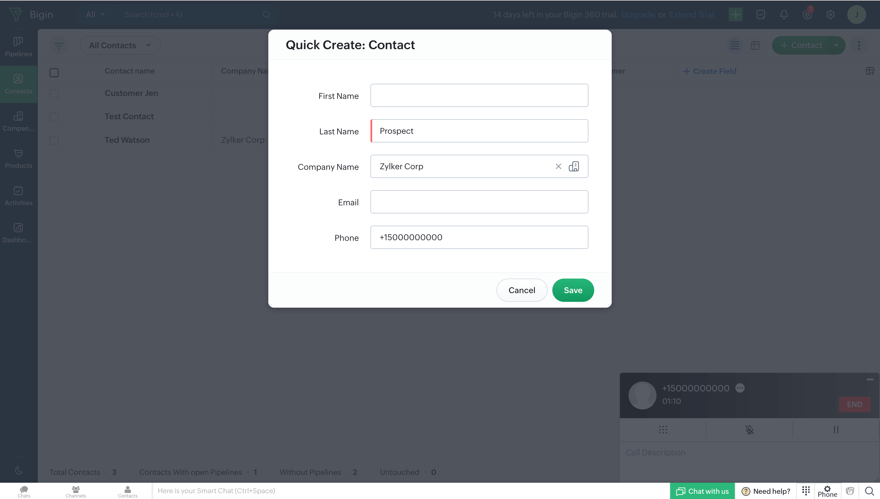 Caller information is displayed through on-screen pop-ups, enabling you to identify the caller immediately. The details are automatically retrieved from Zoho Bigin.