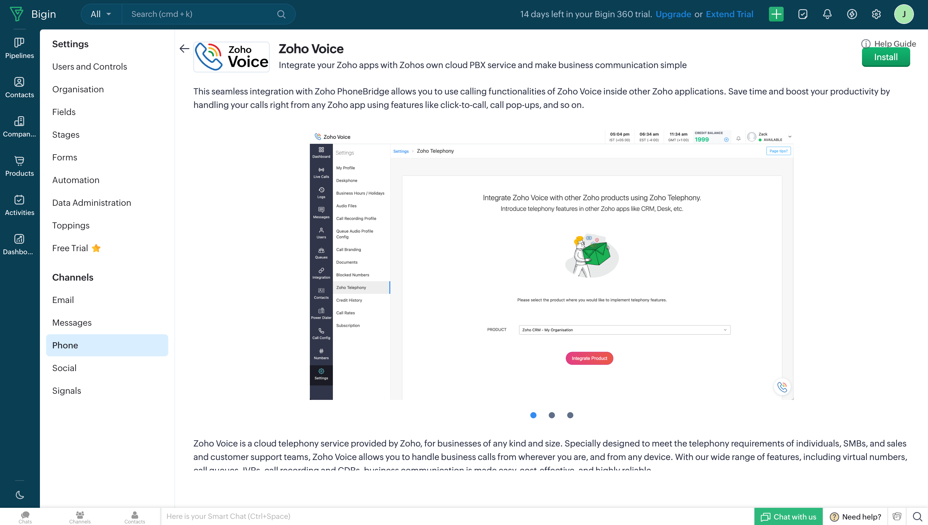 Select the Bigin portal you want to integrate with Zoho Voice and click Integrate Product.