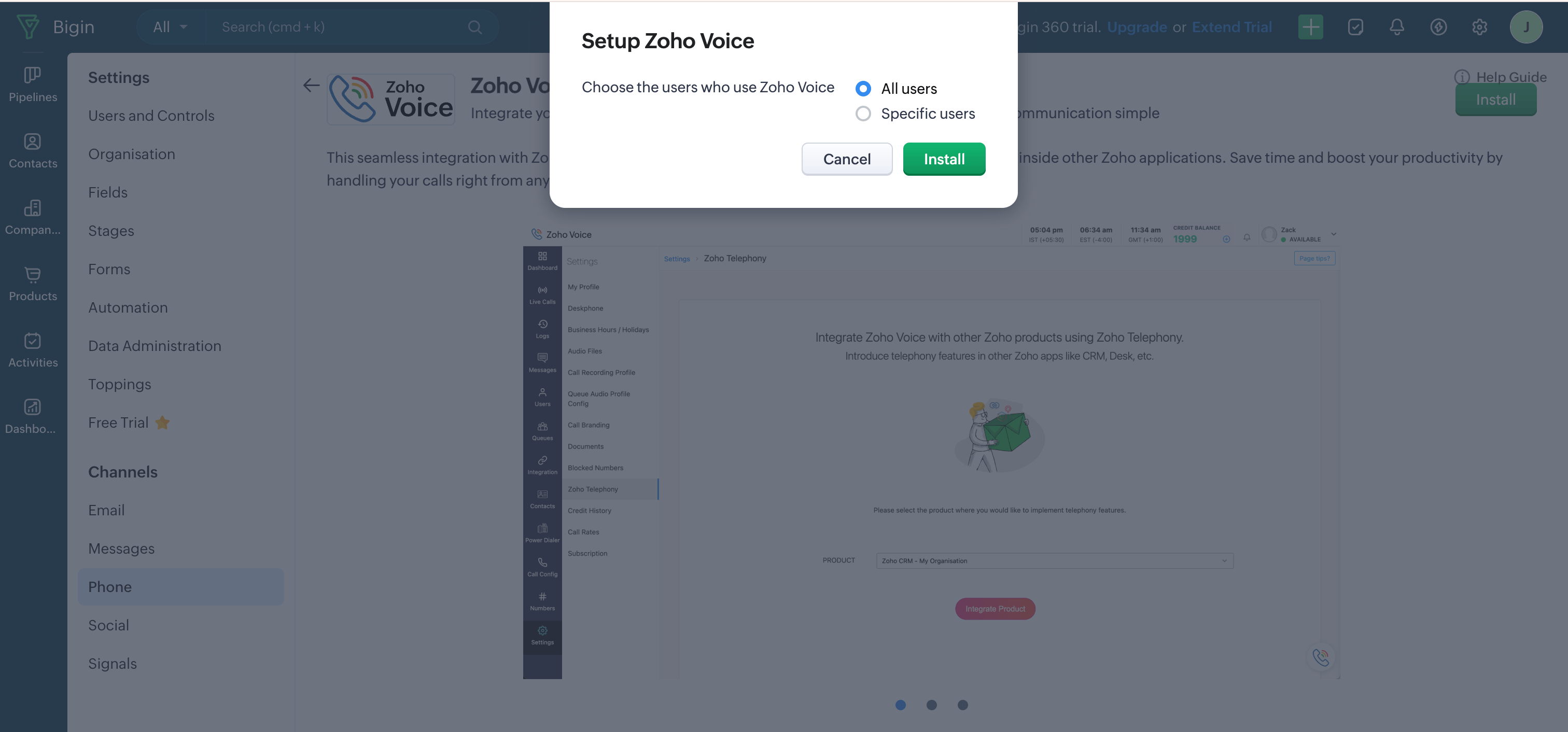 In the Setup Zoho Voice prompt, choose the type of users (All Users/Specific Users) to access Zoho Voice, then click Install.
