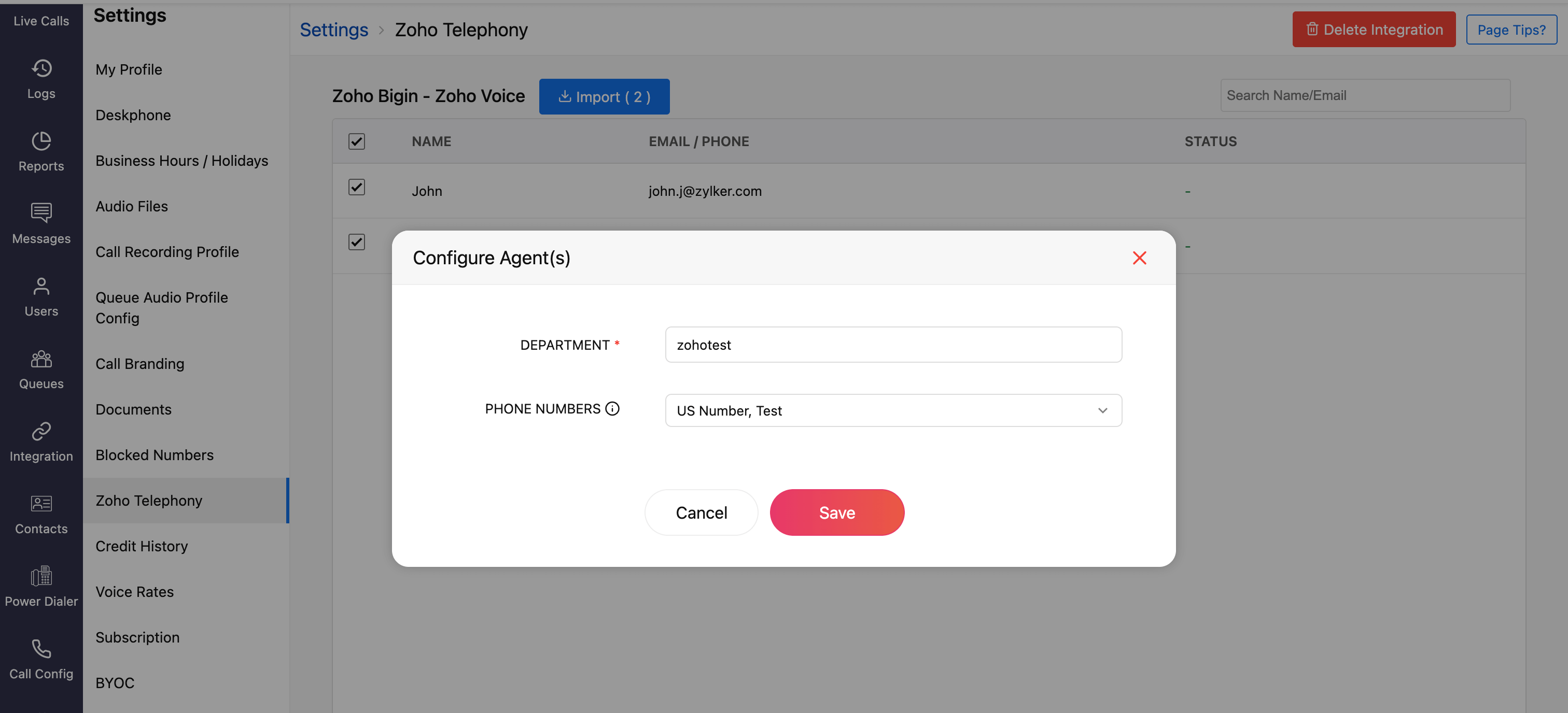 Calls will work in Zoho Bigin only if you assign phone numbers to your admin and telephony agents in Zoho Voice. To assign numbers: