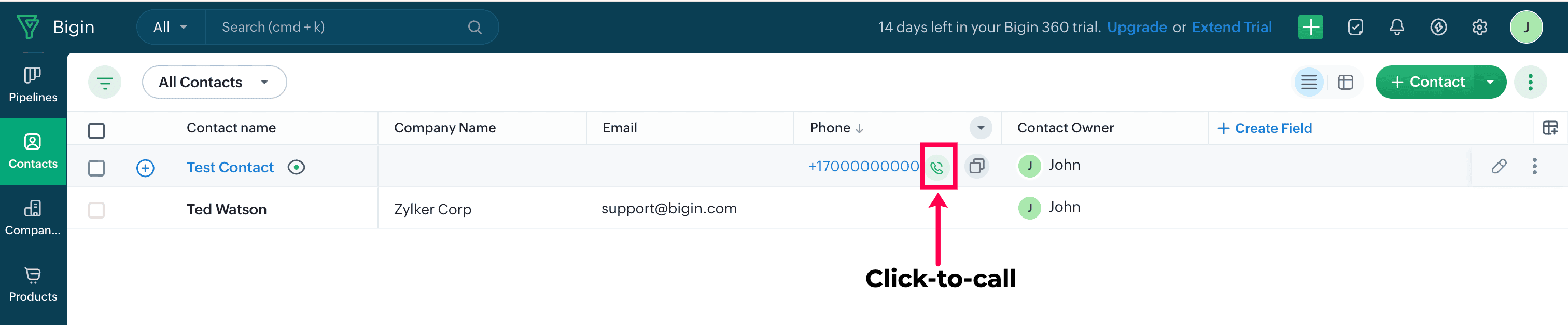 You can initiate calls using the click-to-call button found next to phone numbers in Bigin.