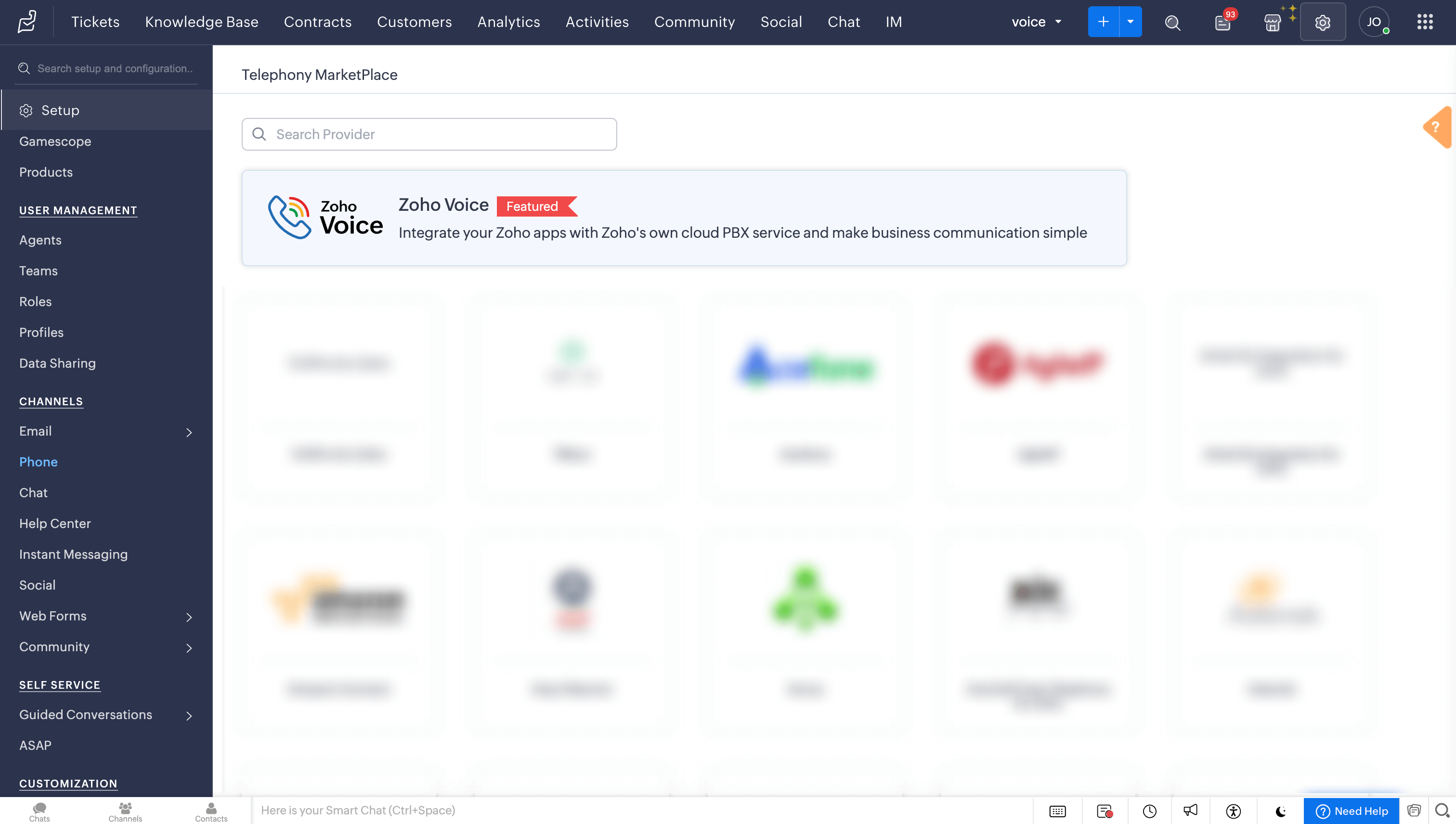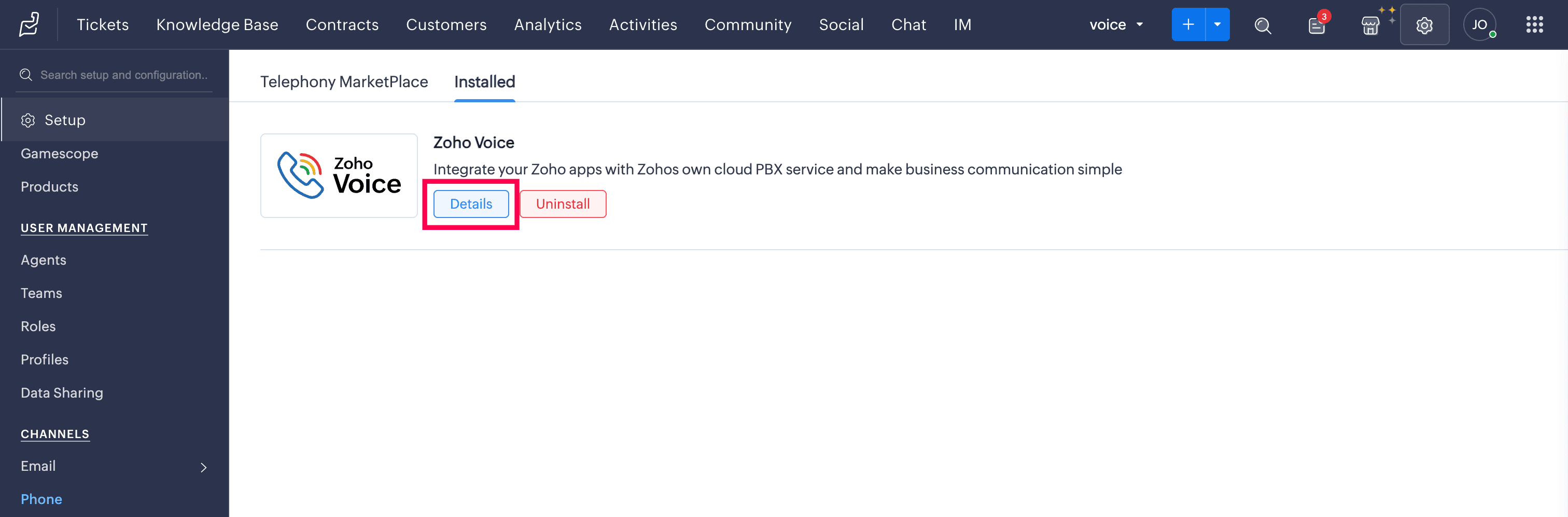 In the Telephony Marketplace, select Zoho Voice from the listed apps.