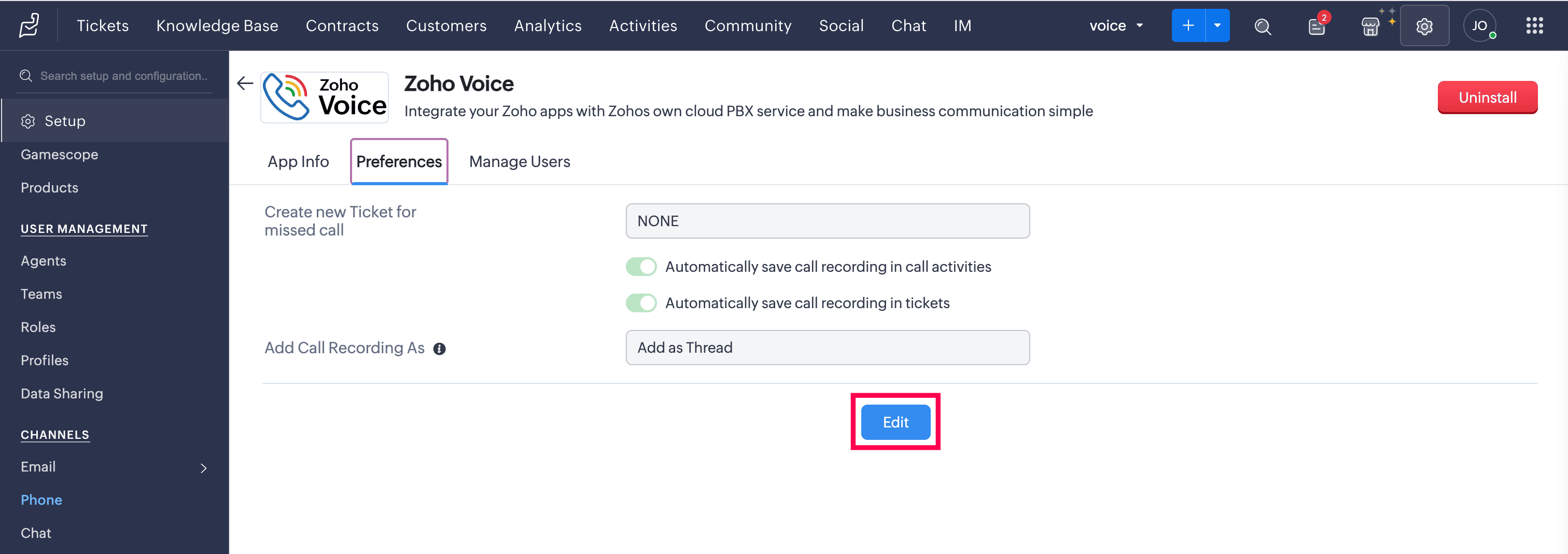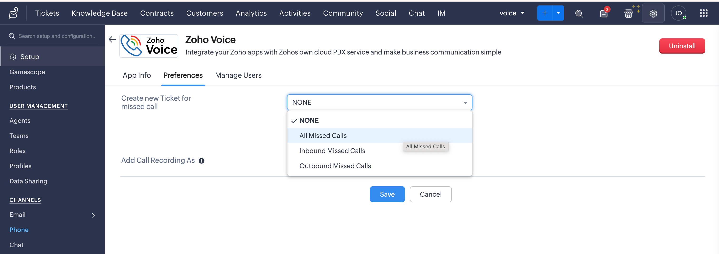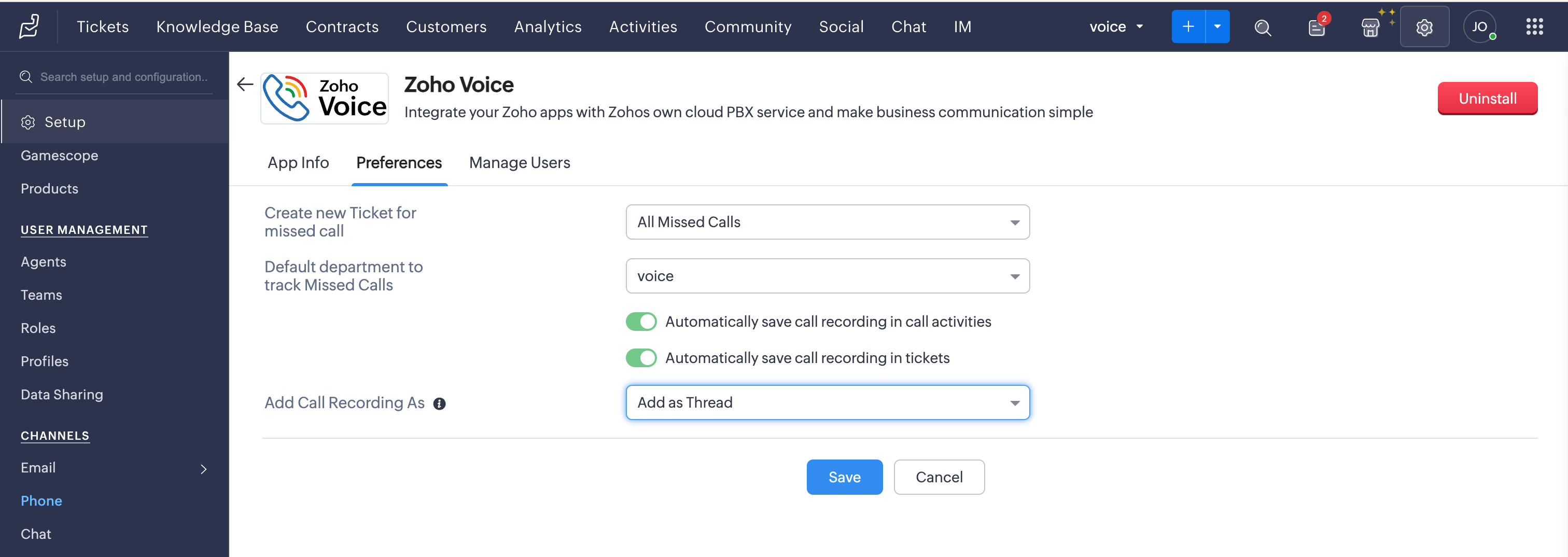 Enable or Disable the additional options: Automatically save call recordings in call activities and Automatically save call recordings in tickets.