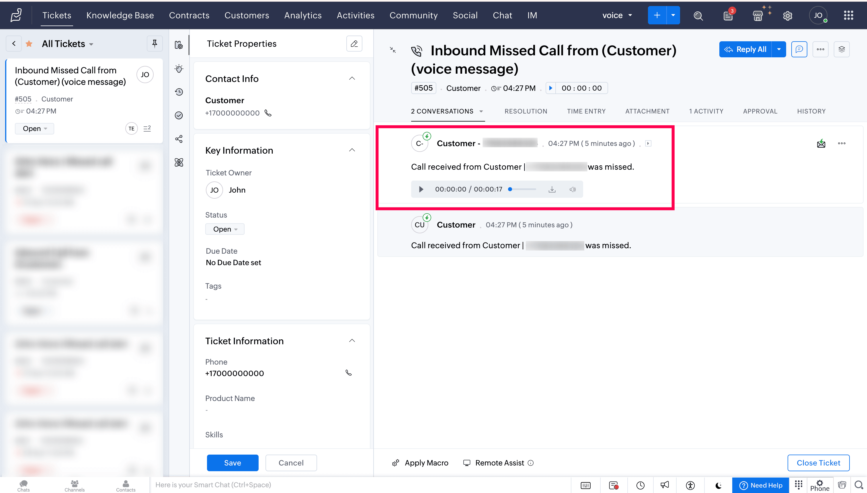 When a voicemail is left by the caller, you can listen to and download the voicemail directly from the ticket.