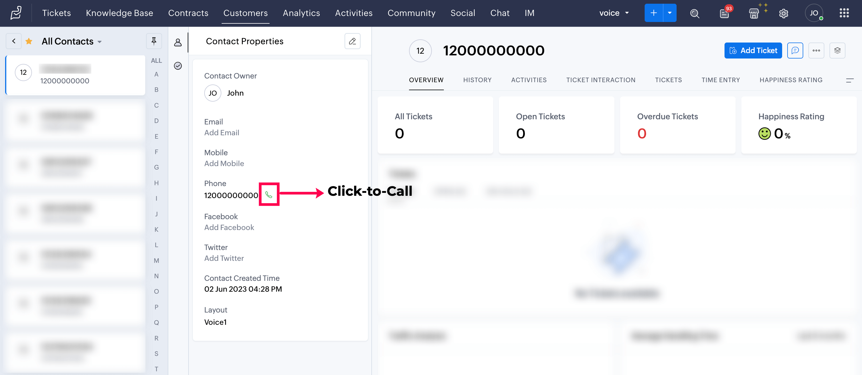 You can initiate calls using the click-to-call icon found next to phone numbers in Zoho Desk.