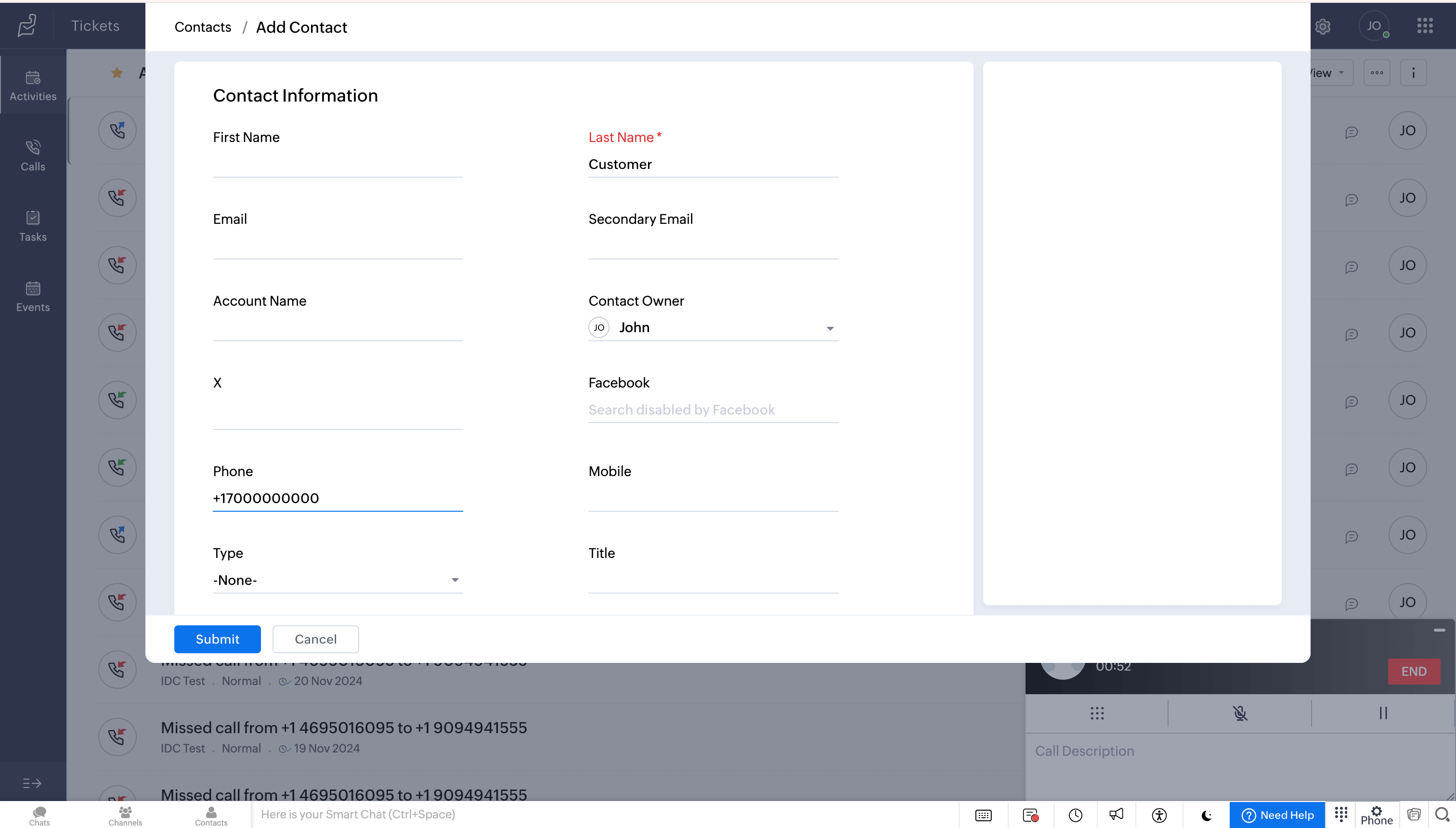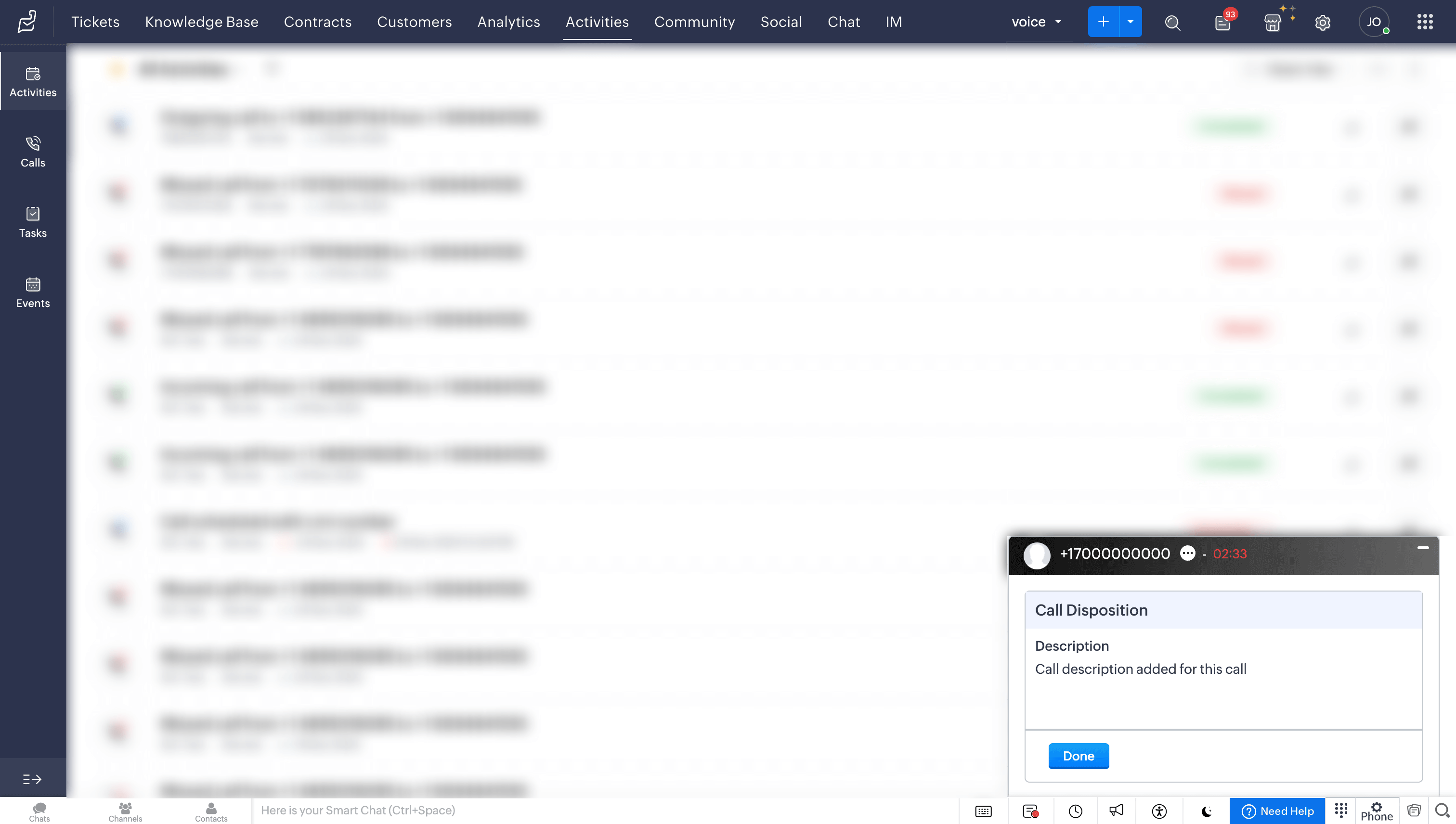 After a call ends, you can add notes related to the current call in the Call Disposition → Description tab. These notes will be saved against the corresponding call log entry in the Activities module of Zoho Desk.