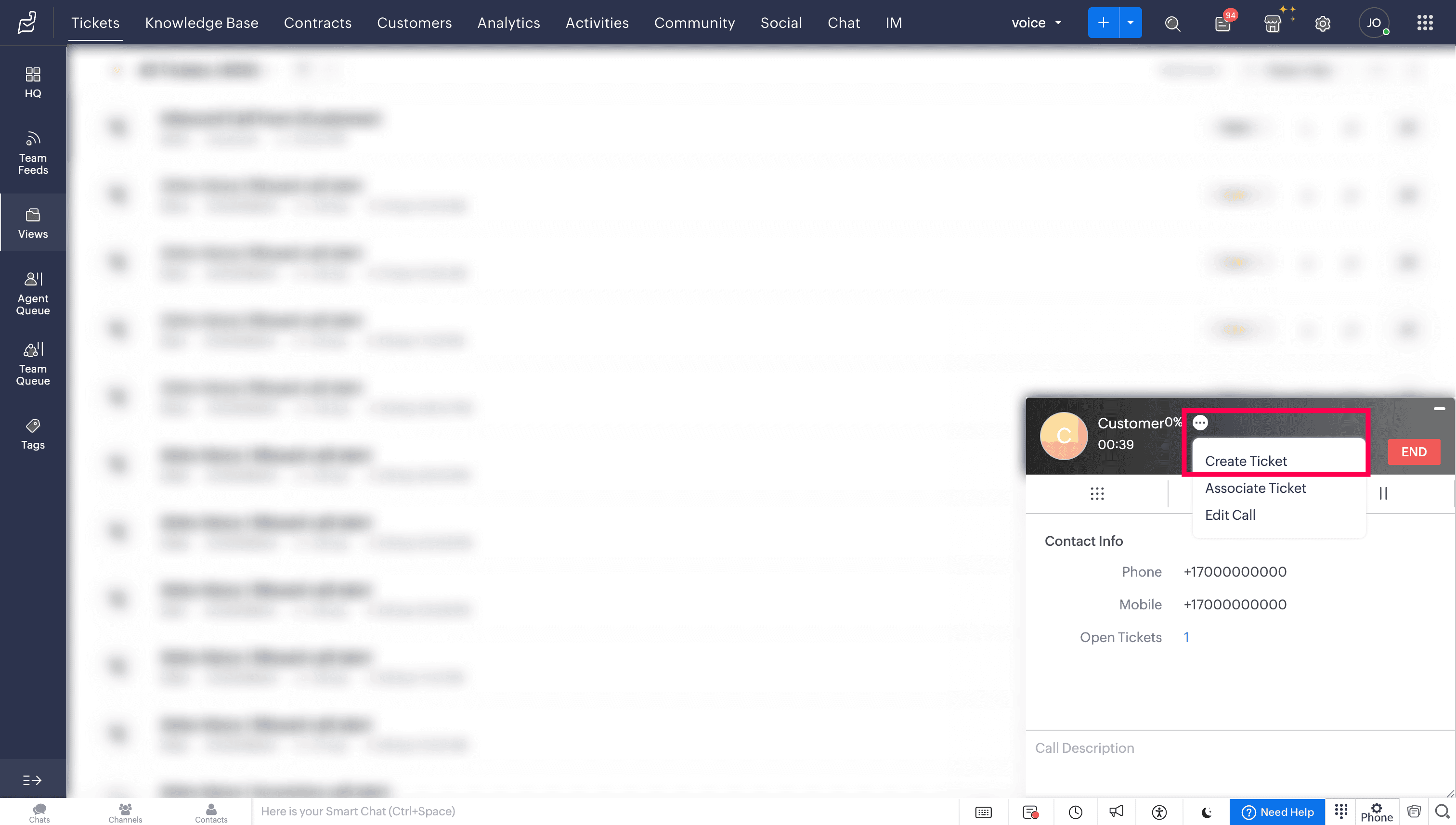 During a call, a new ticket can be created in Zoho Desk with the call details.