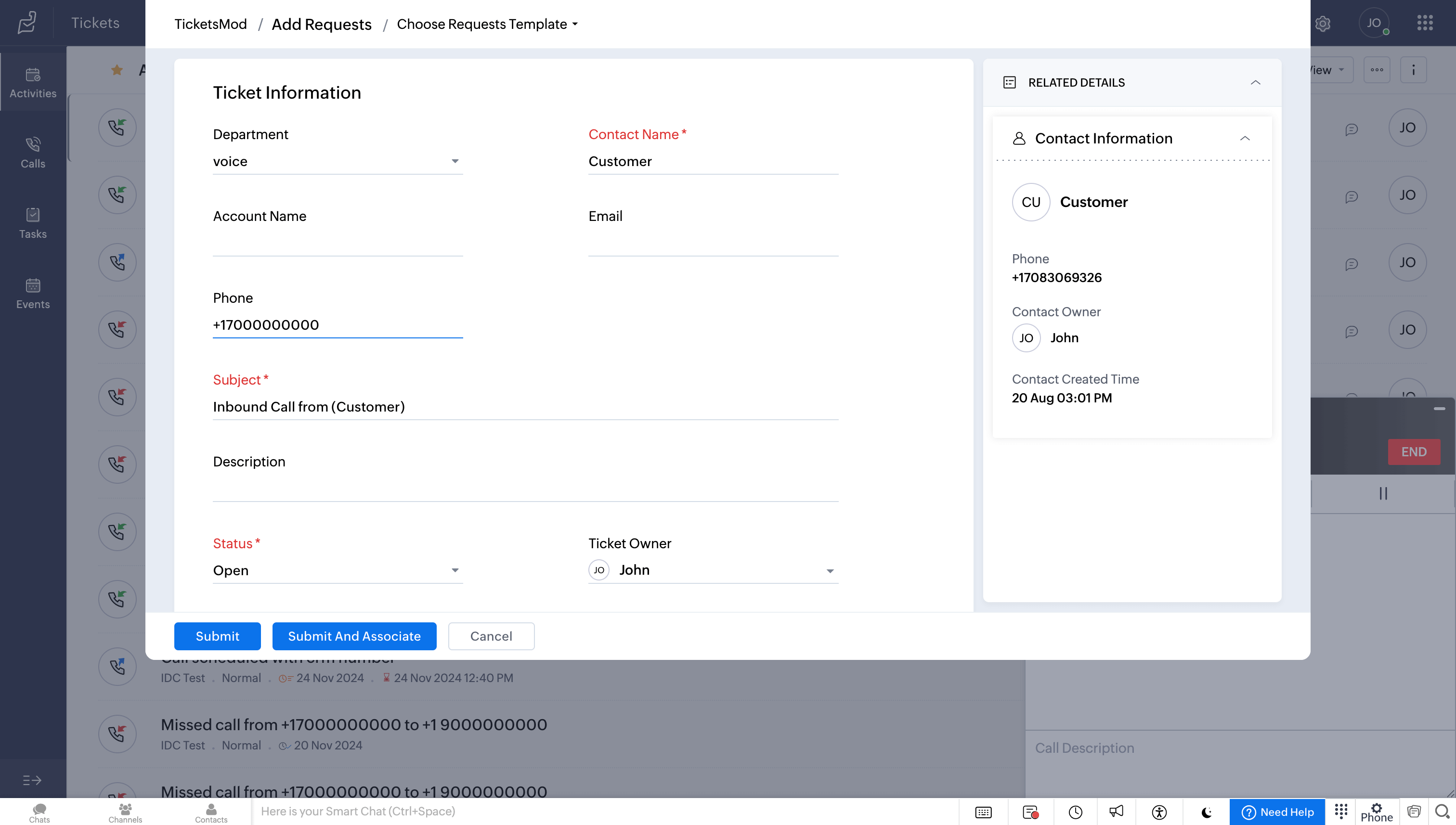 Search for and select the required ticket, and the call details will be associated with it.