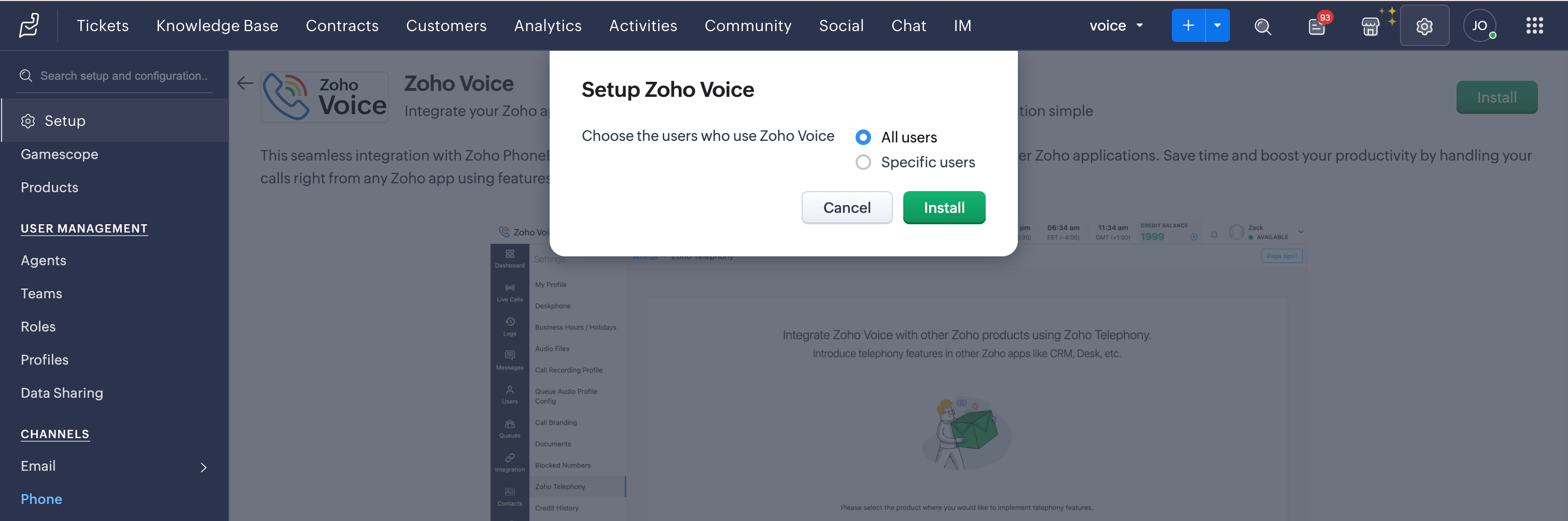 In the Setup Zoho Voice prompt, choose the type of users (All Users/Specific Users) to access Zoho Voice, then click Install.