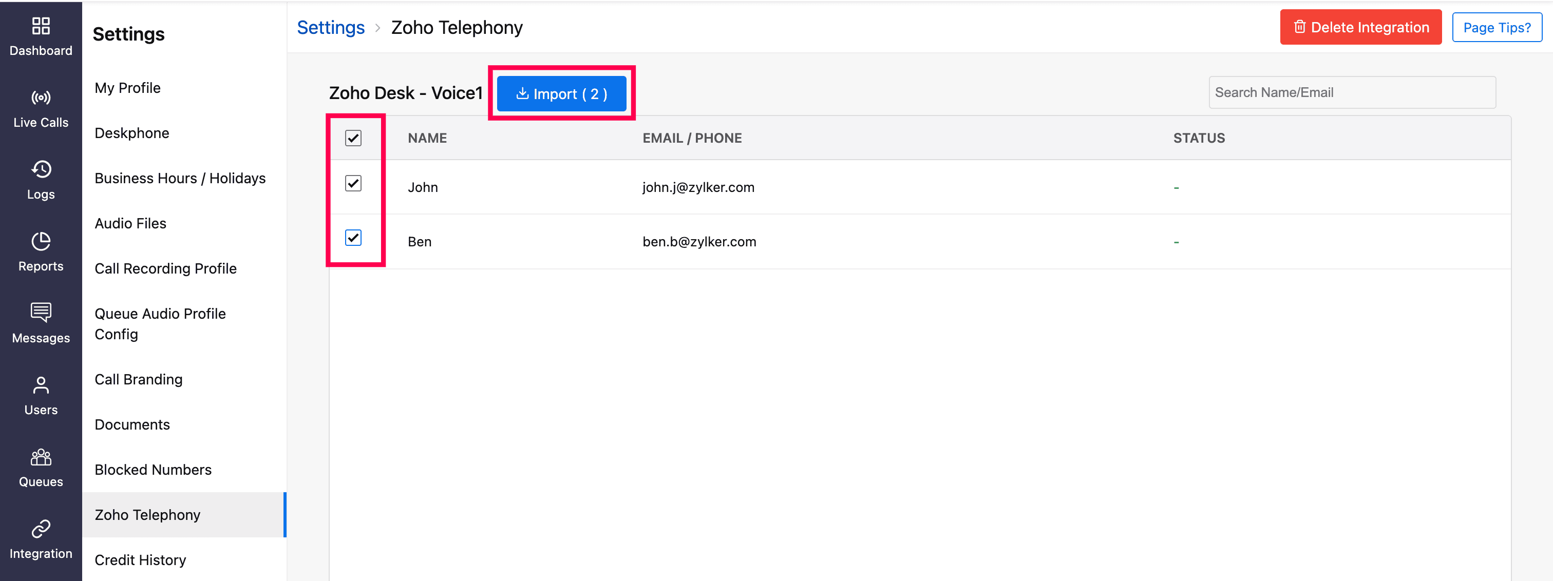 All your agents from the selected Zoho Desk portal will be listed. Select the users you want to import, then click the Import button.
