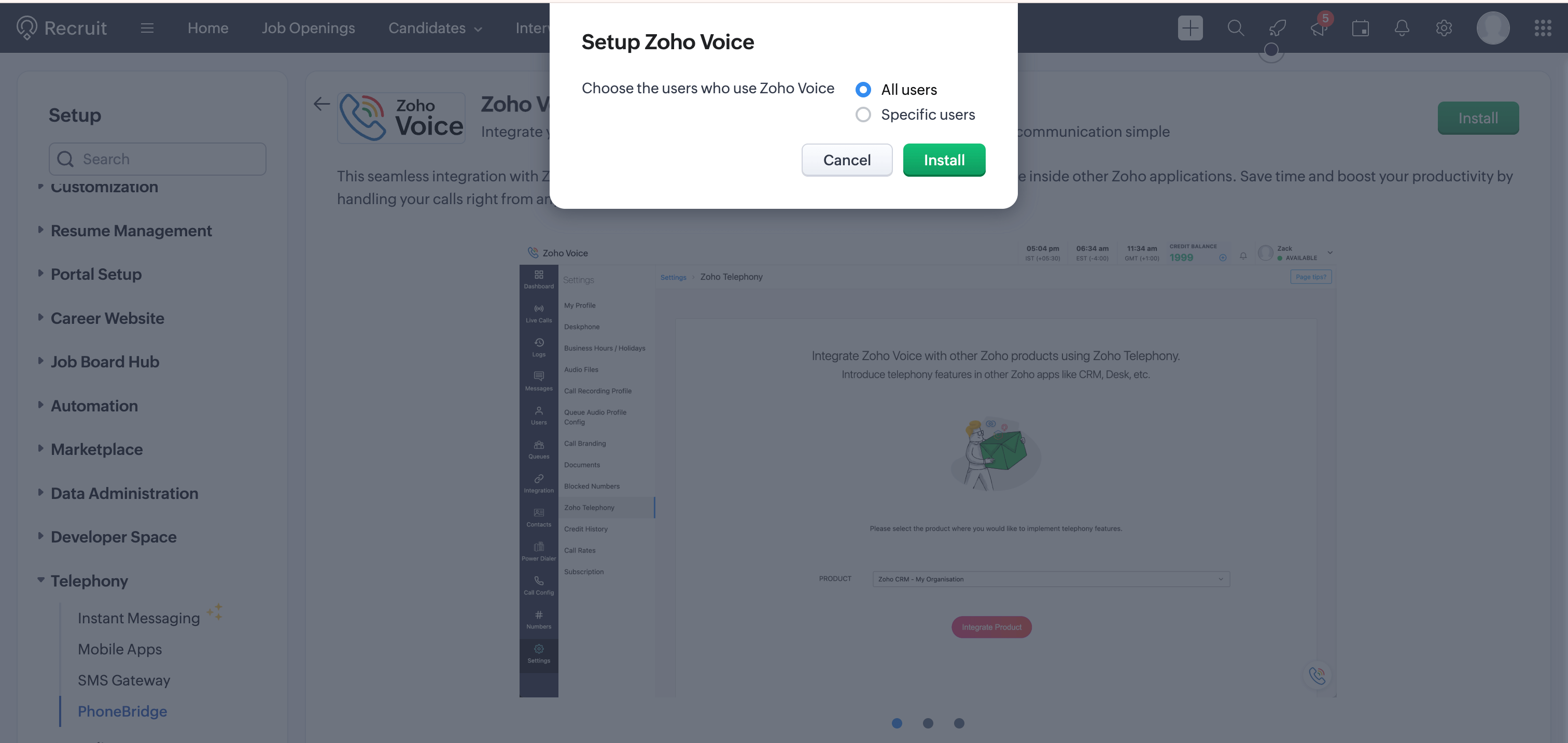 In the Setup Zoho Voice prompt, choose the type of users (All Users/Specific Users) to access Zoho Voice, and click Install.