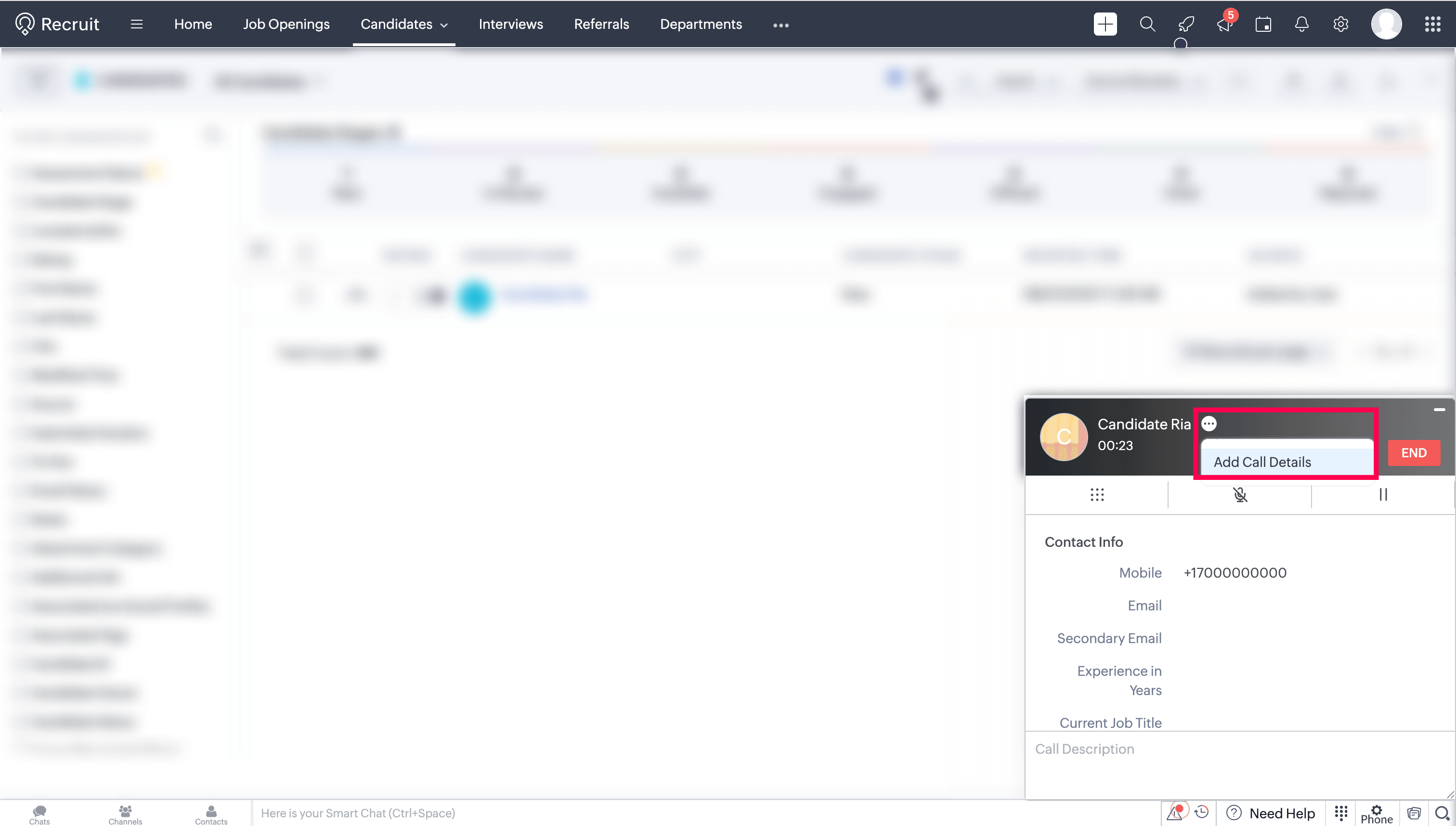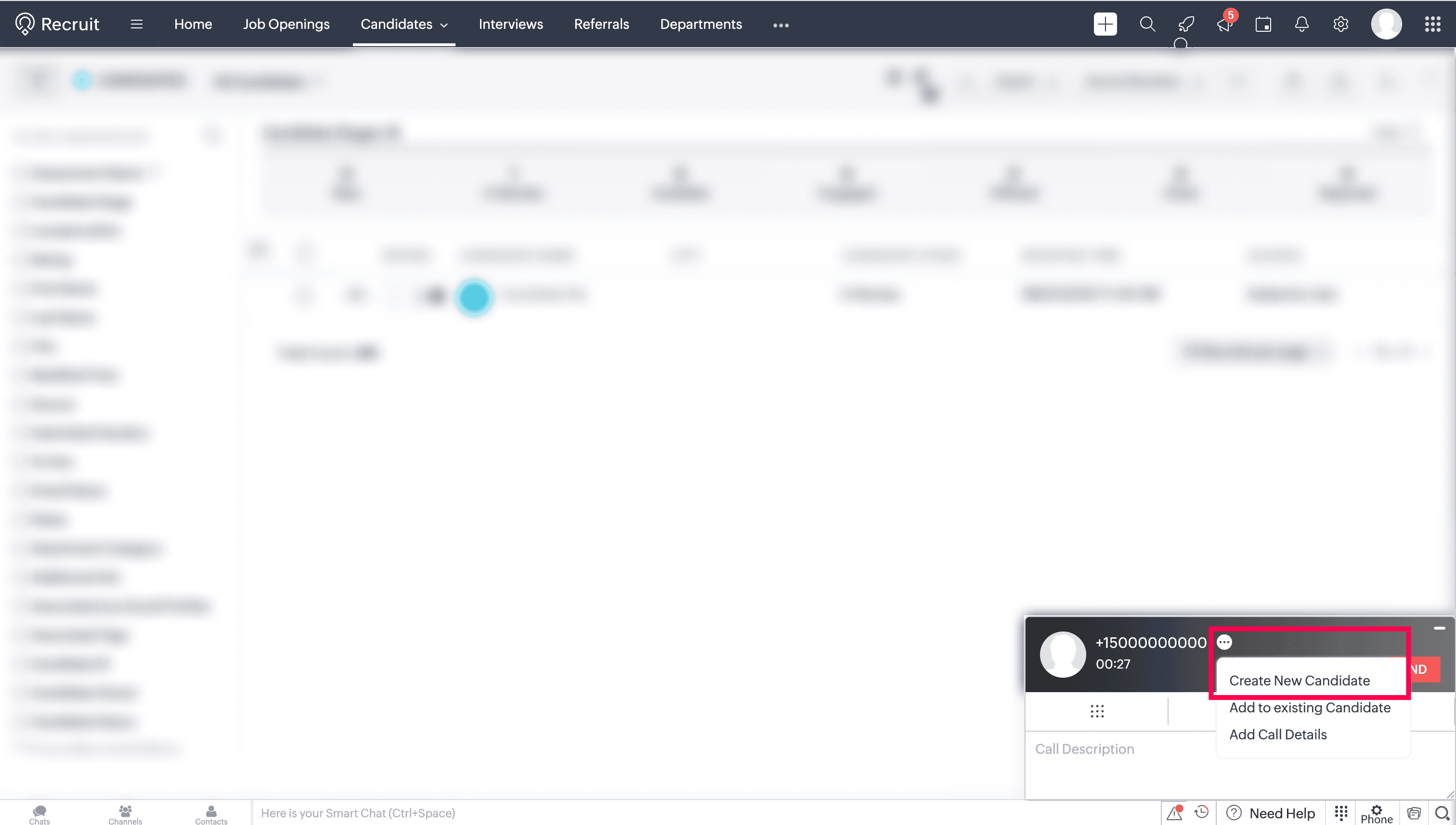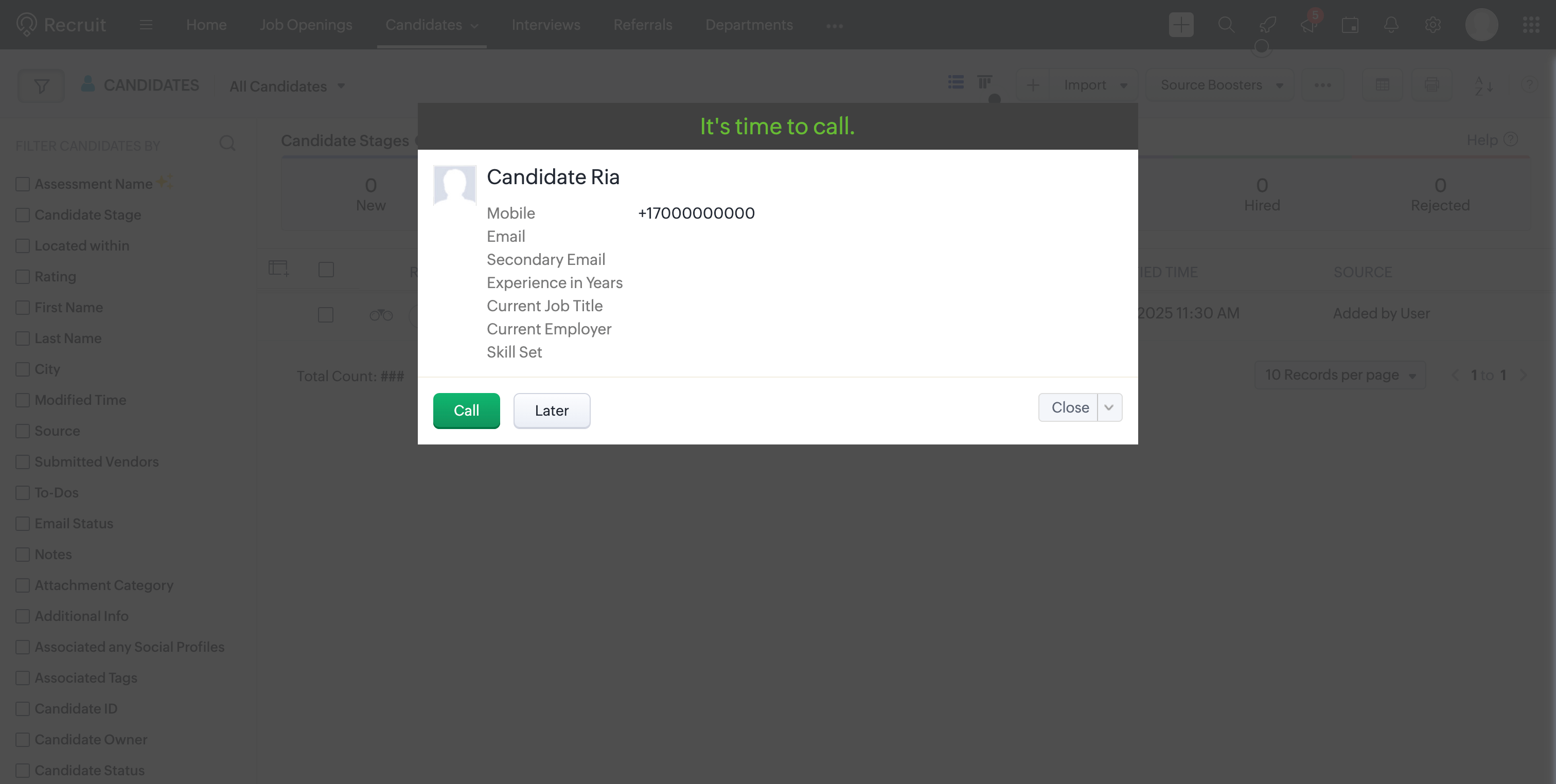 During or after a call, a new candidate can be created in Zoho Recruit.