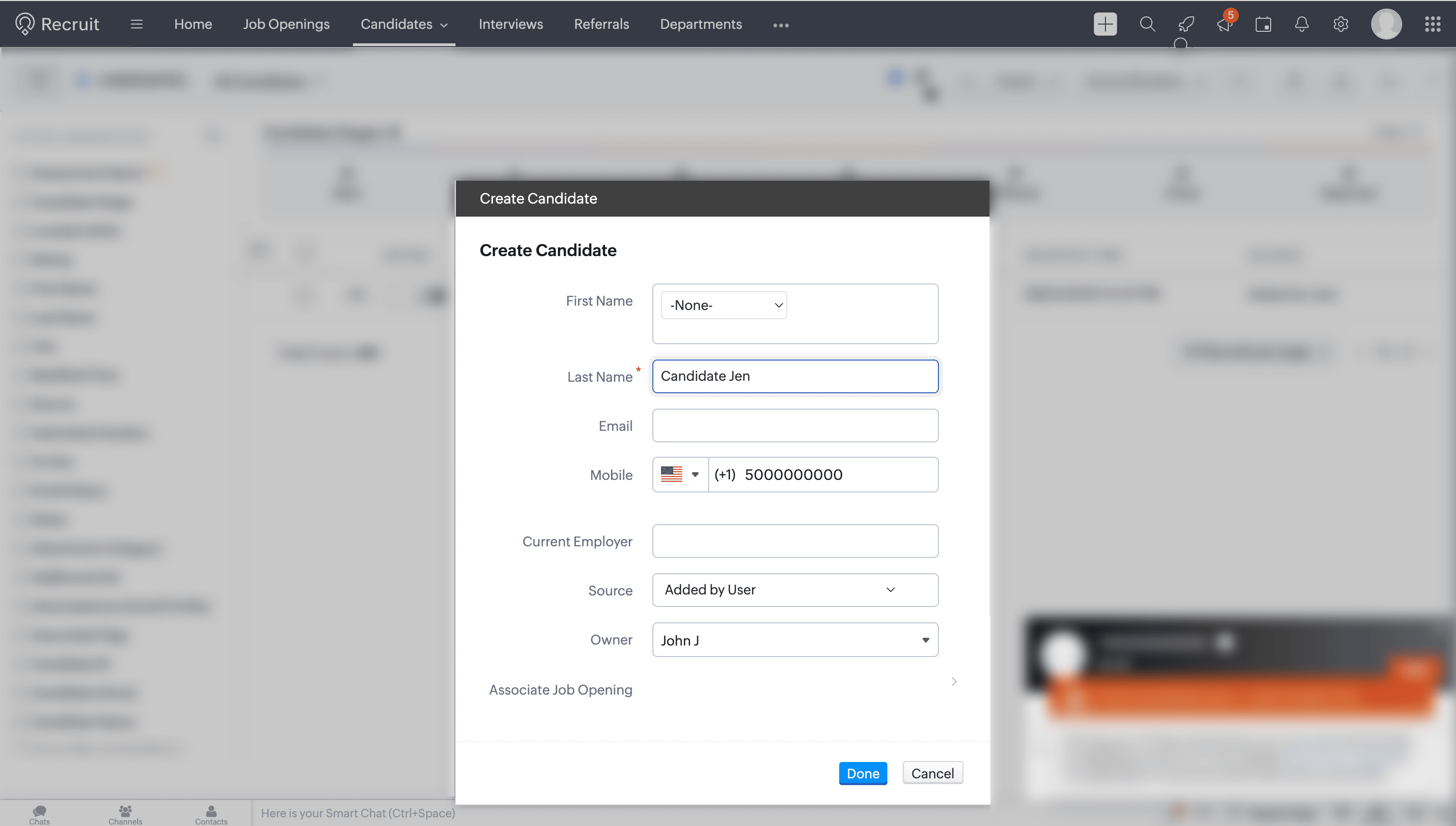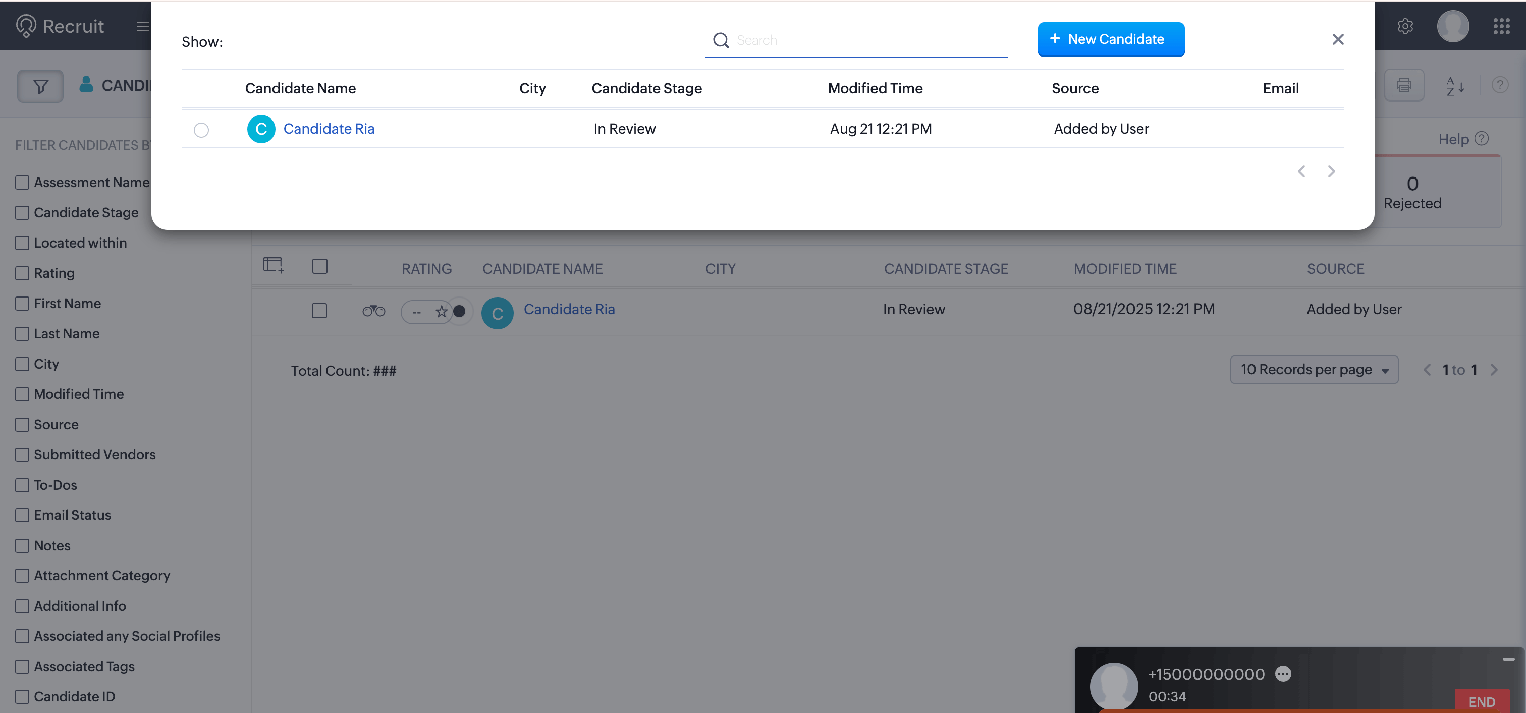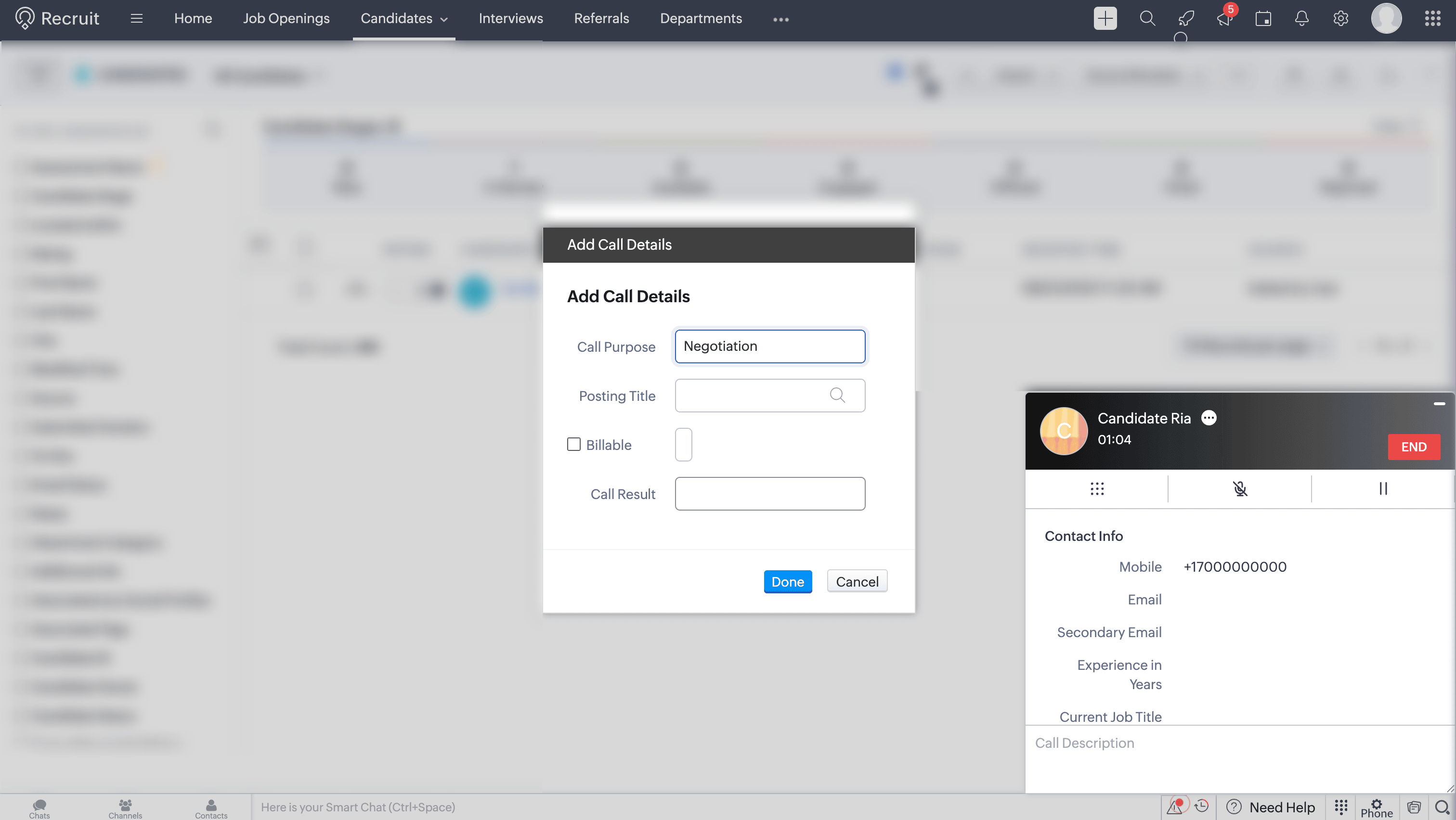 During or after a call, a new candidate can be created in Zoho Recruit.